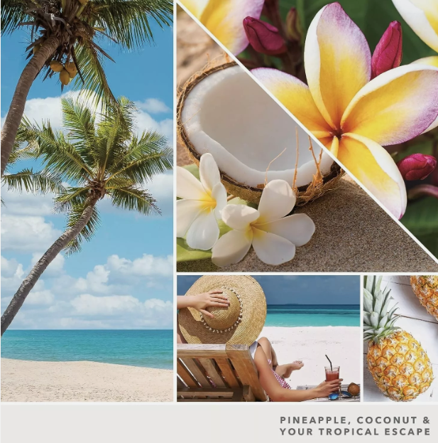 Coconut Beach: A taste of the tropics — warm coconut blended with pineapple and Tahitian vanilla Brushed-tin lid serves as a candle coaster Cotton wick, premium soy-wax blend provides a clean burn This is a Fruity fragrance. Inspired by a taste of the tropics — warm coconut blended with pineapple and Tahitian vanilla. Top notes: Salty Air, Pineapple. Middle notes: Fresh Coconut, Lei Blossom. Base notes: Airy Musk, Tahitian Vanilla. Top note is the initial impression of the fragrance, middle note is the main body of the scent and base is its final impression.