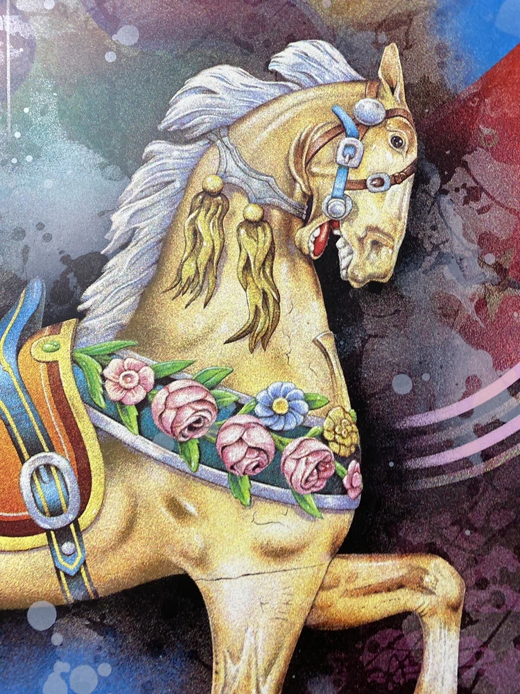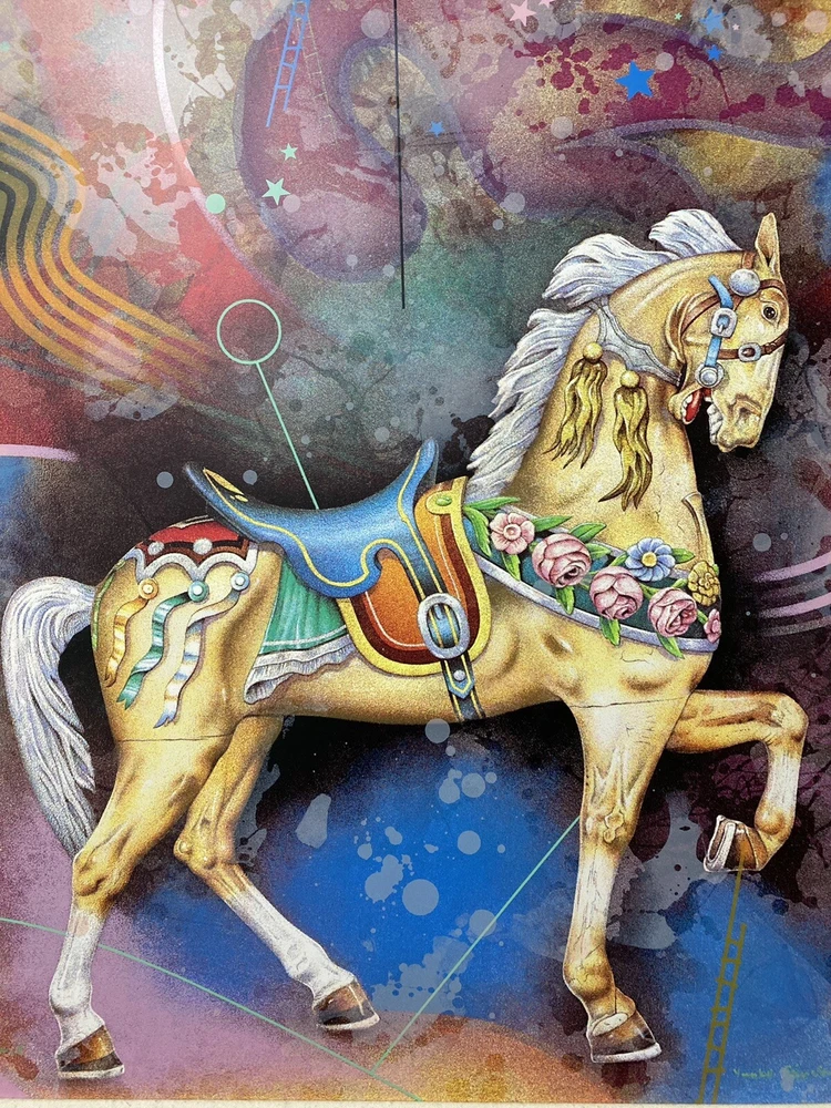 ARTIST: Yankel Ginsburg TITLE: Carousel MEDIUM: Limited edition lithography on board, no glass needed. Hand signed by the artist and numbered. SIZE: 36 x 40 1/2 framed. PRICE: $4000 Great condition. Asking below cost! Art was purchased directly from Yankel Ginsburg at his home studio. Ginzburg’s creations are unique, both his paintings and sculptures are images superimposed on each other, an intertwining of symbols and shapes, abstract and surrealistic and airbrush technique. Ginsburg has had numerous one man exhibitions around the world. His art is displayed in many museums, worldwide.