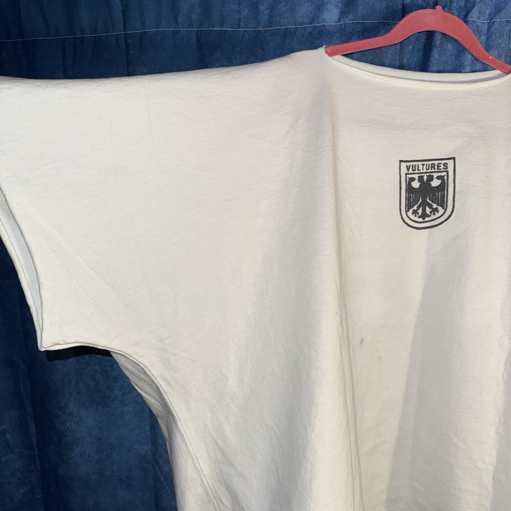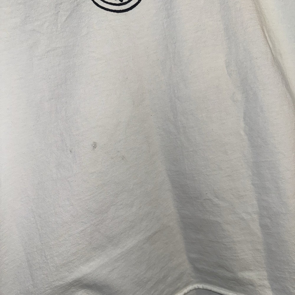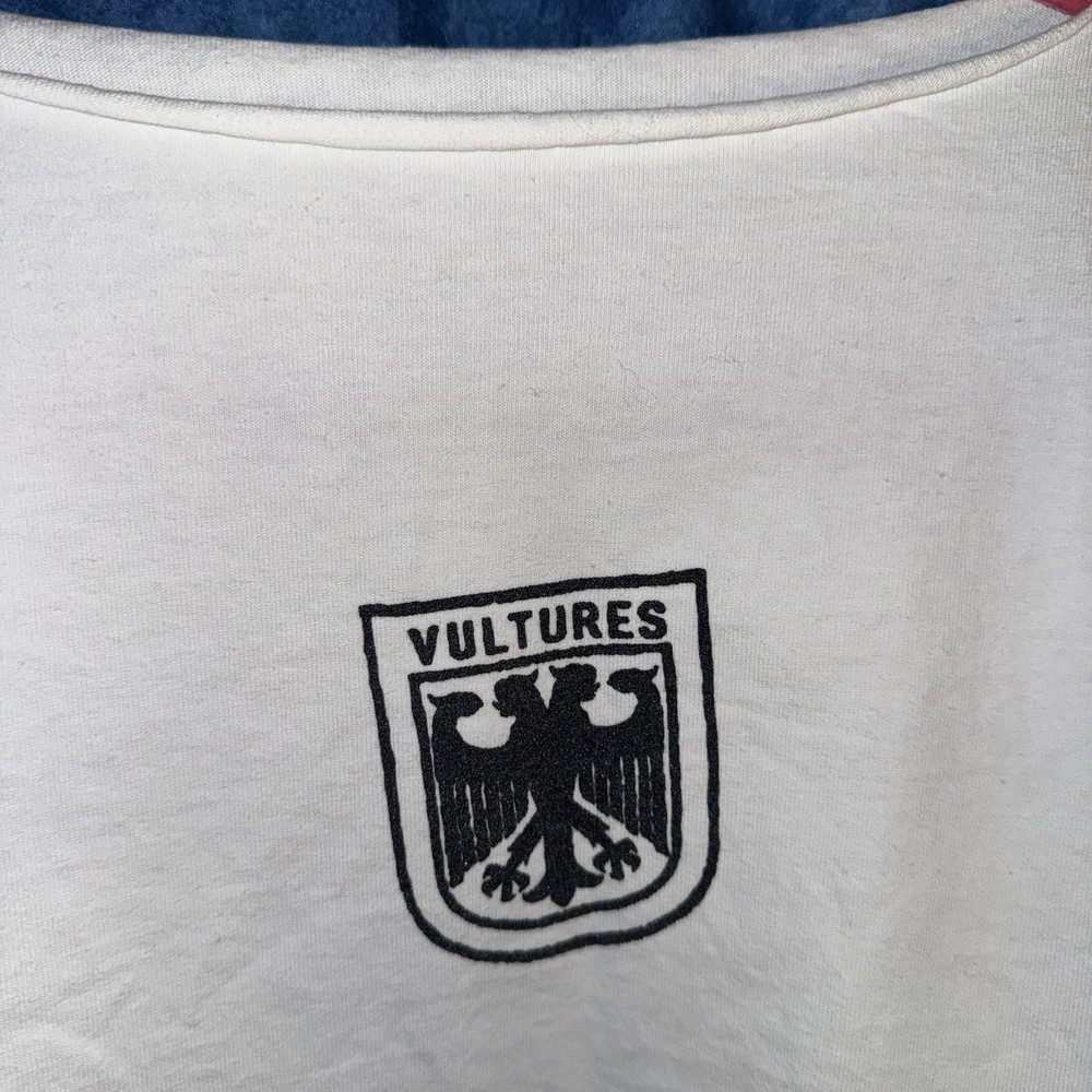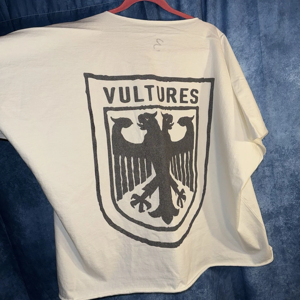 The Yeezy Vultures Box T-shirt in White and Black is a stylish and oversized graphic tee top designed for men in size 3XL. Made from 100% cotton knit fabric, this relaxed fit shirt features a logo accent and is machine washable. With a collarless design, this Yeezy tee is perfect for the Fall, Winter, and Spring seasons, making a bold statement with its graphic print and box theme.
