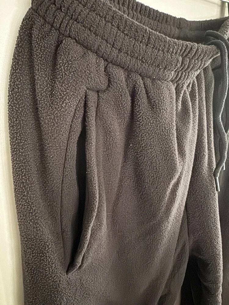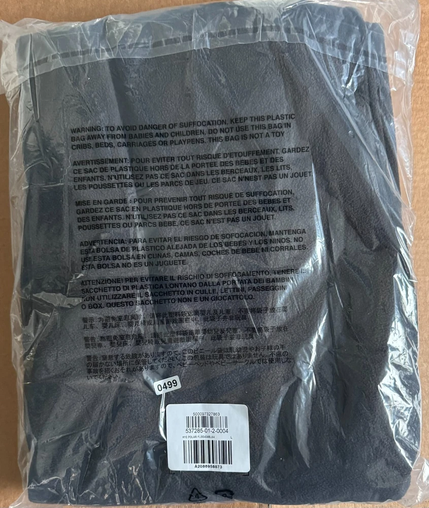 New in the bag with drawstring and zippers on the bottom. The Yeezy YZY x GAP H10 Polar Fleece Pants in black, size L, exude a designer-style created by Kanye West. These relaxed-fit sweatpants are made of a comfortable heavyweight fleece fabric blend of polyester and cotton, perfect for activities like gym training, track and field, or casual wear during the fall, winter, or spring seasons. The pants feature a straight leg design and are suitable for men looking for a fashionable and functional addition to their activewear collection.