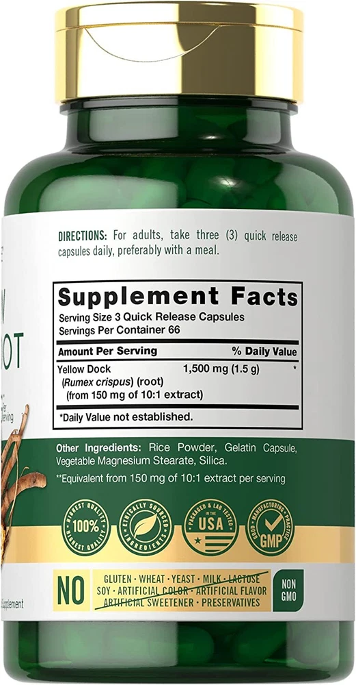 Supplementing with Yellow Dock Root: Yellow Dock, also commonly known as curly dock, is a wild traditional root herb and staple ingredient in Ayurvedic wellness practices. The roots, leaves, and seeds of this herb are where most of its nutritional value is derived. Yellow Dock Root contains naturally occurring Anthraquinones, organic plant compounds that are well known antioxidants. Traditionally, Yellow Dock was used to make herbal tea and other elixirs, but now is found in liquid tinctures, powder, capsules, and other bulk supplement forms for men and women around the world. Carlyle Yellow Dock Root: At Carlyle, our gluten-free and non-GMO Yellow Dock Root supplement is made using the finest source of herb mother nature can provide. Each serving offers the equivalent of 1,500 mg of Yellow Dock Root per serving in daily quick-release capsules for optimal support. Harness the power of this powerful root day with Carlyle’s 200-capsule supply! Carlyle Yellow Dock Root — Rooted in Wellness: Our expertise in sourcing the purest ingredients combined with advanced technologies makes us proud to deliver premium, honest supplements at the best value. Our Yellow Dock Root supplement is a testament to our commitment to excellence, made with powerful ingredients rooted in wellness. Thanks for choosing us in your pursuit of living healthy! Do not use this product if you are pregnant, nursing or if you have or have had kidney stones or an intestinal obstruction. If you are taking any medication or have any medical condition, consult your doctor before use. If any adverse reactions occur, immediately stop using this product and consult your doctor. Avoid this product if you are allergic to ragweed or daisy-like flowers. Not intended for use by persons under the age of 18. If seal under cap is damaged or missing, do not use. Keep out of reach of children. Store in a cool, dry place. >