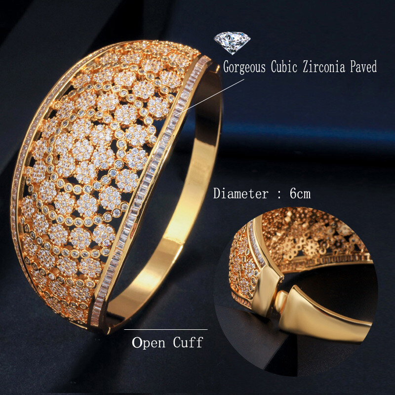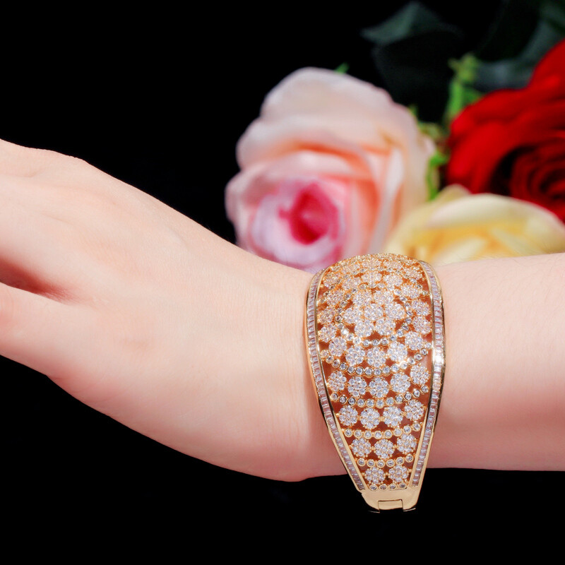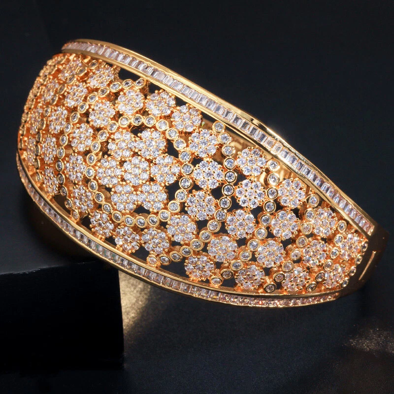 Yellow Gold Plated CZ Zircon Floral Hollow Wide Cuff Wedding Bracelet