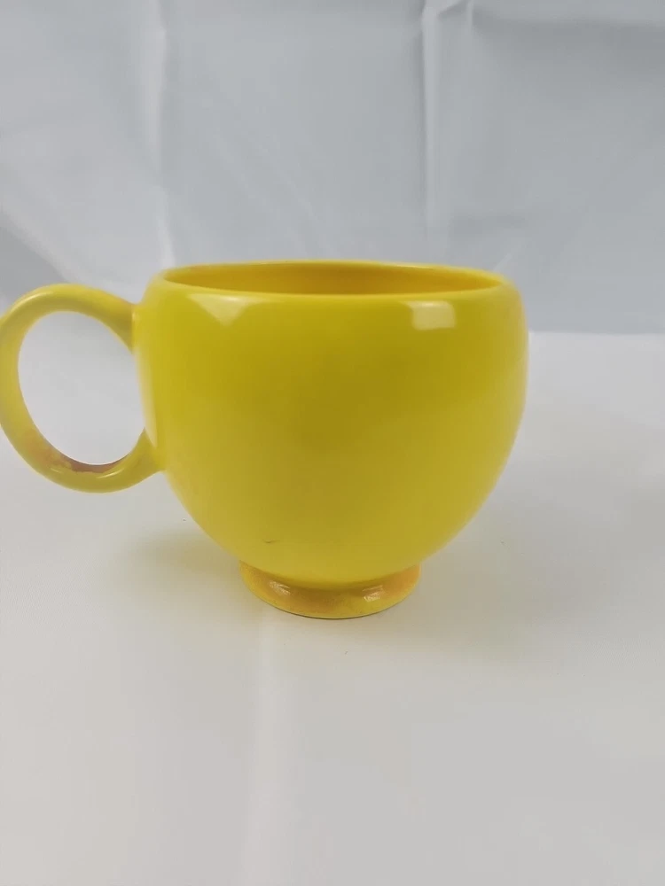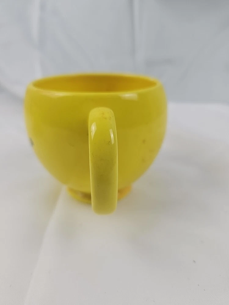 This Yellow Smiley Face Teleflora Coffee Mug is a 20 oz oversized planter or pen holder. Made of ceramic in a contemporary style, it features a round shape with a glossy finish. The mug has a 4.25" opening and measures 4" in height, with a yellow color and a happy theme. This unisex item is suitable for hot beverages and has a printed backstamp. It is a fun and cheerful addition to any home or office.