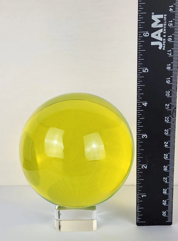 Add a little glow and personality to your desk or shelf with this 3.93" / 100mm Yellow Vaseline Uranium Glass crystal ball paperweight. The solid glass orb is completely round and will not sit on it's own. The base shown is not included. Under blacklight, it shines with a captivating green glow, bringing a fun and unique touch to any room. This piece pairs wonderfully with rustic, cabin, farmhouse, dark, witchy and cottagecore aesthetics — or just anyone who loves cool, glowing decor. Blacklight photo taken with 395nm blacklight but it will glow under any blacklight (395nm / 365nm). *Excellent condition! There are a few very tiny bubbles inside the glass. ***CAUTION - DO NOT ALLOW THIS TO BE STILL IN THE SUNLIGHT FOR LONG PERIODS OF TIME! Crystal balls can cause fires when in direct sunlight from light refraction. We recommend displaying indoors away from windows. *5
