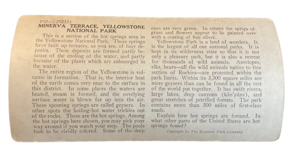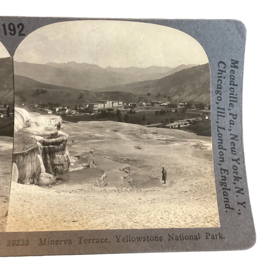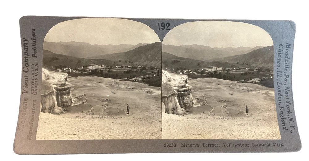 Features: NA Subject: National Parks, Yellowstone, Wyoming, Hot Springs, Minerva Terrace Production Technique: NA Original/Licensed Reproduction: Original Number of Items: 1 Type: Stereoview & Stereoscope Theme: Yellowstone Title: Minerva Terrace Yellowstone National Park Time Period Manufactured: 1900-1924 Year of Production: 1920 Brand/Publisher: Keystone View Co.