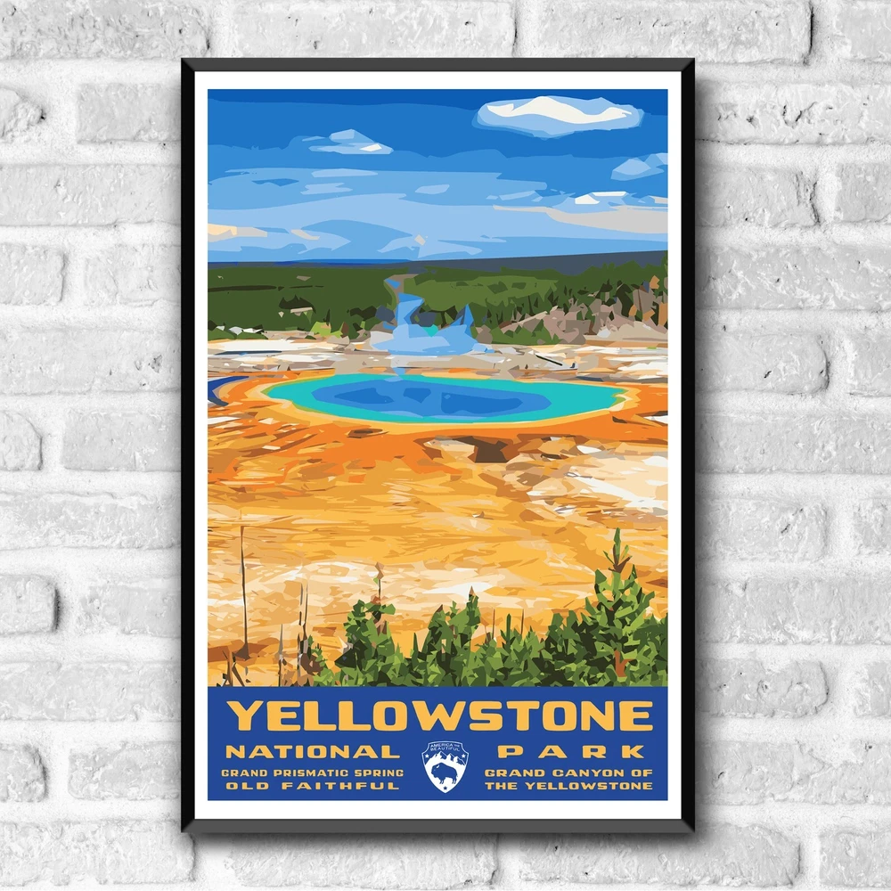 Yellowstone National Park WPA-Style Vintage-Style Travel Poster 8x10 - 12x18 - 18x24 - 24x36 / 4x6 Postcard The perfect poster for memories or travel inspiration! Decorate your living space with this beautiful Yellowstone National Park travel poster featuring Grand Prismatic Spring, a part of the Go See Design USA National Parks Collection. This premium poster is printed on high-quality, acid-free, 10 mil, 270 gsm satin poster stock. The 4x6 cards are printed on sturdy 14-pt. card stock. Postcards and 8x10 posters ship flat, while larger prints ship rolled in a tube. Postcards are blank-backed and are not postage-paid. Please note, the 12x18 version is pictured. Other sizes may show a slightly different crop due to live printing area. We can do custom sizes! If you want any size that is not listed, please message me and I will do my best to make that size available. The white border measures .5" in thickness on sizes 12x18 and up; the border is .375" thick on 8x10 posters and approximately .166" thick on postcards. INTERNATIONAL CUSTOMERS: Because of the way Ebay calculates shipping, the shipping price reflects the price of shipping the largest (24x36) size. If you order a smaller size, I will refund you the difference. Or you can contact me first to set up an item just for you, with the exact shipping price. I do combine shipping; if you have a large order to make, please message me in advance.
