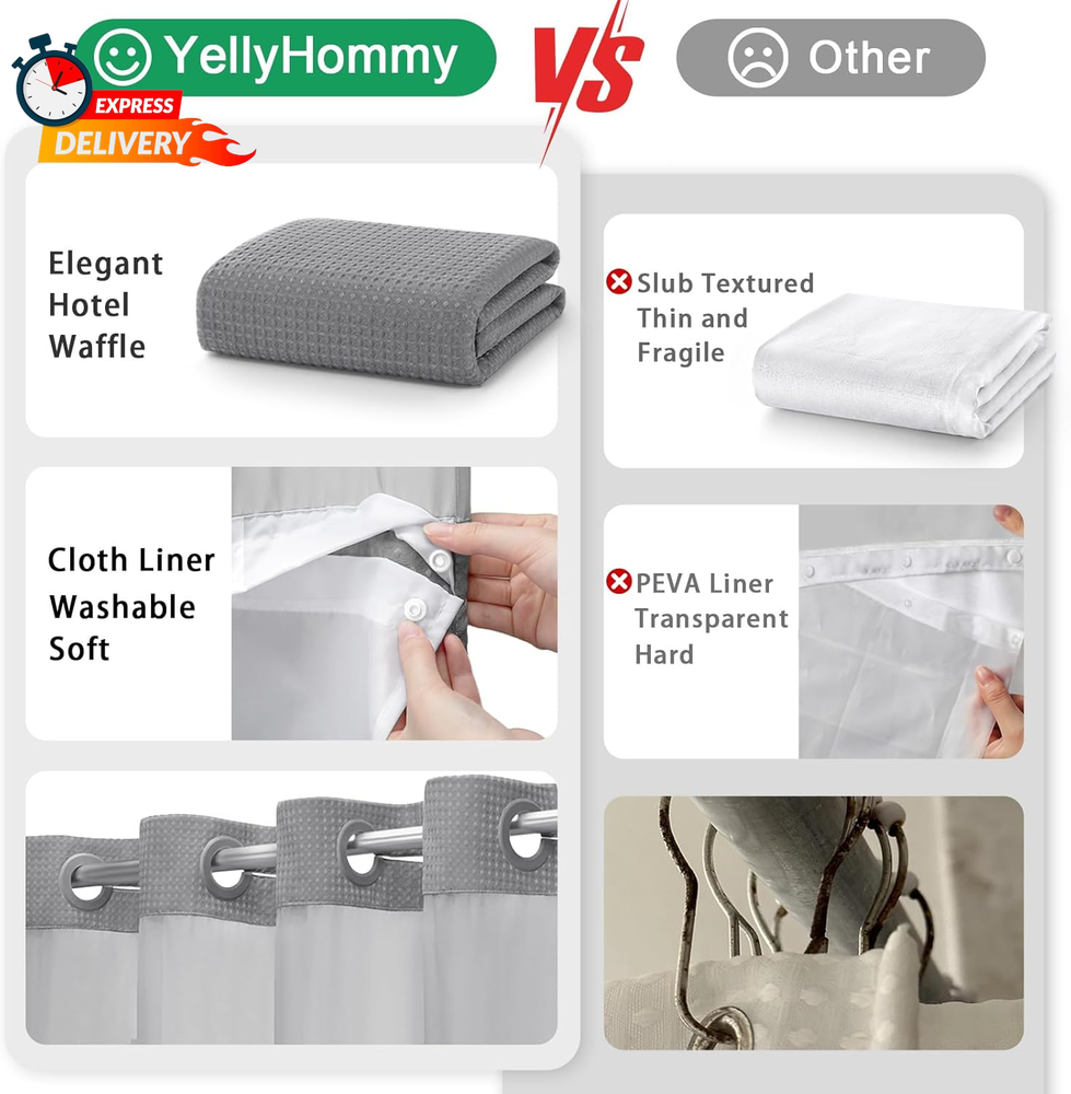 Store New Arrivals Add to Favorite View Feedback Contact Yellyhommy No Hook Shower Curtain with Snap in Liner Set Less Time Grey Waffle Shower Curtain for Bathroom 75" L X 72" W Gray Description Item model number DK-HUI-72*75 Style Hotel Pattern Waffle Weave Package Weight 0.81 Kilograms Theme Modern Opacity Sheer Unit Count 1.0 Count Room Type Bathroom Product Dimensions 75"L x 72"W Brand YellyHommy Material Polyester Top Style Grommet Model Name HUI-72*75 Seasons All Season Lining Description Water-repellent snap on/off fabric liner with bottom magnets Included Components Shower Curtain,Snap-in Fabric Replacement Liner,Built-in Hooks Closure Type Snap Curtain Form Shower Curtain Indoor/Outdoor Usage Indoor Water Resistance Level Water Repellent Item Weight 1.79 pounds Special Feature Snap-in Fabric Replacement Liner,Built-in Hooks,Mesh Top Sheer Window Hanging Method Grommet Color Grey Recommended Uses For Product Indoor Manufacturer YellyHommy Fabric Type Polyester Product Care Instructions Machine Wash Size 75"L x 72"W 【No Hook Shower Curtain Set】: Install in 20 seconds without the hassle of annoying and messy hooks, and no need to remove the rod! 【Removable Snap On/Off Liner】: The water-repellent snap on/off fabric liner is easy to remove, making it convenient for cleaning or replacement, with 2 bottom magnets on both corners; 【Top Sheer Window】: A mesh upper panel lets in light while maintaining privacy. You can look out of the top part to keep an eye on things outside the shower, such as your partner, pets, or the time etc; 【Hotel and Spa Vision】: This no hook waffle shower curtain with a snap-on liner set creates a hotel-inspired bathroom. You'll feel like you're pampering yourself at a hotel spa whenever you take a shower. You will love the fit of the shower curtain and the fact that it has an inner liner. The outer layer does a great job of wicking water to keep it dry; 【Dimensions】: This no hook shower curtain set is 72" (from left to right) x 75" (from top to bottom). It also comes with a replaceable fabric liner of 71"W x 55"L that can be easily cleaned by wiping it directly or by machine washing. Product description Upgrade your bathroom effortlessly with our waffle weave shower curtain. No hooks required, thanks to the unique "Split Rings" design. Enjoy privacy and natural light with the mesh top sheer window. Transform your bathroom today! Soft fabric outer curtain 1 Built-in Hooks 2 Waffle Weave Fabric 3 Water Repellent 4 Weighted Hem Polyester fabric inner liner 1 Water Repellent 2 Snap On/Off 3 Polyester Fabric 4 Bottom Magnet Compatible Replacement Liner Add to Cart Add to Cart Add to Cart Add to Cart Add to Cart Add to Cart Customer Reviews 4.6 out of 5 stars 5,139 3.7 out of 5 stars 41 3.7 out of 5 stars 41 4.6 out of 5 stars 5,139 4.6 out of 5 stars 5,139 4.6 out of 5 stars 5,139 Price $9.99 $ 9 . 99 $9.99 $ 9 . 99 $9.99 $ 9 . 99 $8.99 $ 8 . 99 $11.99 $ 11 . 99 $12.99 $ 12 . 99 Compatible with 75"L x 72"W shower curtain 75"L x 72"W shower curtain 75"L x 72"W shower curtain 75"L x 36"W shower curtain 81"L x 72"W shower curtain 87"L x 72"W shower curtain Material Fabric PEVA Plastic EVA Plastic Fabric Fabric Fabric Lining Color White Frost Clear White White White Size 55"L x 71"W 55"L x 71"W 55"L x 71"W 55"L x 35"W 59"L x 71"W 66"L x 71"W Material Soft 5 Star 3 Star 4 Star 5 Star 5 Star 5 Star Waterproof 4 Star 5 Star 5 Star 4 Star 4 Star 4 Star Transparency 3 Star 3 Star 5 Star 3 Star 3 Star 3 Star Machine Washable ✔ ✘ ✘ ✔ ✔ ✔ What is the material of the shower curtain? The shower curtain is made of waffle curtain and fabric liner curtain that feels very soft and silky. It is also machine washable and quick-drying. Does the shower curtain have hooks? Yes, this shower curtain is build in split rings, no need with hooks. How to clean the shower curtain? Remove the fabric inner curtain and wash it directly, it will dry quickly. How does the snap-in liner work? The snap-in liner is designed to be easily removed from the shower curtain for cleaning or replacement. It snaps into place using small plastic snaps that are attached to the shower curtain. ABOUT US We offer the best prices around on high quality products. Our E-store includes media such as books, movies, music and games while offering electronics, toys, sporting apparel, clothing, tools, general home, garden items and more. SHIPPING We are always working hard to ensure your package arrives as soon as possible. Please understand that some factors like weather, high postal traffic, and the performance of shipping companies are outside of our control. We offer free shipping to the lower 48 states and ship within 2 business days of payment, usually sooner. We do not accept P.O. Boxes. Please provide a physical address. For shipping outside of the continental USA, we only use eBay's Global Shipping Program.The item is shipped to KY and then sent to the rest of the world. International customers are responsible for all duties and taxes. Continue to check out in order to calculate costs for shipping the item to your country. Messages regarding eBay's Global Shipping Program MUST be directed at eBay EXCLUSIVELY. RETURNS We offer a 30-Day Return Policy on items which you are not completely satisfied with. You have the option for a full-refund or an exchange of the item. No returns are available on items shipped outside of the USA. PAYMENT We accept PayPal. CONTACT US This page content is yet to come Please ad us to your favorite seller and visit again later Thank You CUSTOMER SATISFACTION We try our very best to make sure every customer is completely satisfied. If there's a problem, message us! We're happy to help. WE ACCEPT Copyright © 2021 AutoDS. | All Rights Reserved