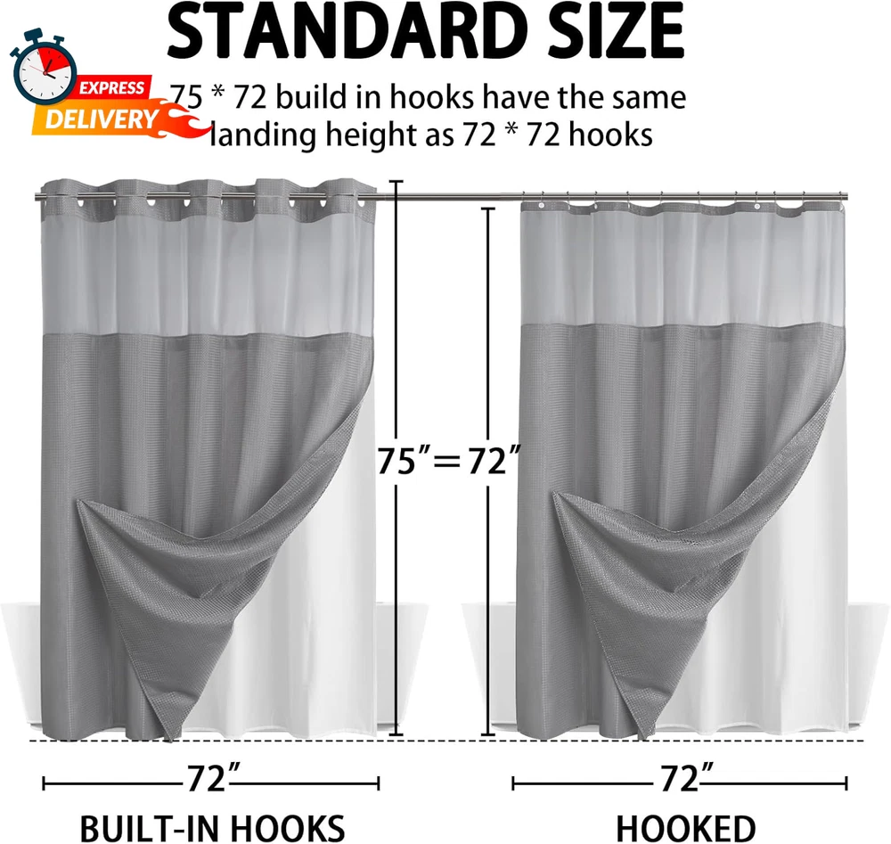 Size: 75"L x 72"W Product Dimensions: 75"L x 72"W Product Care Instructions: Machine Wash Model Name: HUI-72*75 Recommended Uses For Product: Indoor Closure Type: Snap Top Style: Grommet Color: Does not apply Lining Description: Water-repellent snap on/off fabric liner with bottom magnets Seasons: All Season Material: Does not apply Type: Does not apply Unit Count: 1.0 Count Water Resistance Level: Water Repellent Item Weight: 1.79 pounds Special Feature: Snap-in Fabric Replacement Liner,Built-in Hooks,Mesh Top Sheer Wi Room Type: Bathroom Pattern: Waffle Weave Style: Hotel Indoor/Outdoor Usage: Indoor Opacity: Sheer Curtain Form: Shower Curtain Theme: Modern gtin13: 313034078045 Included Components: Shower Curtain,Snap-in Fabric Replacement Liner,Built-in Hooks Hanging Method: Grommet Item model number: DK-HUI-72*75 Package Weight: 0.81 Kilograms UPC: 313034078045 Manufacturer: YellyHommy Brand: YellyHommy Fabric Type: Polyester