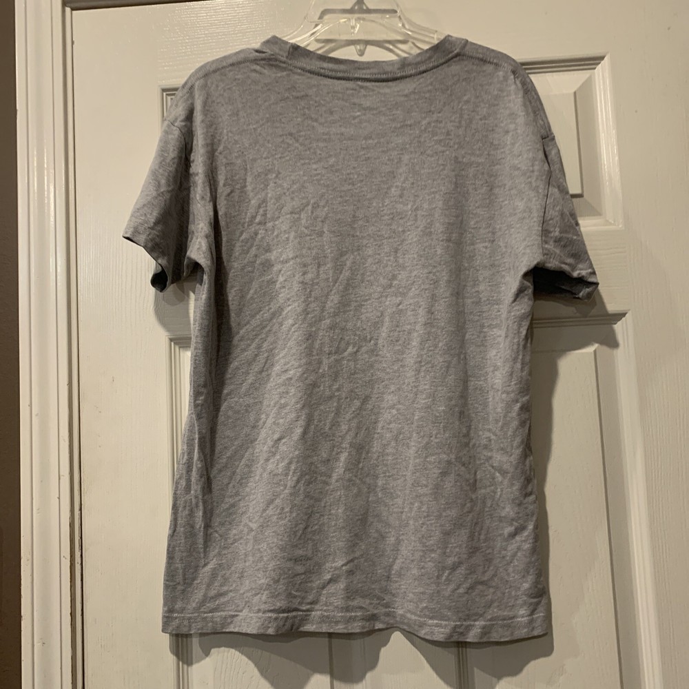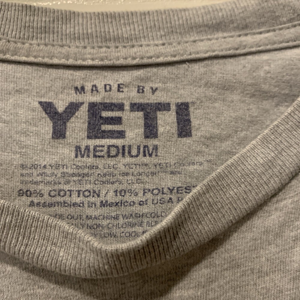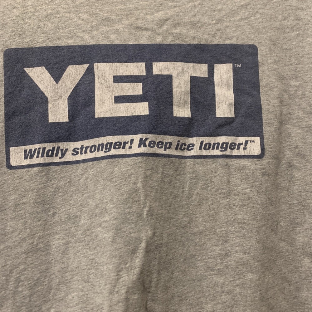 This is a Yeti men's gray T-shirt in size M with short sleeves and a crew neck. It is made of a cotton blend material and features the slogan "Wildly Stronger Keep Ice Longer." The T-shirt is designed for a regular fit and is not vintage in style.