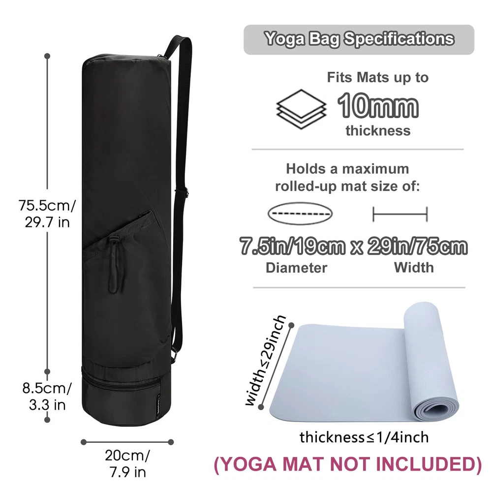 【Perfect Size】 Our New Yoga Mat Bag full dimensions: 31"L x 7.5" Diameter,which can hold yoga mat size up to 69"L x 23"W x 2/5"(10mm)Th (23" wide and 7" in diameter when rolled up). patent pending (YOGA MAT NOT INCLUDED) 【Stylish Wet Pocket Design】1 zip waterproof Bottom Wet Pocket which height 3.2-inch on bottom. It can hold sports towels and sports yoga pants, or other personal essentials like yoga straps, towels, travel-size convenience kit etc (YOGA MAT NOT INCLUDED). 【2 Multifunctional Side Pockets】Exterior features 1 front drawstring roomy pocket for water bottles, umbrella, rope skipping or other sports accessories. 1 exterior side zip small pocket (length 7.8-inch) for quick storage of your , keys, wallet, IDs, essentials, keeps your valuables close & secure (YOGA MAT NOT INCLUDED). 【Easy to Carry】 Widened shoulder straps & Easy adjustable shoulder strap(max length 47-inch) design is suitable for different heights of women and men. It can be carried across your body or over-the-shoulder. Free your hand and be more convenient (YOGA MAT NOT INCLUDED). 【Quick Access】The quick-open drawstring make you grab your mat in a flash whether you’re carrying your mat & essentials to class, or a yoga training trip (YOGA MAT NOT INCLUDED).
