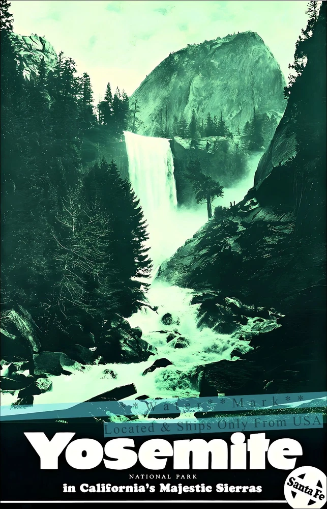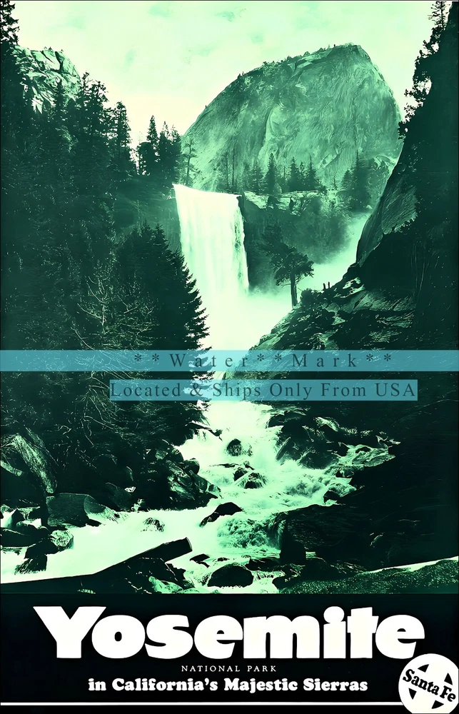 Yosemite National Park 1938 Featuring Waterfall. A Santa Fe Railroad Advertisement Retro postcard-style image of Yosemite National Park, highlighting a majestic waterfall and lush forest scenery with iconic Santa Fe branding. . Vintage Poster Print Retro Style Restored Art ***We offer Free US Postage or Reduced Postage for Canada & Worldwide. **No charges for additional prints worldwide. ***These are not framed or stretched or mounted NOTE:**Delivery dates shown are only "Suggested" Order Early To Avoid Post Delay Dramas **Read Please: The print looks best with a nice mat (passe - partout or passepartout ) and frame. These prints are the exact proportion as the original and will not be stretched to fit the paper or canvas...this would cause a distorted print The image will be the exact aspect ratio as per the original poster, so there might be more white on the top and bottom, or side to side. Options available..use the drop-down menu * Watermark will not be on your image. *Cloth Canvas an artist canvas used also in museums and art galleries *Photo Gloss Paper is a high-quality Professional Photo paper *Matte Photo Paper is a great solution if you do not want a Gloss, this paper is great with colors *Luster Photo Paper this photo paper is neither glossy or matt. Glossy paper has a smooth texture, luster paper is slightly textured. This option is a good choice for something in between Metallic, Photo Gloss and Matte *Metallic Pearlescent Photo Paper is a very high-quality paper with a Pearlescent sheen, a glossy finish, and unique metallic appearance, these prints have extra visual interest and depth. This paper uses a combination of film laminate layers that produce striking, dimensional, lasting images on an ultra-bright background. The effect is sometimes described as "chrome on paper." This is NOT a metal plaque, it is a photo paper This poster print will be shipped in a sturdy container. We will ship usually within 24 business hours of payment, except for weekends or US Holidays If there is a question, please do contact me All is done to send you the best quality poster image. Don't forget to check out the Sales. There is a great Buy 3 Get 1 Free Offer!! Shipped with no extra postage..Worldwide! There are a variety of reasons why the images on your monitors don't match each other. The simplest is that each monitor is different; even monitors with the same model won't have colors that match up perfectly We are located and ship only from the USA The art is not AI generated, these are restored prints from originals