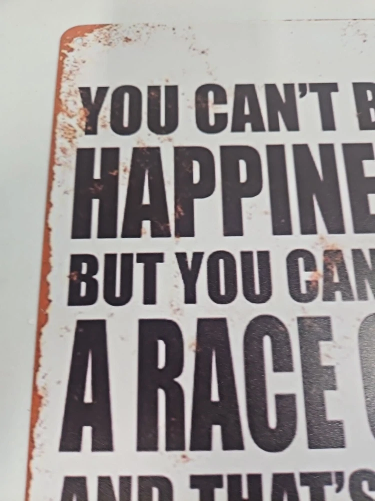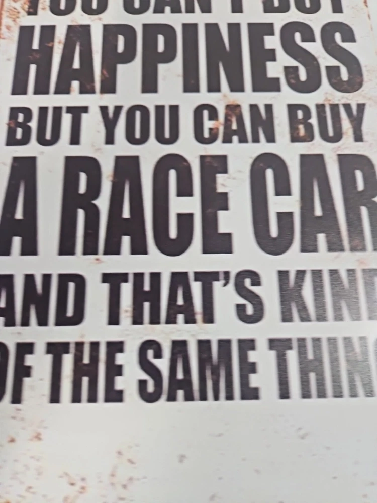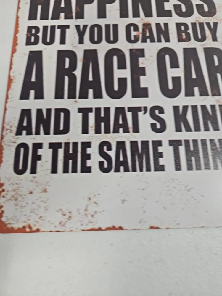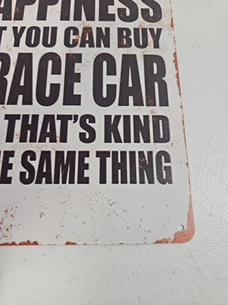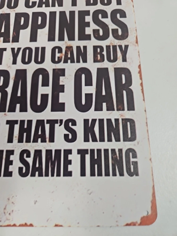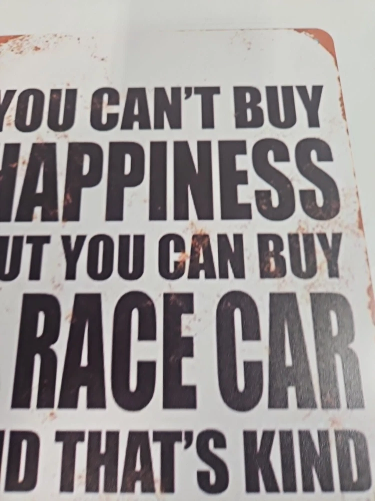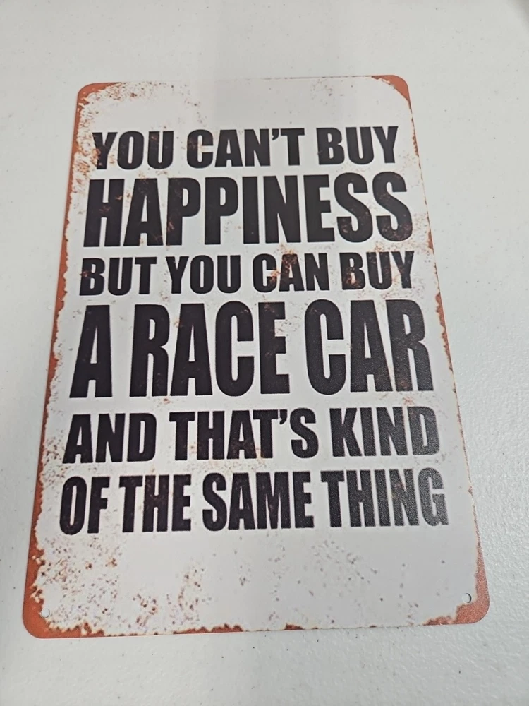 Add a touch of rustic charm to any space with this decorative metal sign. The rectangular shape and 8x12 size make it a medium-sized piece that can be hung or wall-mounted in a vertical orientation. The sign features a race car subject and the words "You Can't Buy Happiness But You Can Buy A Racecar" in a rustic/primitive style. Crafted from high-quality metal, this sign is durable and long-lasting. Its hanging and wall-mounted features make it easy to display in any room, including the garage or outdoors. The sign also has a decorative rusted look that adds to its rustic charm.