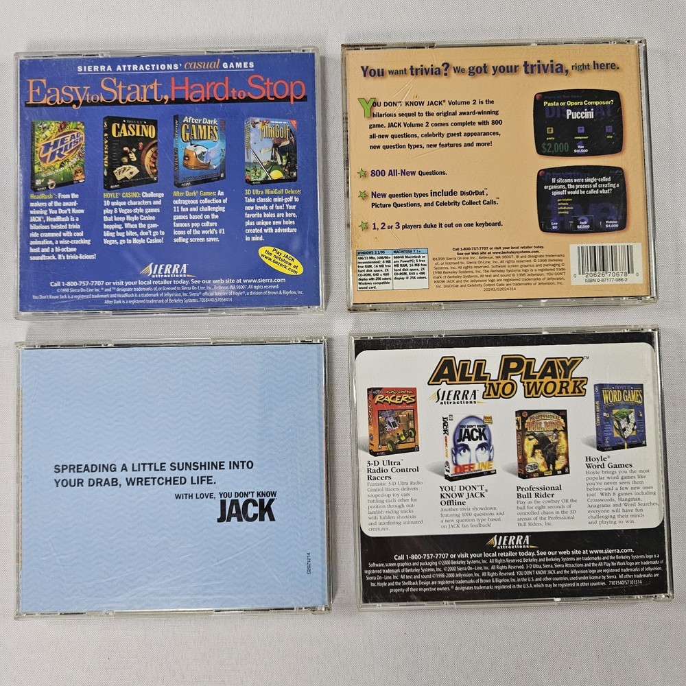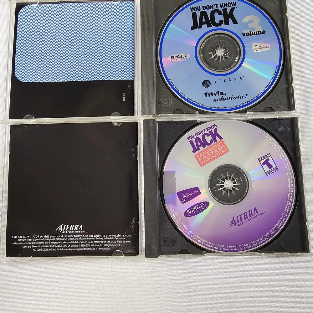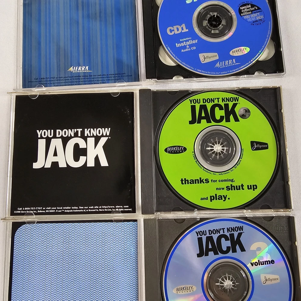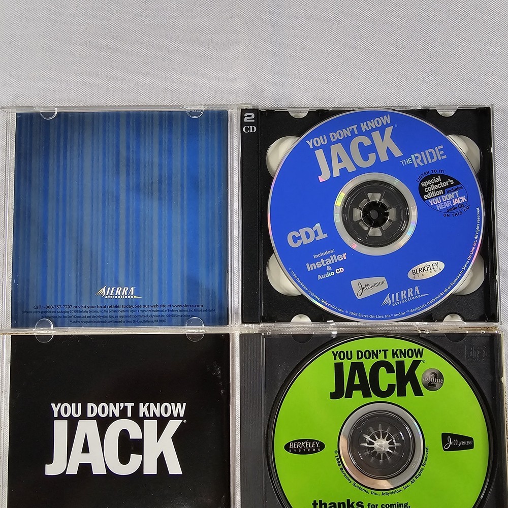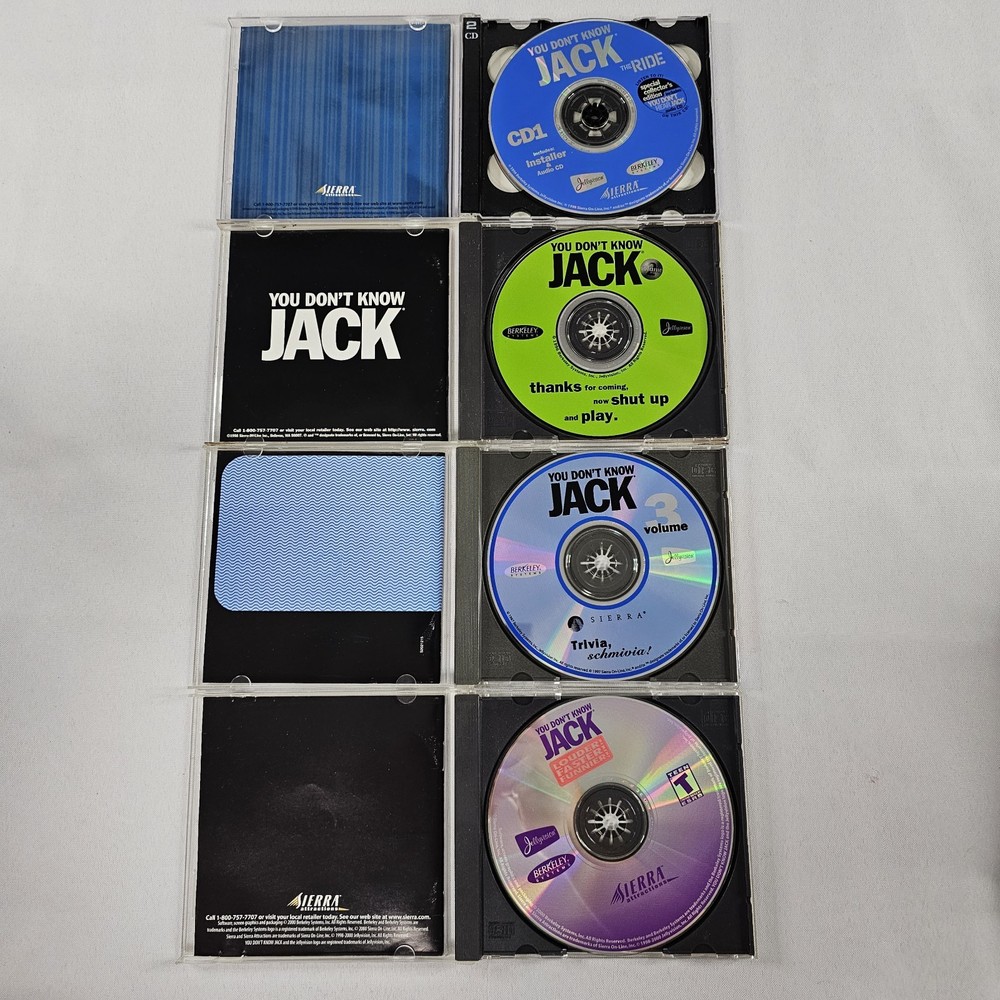 You Don’t Know Jack Louder! Faster! Funnier! RARE PC CD Rom Game + Volumes 2, 3, And 4. All Complete And In Good Condition. Please Check All Pictures Closely For A More Detailed Visual Description. Ships Out Free Within One Business Day.