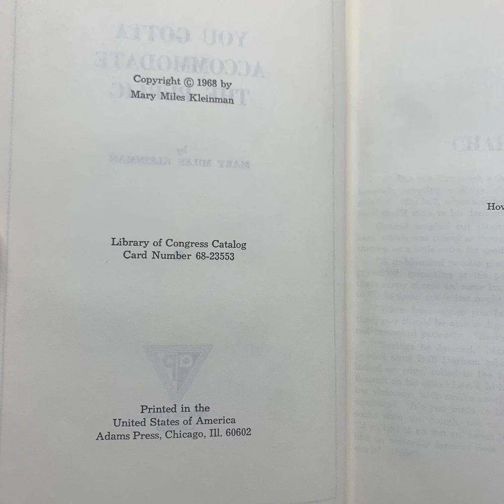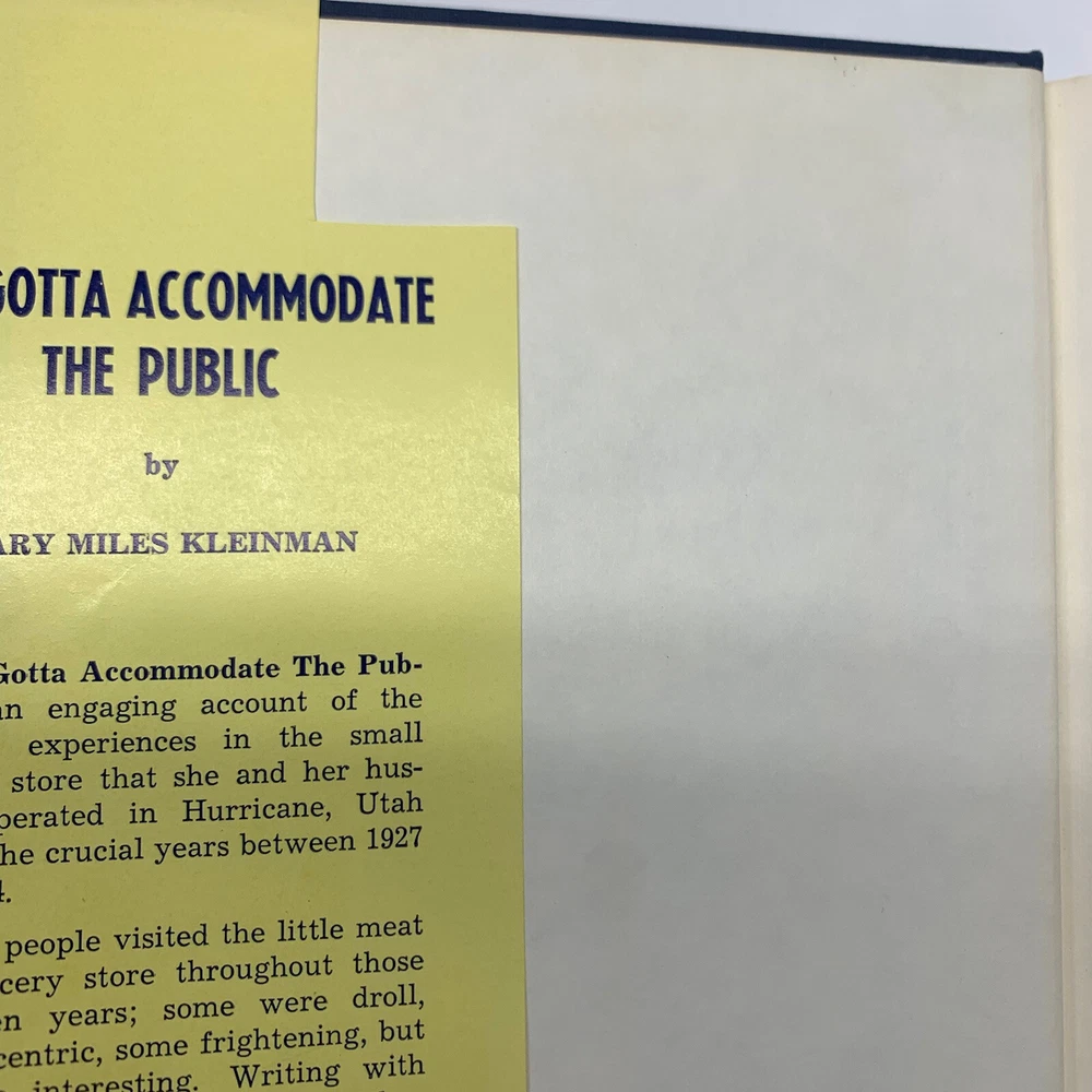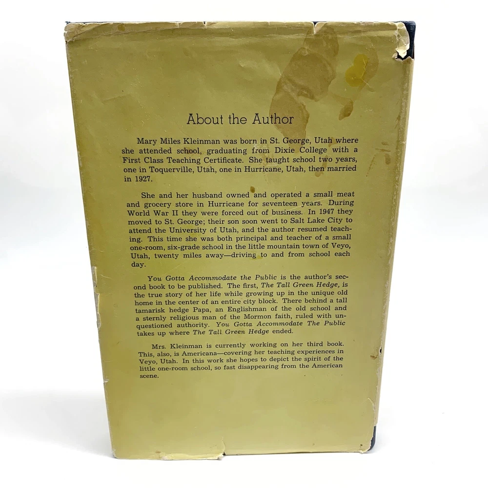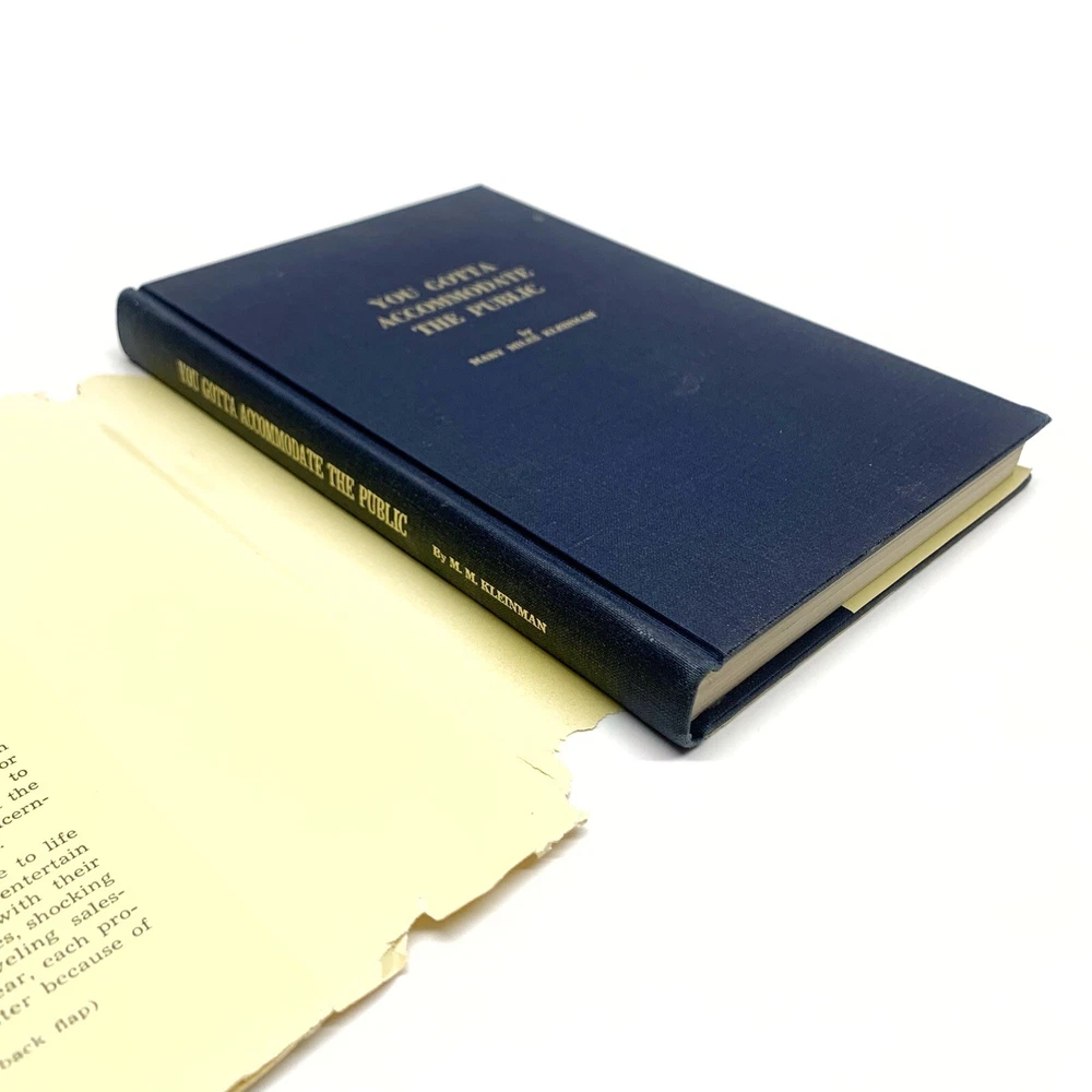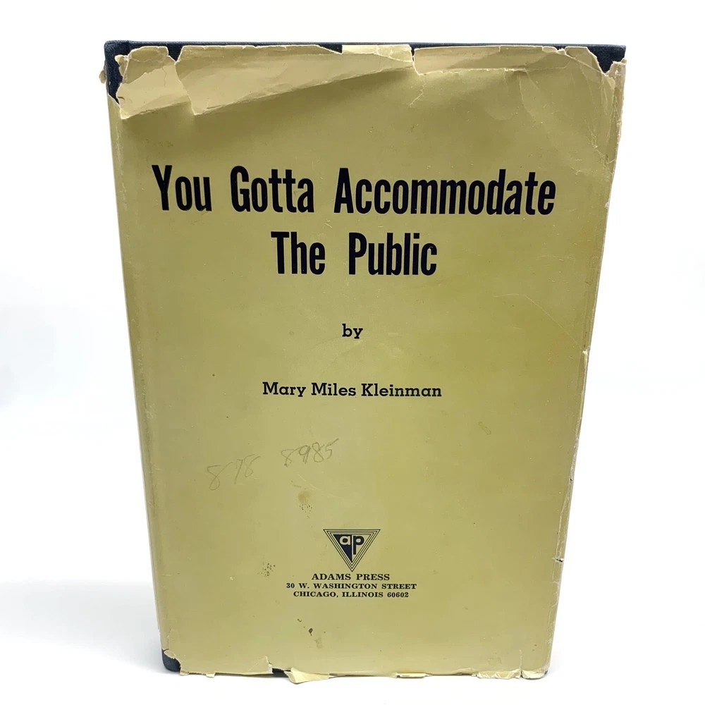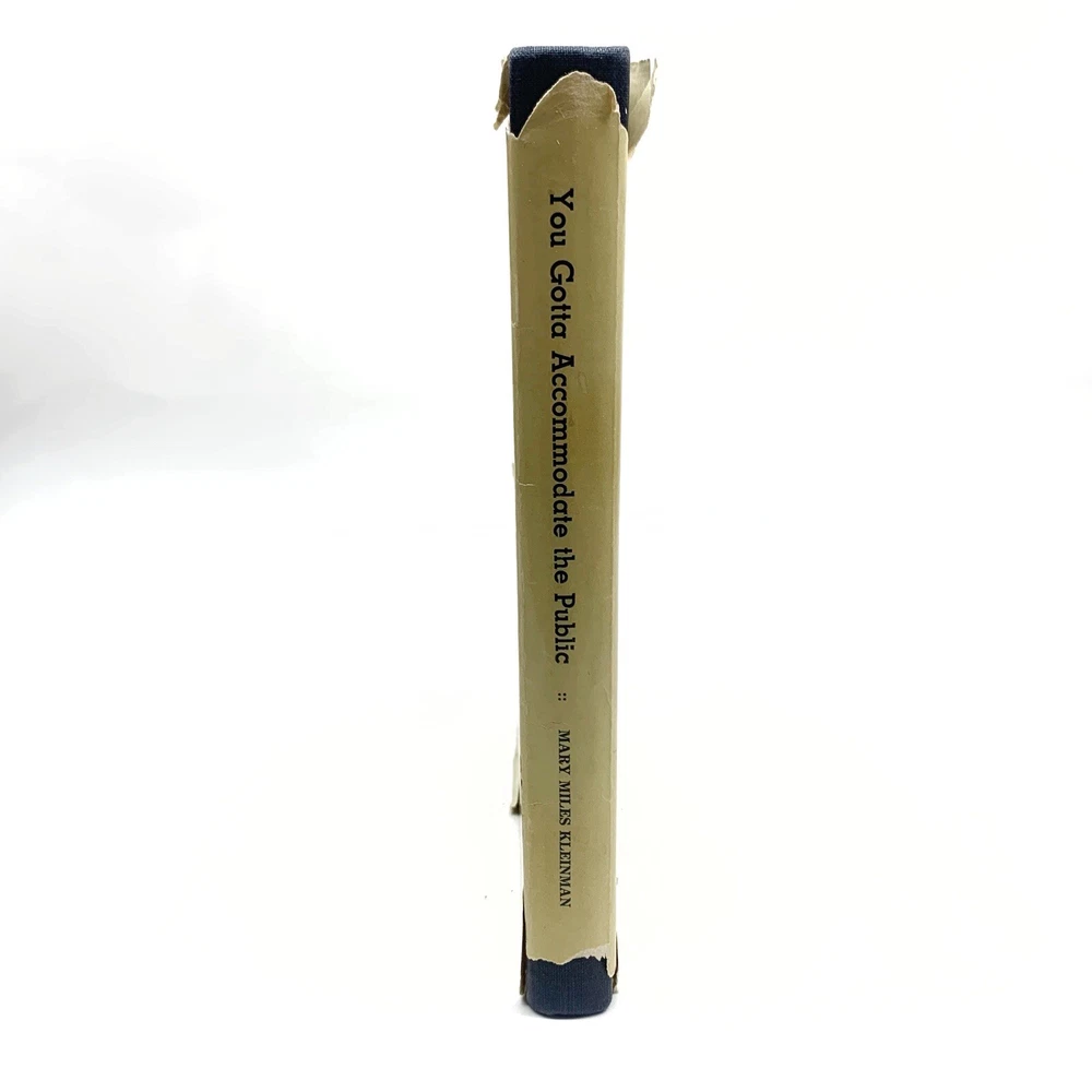 You Gotta Accommodate the Public by Mary Miles Kleinman Hardcover 1968 RARE. *Pre-owned and in acceptable condition. Dust jacket has major scuffs, wear and tears visible. There is writing on the cover/dust jacket. Writing of the previous owners name on the first page. Dust jacket front corner flap where the price was has been cut off. Please see all photos and examine them carefully as they are part of the description. Photos provided is of the actual item you will be receiving. *Shipped with USPS Media Mail. Thanks for looking! Check out my store for more items!