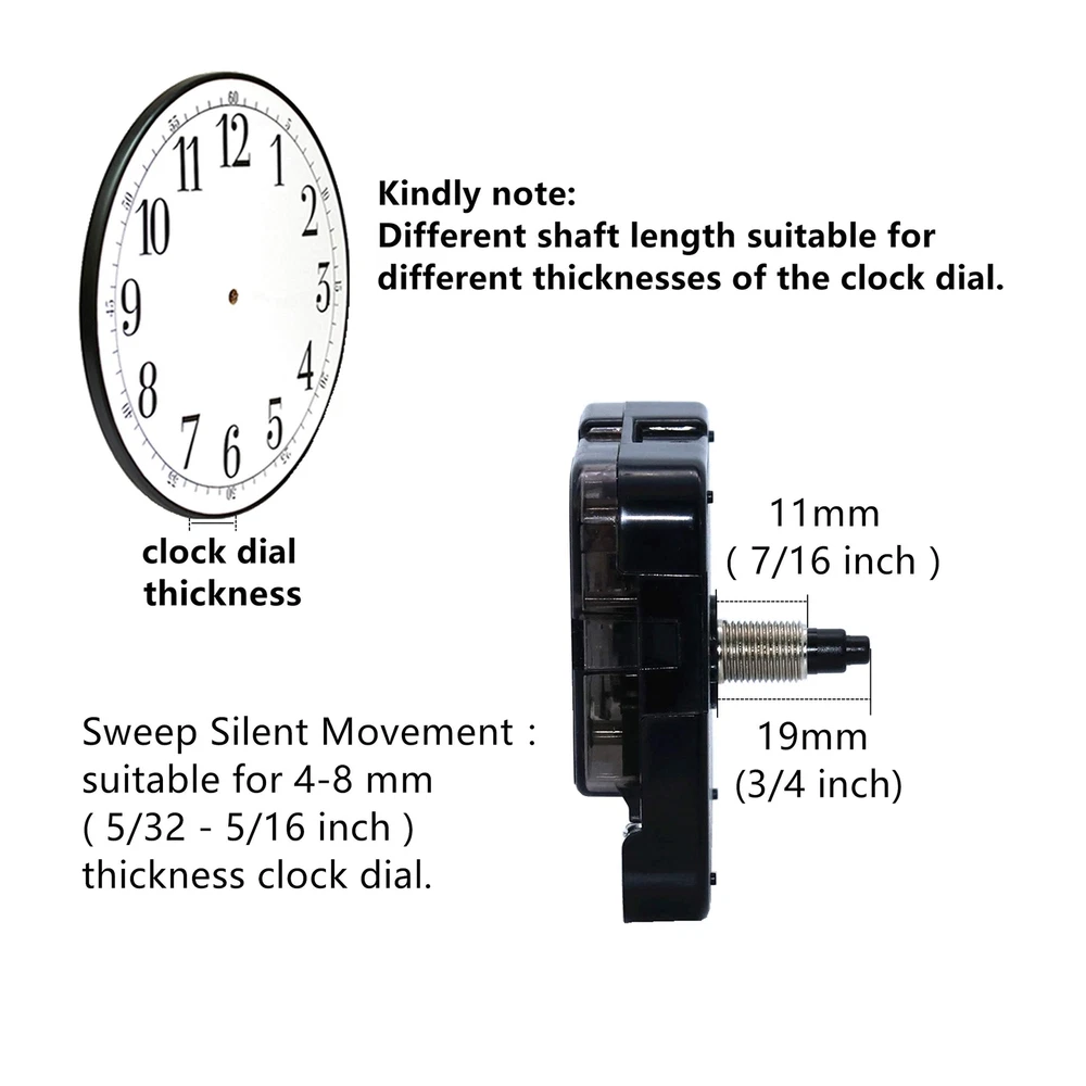 Features: Easy and simple design Suitable for repairing, replacing or making a clock Material: plastic and aluminum Second hand motion: Sweep Accuracy Within ±30seconds deviation each month (in normal temperature) Battery: one 1.5V Carbon-zinc batteries only,not included. Please DO NOT USE Alkaline battery,Rechargeable batteries,they will damage the movement. Dimensions: Case size: approx. 56 x 56 x 16 mm (2.2 x 2.2 x 0.65 inches) Total hour hand length: approx. 41.5 mm (1.63 inches) Total minute hand length: approx. 56 mm (2.20 inches) Total second hand length: approx. 64.5 mm (2.54 inches) Package included: 1 x Quartz clock movement 1 x Second hand 1 x Minute hand 1 x Hour hand 1 X Plastic washer 1 X Brass washer 1 X Brass nut Package : come with specially designed box convenient to carry and protect all from scratching, bending, and other damage while shipping. Clock mechanism size: total shaft length is 19 mm (3/4 inch), thread length is 11 mm (7/16 inch); Sweep silent movement, suitable for 4-8 mm ( 5/32 - 5/16 inch ) thickness clock panel. Clock hands kit: package includes 1 Metal hook,2 pieces of minute hands,2 pieces of hour hands, 2 second hand ,1 second cap and mounting hardware kits, easy for installation; Simple and elegant design, these replacement parts suit well to different styles of clock frame. clock,etc.INSTRUCTIONS - Included along with the movements. Accurate Time-keeping & Quiet Motor: features Youngtown 12888 clock mechanism, which offers watchmaker's accuracy and dependability; equipped with sweeping motion, no ticking; powered by a AA battery Warm notice: there are some clock parts made of aluminum, please do not install them with too much pressure or they will be bent.