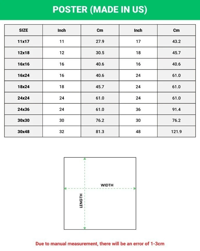 PRODUCT DETAILS Make your room more colorful and add characters to your space with this simple custom Poster. Made from high-quality paper, our posters are perfect to hang on the wall. You can easily decorate any space from a party, bedroom, bathroom, kids’ room, living room, office, dorm, and more with our print-on-demand poster without a frame. High-quality resin-coated photo-base paper. Satin photo finish, maximum color gamut, dmax, and image resolution. Heavyweight (230 gsm); 9 mil base. Ships in protective tubes. Lasts 95 years inside. 5 years in direct sunlight.
