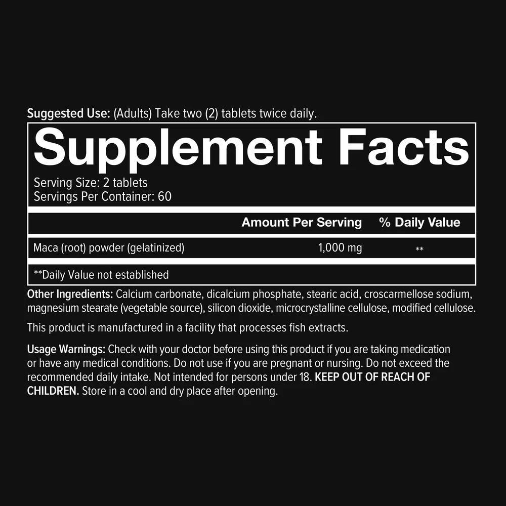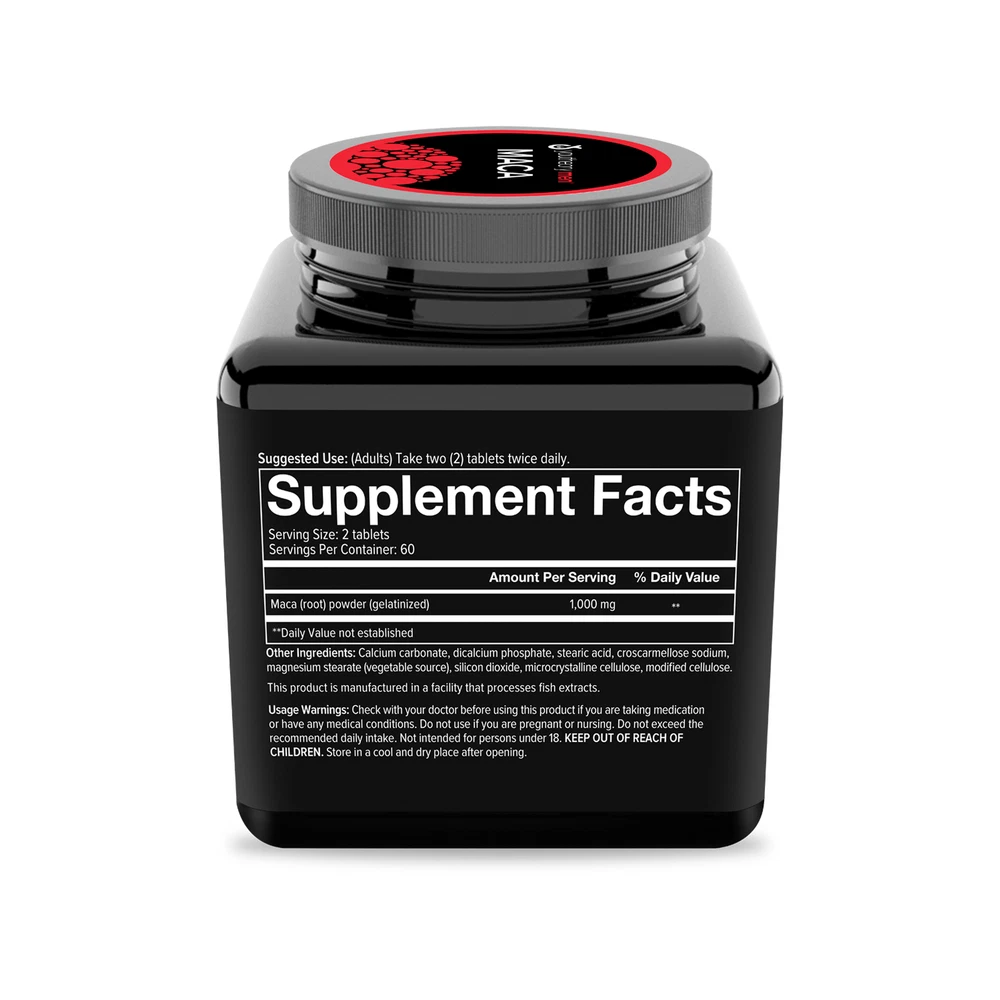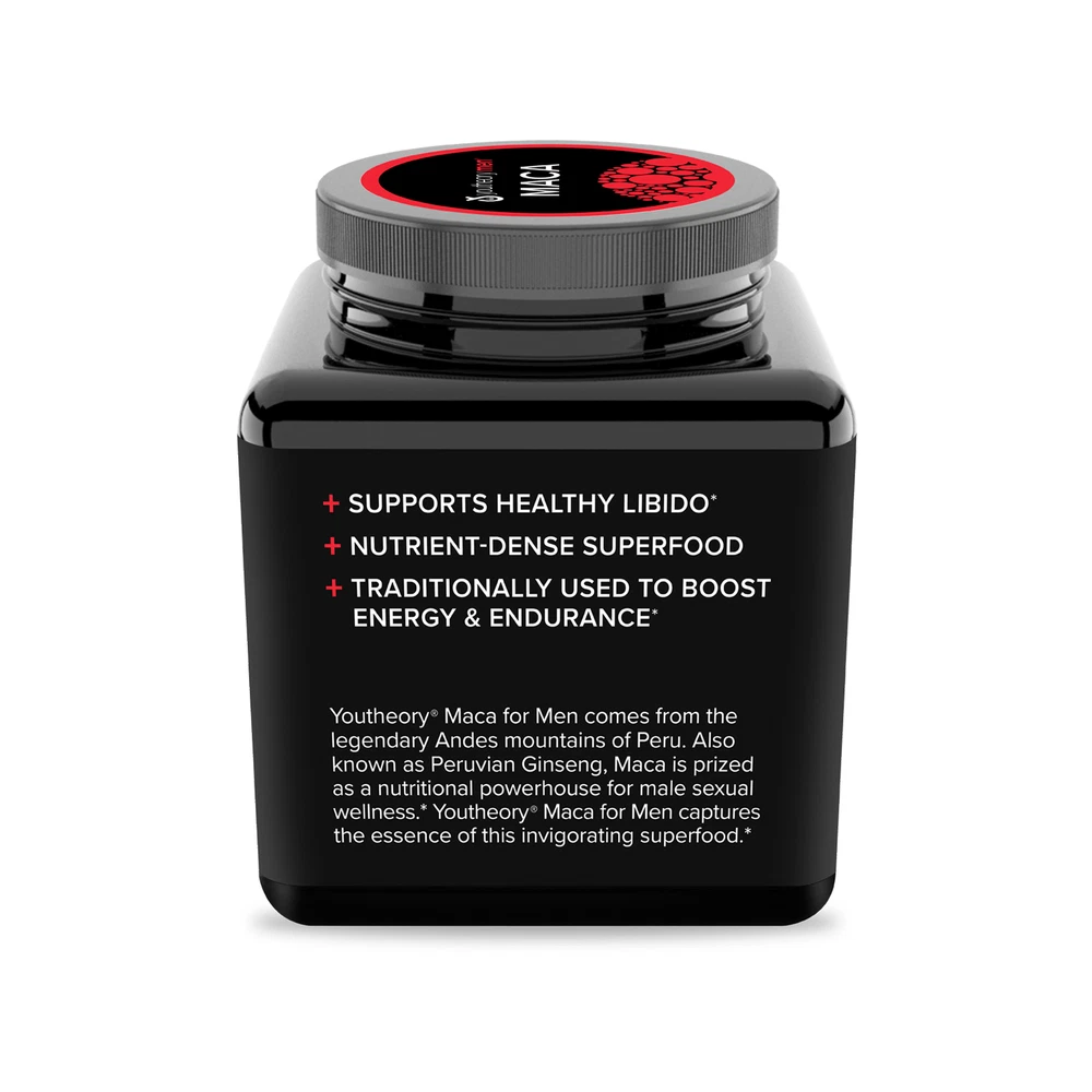 About This Item We aim to show you accurate product information. Manufacturers, suppliers and others provide what you see here, and we have not verified it. Feel more alive with Youtheory® Men's Maca Tablets.* Maca, also known as Peruvian Ginseng, is a nutrient-dense superfood grown in the Andes Mountains of Peru. Prized for its nutritional value and role of traditional Peruvian medicine, Maca is perhaps best known as an "adaptogen" that helps modulate the body's response to stress.* Made with Peruvian sourced Maca root Contains gelatinized Maca powder Adaptogen* Enhances male drive and desire* Perfect for long-term use at all stages of life Supports a well-balanced life* Dairy free, Soy free and contains No Gluten Ingredients *These statements have not been evaluated by the Food and Drug Administration. This product is not intended to diagnose, treat, cure or prevent any disease Indications: Health Concern: Energy Support Boost Energy Circulatory Health Anti-Stress Support Mood Support Warnings: This product is manufactured in a facility that processes whey milk protein and fish extracts. Usage Warnings: Check with you doctor before using this product if you are taking medication or have any medical conditions. Do not use if you are pregnant or nursing. Do not exceed the recommended daily intake. Not intended for persons under 18. Keep out of reach of children. Store in a cool and dry place after opening. Ingredients: Ingredients: Other Ingredients: Calcium Carbonate, Dicalcium Phosphate, Stearic Acid, Croscarmellose Sodium, Magnesium Stearate (Vegetable Source), Silicon Dioxide, Microcrystalline Cellulose, Modified Cellulose. Directions: Instructions: Suggested Use: (Adults) Take two (2) tablets twice daily. Explore this item Specifications Comparison Chart Features Instructions Small Parts Warning Code Gender Assembled Product Dimensions (L x W x H) Is Adult Product Manufacturer Contains Paper/Wood Is Temperature-Sensitive Count Volume Unit Contained Battery Type Is Drug Facts Label Required Model Segregation Brand Webcollage Comparison Table New Age Group Warning Text Assembled Product Weight Size Form Manufacturer Part Number Contains Batteries You are viewing Youtheory Men's Maca Tablets, 120 Ct Suggested Use: (Adults) Take two (2) tablets twice daily. 0 Unisex 3 x 3 x 3.75 Inches N Nutrawise N N 120 Each Does Not Contain a Battery N MRM.00371 1 Youtheory Y Adult This product is manufactured in a facility that processes whey milk protein and fish extracts. Usage Warnings: Check with you doctor before using this product if you are taking medication or have any medical conditions. Do not use if you are pregnant or nursing. Do not exceed the recommended daily intake. Not intended for persons under 18. Keep out of reach of children. Store in a cool and dry place after opening. 0.5 lbs 120 Tabs Tablets MRM.00371 N ~ Will be wrapped with care. ~ ~FREE SHIPPING~ Any questions, please feel free to contact us. Buy with confidence! Thanks for looking!