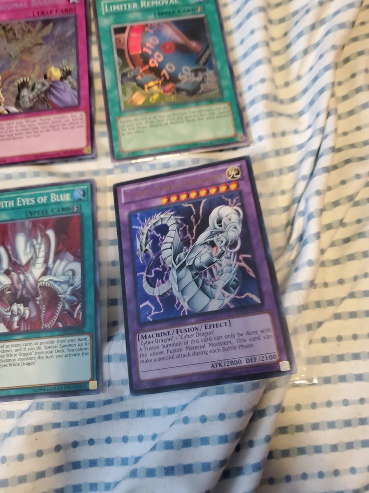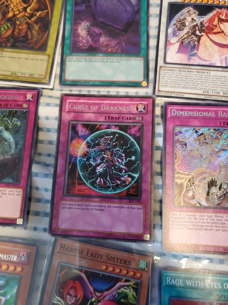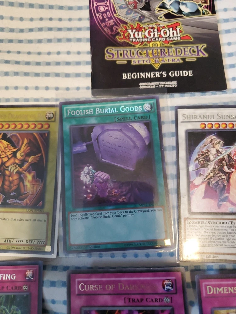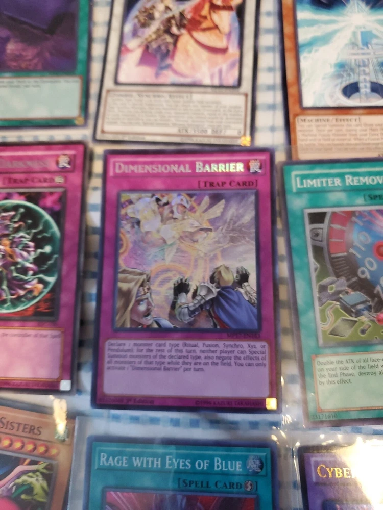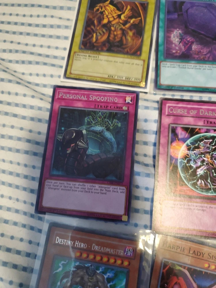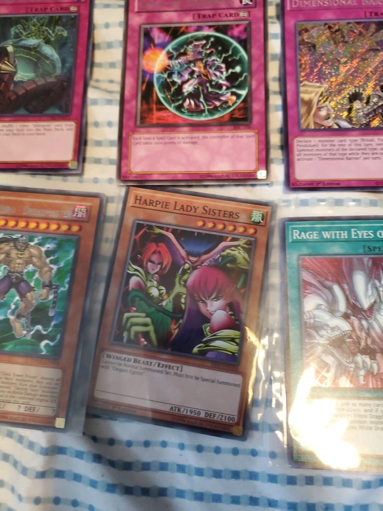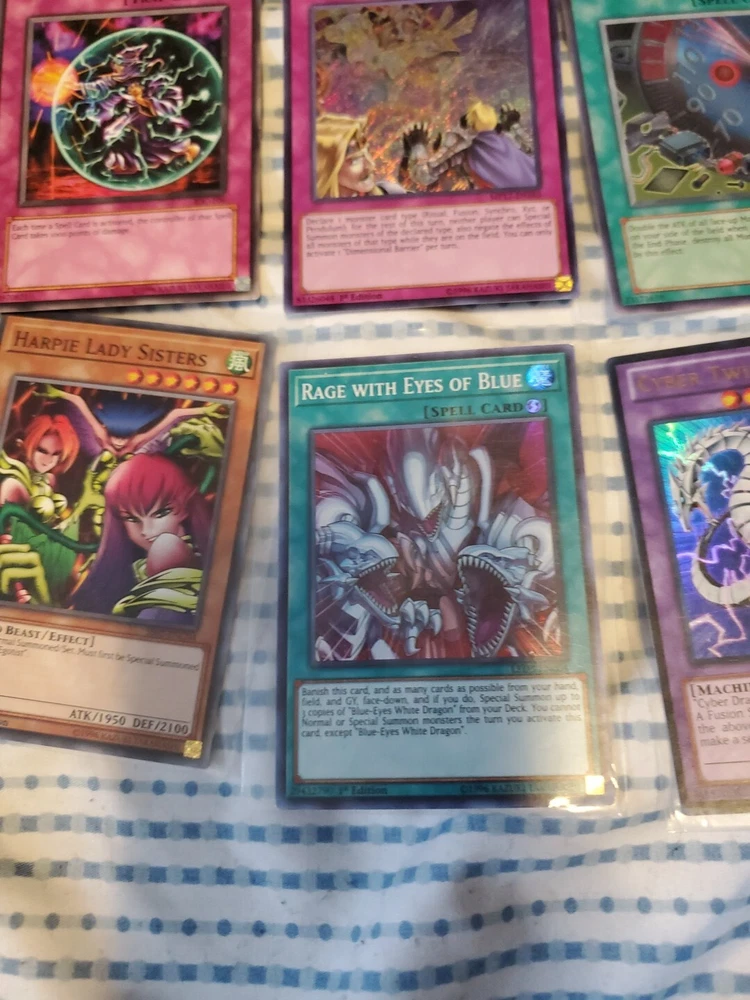 This Yu-Gi-Oh! card lot includes 13 pieces with a guide. The set features the winged dragon of ra foolish burial goods shiranui su saga cyber pharos personal spoofing curse of dark ess dimensional barrier limiter removal destiny hero dreadmaster harpie lady sisters rage with eyes of blue cyber twin dragons in English language and includes effect, normal, and spell cards. The cards are from the Yugi set and are suitable for players aged 13 and above. The cards have a holo finish and are perfect for collectors and players alike. Get your hands on this amazing card lot today!