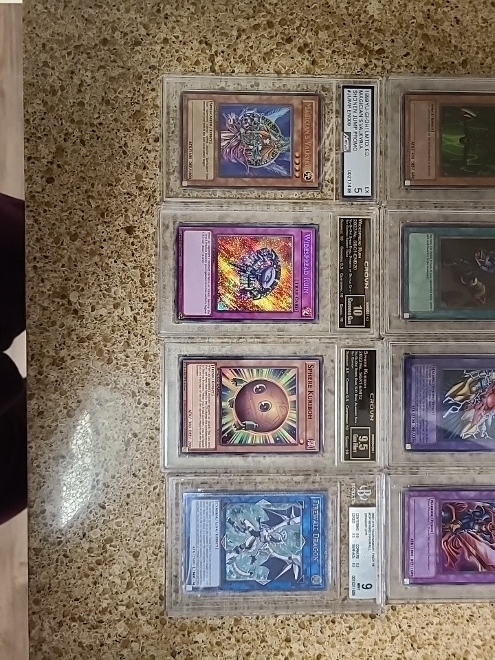 Yu-Gi-Oh Lot of eight (8) Graded cards from various companies. PSA: Grade 7 Man-Eater Bug (LOB Unlimited 96) Grade 8 Confiscation (MRL Unlimited 96) Grade 8 YZ-Tank Dragon (MFC 1st Ed. 96) Grade 9 Flame Swordsman (LOB Unlimited 96) Beckett: Grade 9 Firewall Dragon - Ultimate Rare (OP16) AGS: Grade 5 Magician's Valkyria (Limited JUMP Promo) Crown: Grade 9.5 Sphere Kuriboh (SGX1 1st Ed) Grade 10 Widespread Ruin (SBC1 1st Ed)