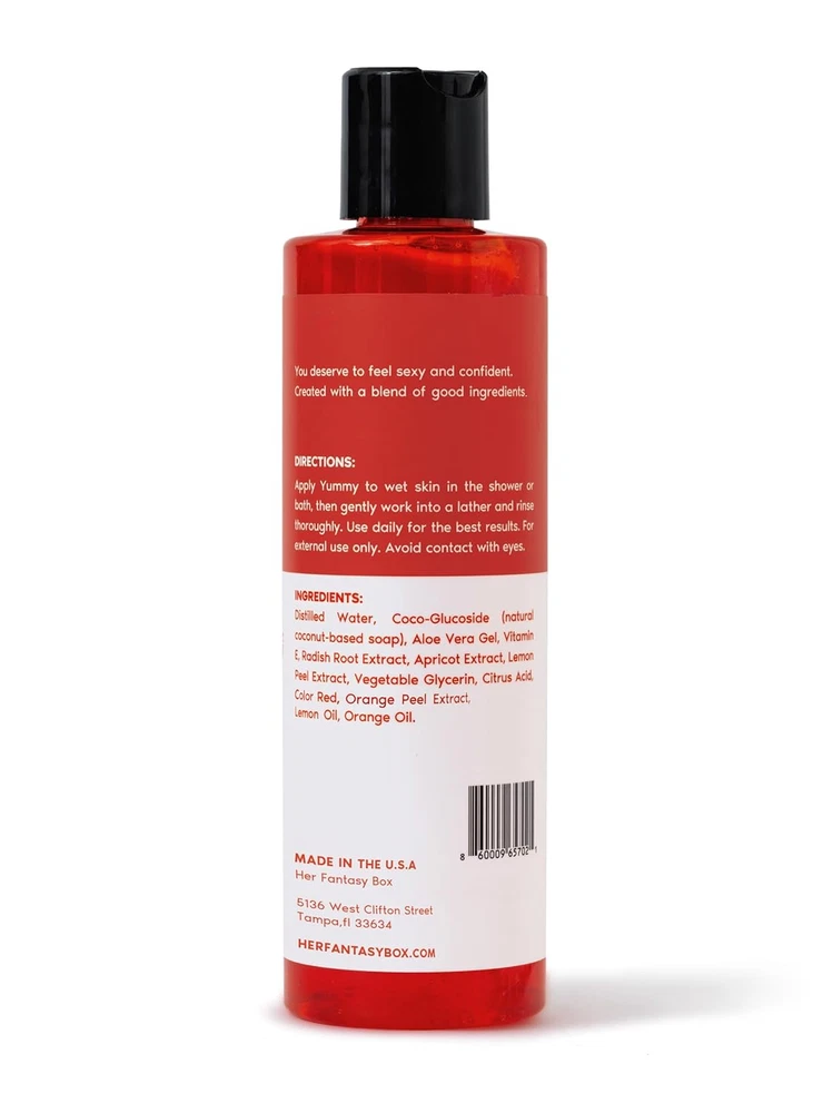 Yummy Body Wash - Indulgent, Luxurious Body Wash for Deep Cleansing Product Details ✨Enhances Relaxation: "Yummy" doesn't just tantalize your senses; it also works its magic to promote relaxation, helping you relax after a long day. ✨Directions for Use: 1. In the shower or bath, apply "Yummy" Body Wash to wet skin. 2. Delicately work it into a rich, foamy lather, letting the luxurious formula pamper your body. 3. Rinse thoroughly to reveal soft, rejuvenated skin. For optimal results, incorporate "Yummy" into your daily self-care routine. Please remember, "Yummy" is for external use only, so avoid contact with your eyes. ✨Rediscover the pleasure of self-care with Her Fantasy Box's "Yummy" Body Wash. It's more than just a body wash; it's a daily treat for your body and mind. Elevate your shower experience, enhance your confidence, and unlock a world of sensual delights. ✨Ingredients: Distilled Water, All Natural Coco-Glucoside, Aloe Vera Gel, Vitamin E, Radish Root Extract, Apricot Extract, Lemon Peel Extract, Vegetable Glycerin, Citrus Acid, Color Red, Orange Peel Extract, Lemon Oil, Orange Oil. Product Description Item dimensions L x W x H 1.97 x 1.97 x 6.75 inches Item Weight 0.59 Pounds Age Range (Description) Adult Scent Citrus, Apricot, Aloe Vera, Lemon, Orange Product Dimensions 1.97 x 1.97 x 6.75 inches; 9.36 ounces 1.97 inches x 1.97 inches x 6.75 inches. Weight: 0.59 lb Payment Details We accept all payments via Ebay using Credit Cards , PAYPAL , Apple Pay and many others Shipping Details We are always working hard to ensure your package arrives as soon as possible. Please understand that some factors like weather, high postal traffic, and the performance of shipping companies are outside of our control. Delivery & Return Policy Details We offer a 30-Day Return Policy on items in which you are not completely satisfied with. You have the option of a full-refund or an exchange of the item. No returns are available on items shipped outside of the USA.