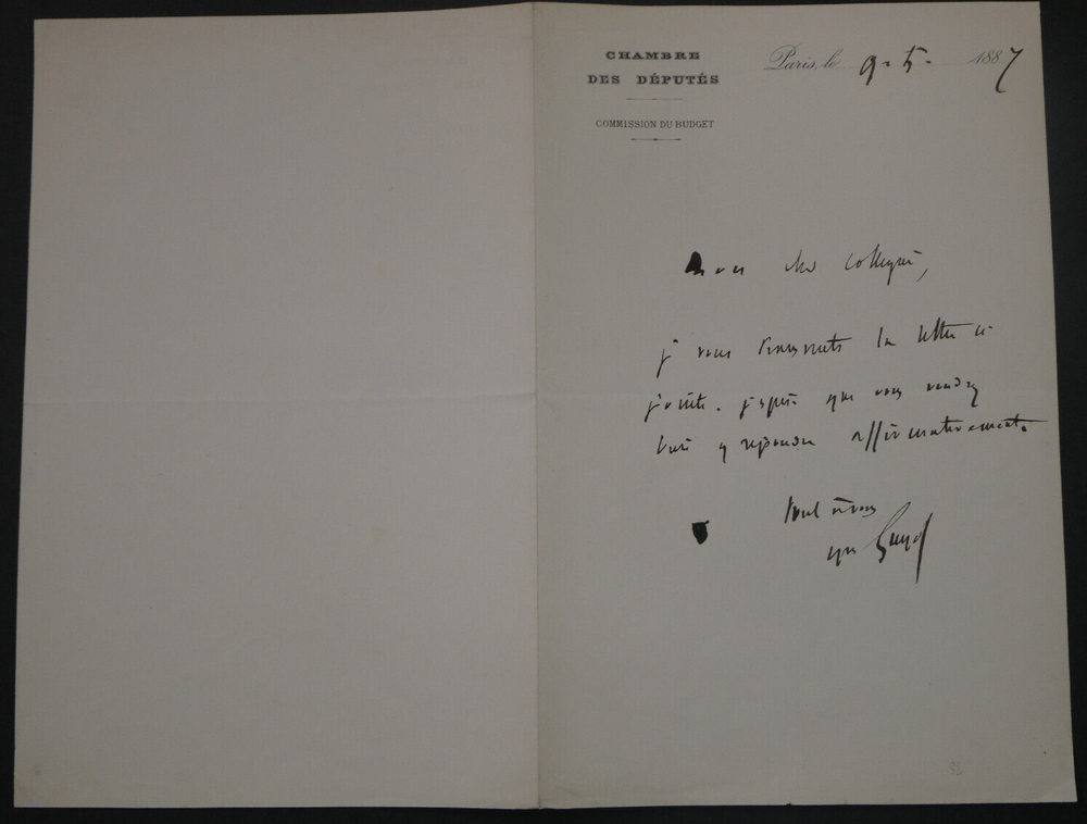 Free eBay listing template designed by dewiso.com Yves GUYOT. Lettre autographe signée en date du 9 mai 1887. Homme politique Description : Lettre sur papier à en-tête "Chambre des députés Commission du budget" Dimensions : 13,4 x 20,7 cm État : Voir photos pour plus de détails. Nombre de pages : 1 page Yves GUYOT Yves Guyot, né à Dinan le 6 septembre 1843 et mort à Paris le 22 février 1928, est un homme politique, journaliste, essayiste et économiste français. C'est un républicain anticlérical et un libéral, partisan farouche du libéralisme politique comme du libéralisme économique libre-échangiste. Wikipédia Contactez-nous Lettres autographes, vieux papiers, livres anciens, photographies, gravures, timbres?? Nous expertisons et/ou rachetons dans toute la France vos lettres, collections de lettres et livres anciens. Paiement Sont acceptés les paiements par eBay, par PayPal, par virement ou par chèque. Envoi Envoi soigné dans un emballage rigide et étanche sous trois jours. Prévoir les délais postaux habituels en plus. Retour Satisfait ou remboursé. Si vous n'êtes pas entièrement satisfait, retour à la charge du vendeur pour l'Europe. À la charge de l'acheteur pour le reste du monde. Description : Lettre sur papier à en-tête "Chambre des députés Commission du budget" Dimensions : 13,4 x 20,7 cm État : Voir photos pour plus de détails. Nombre de pages : 1 page