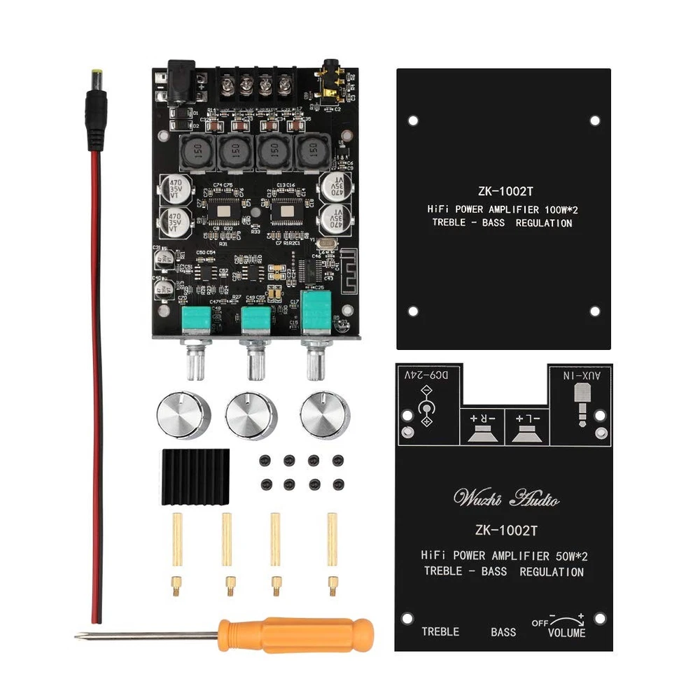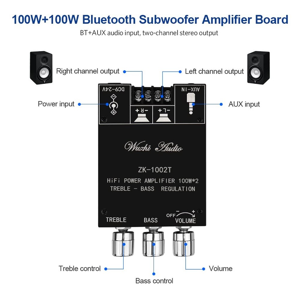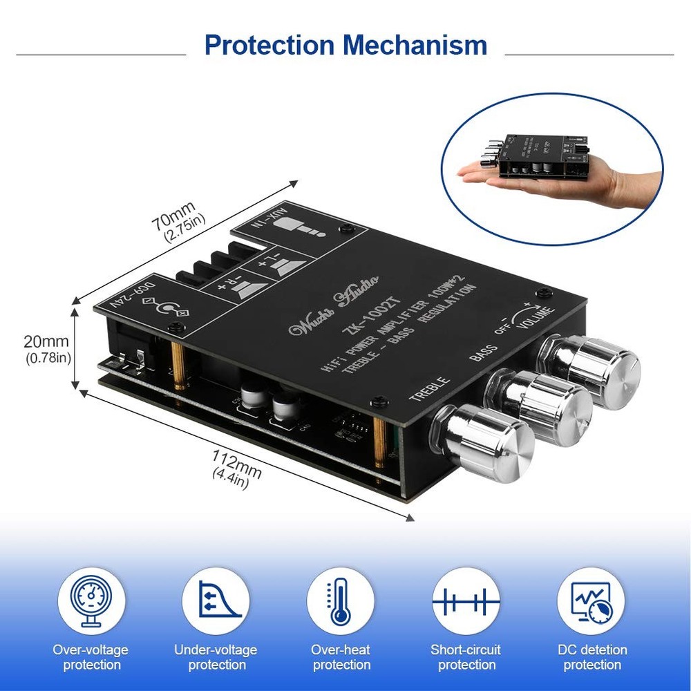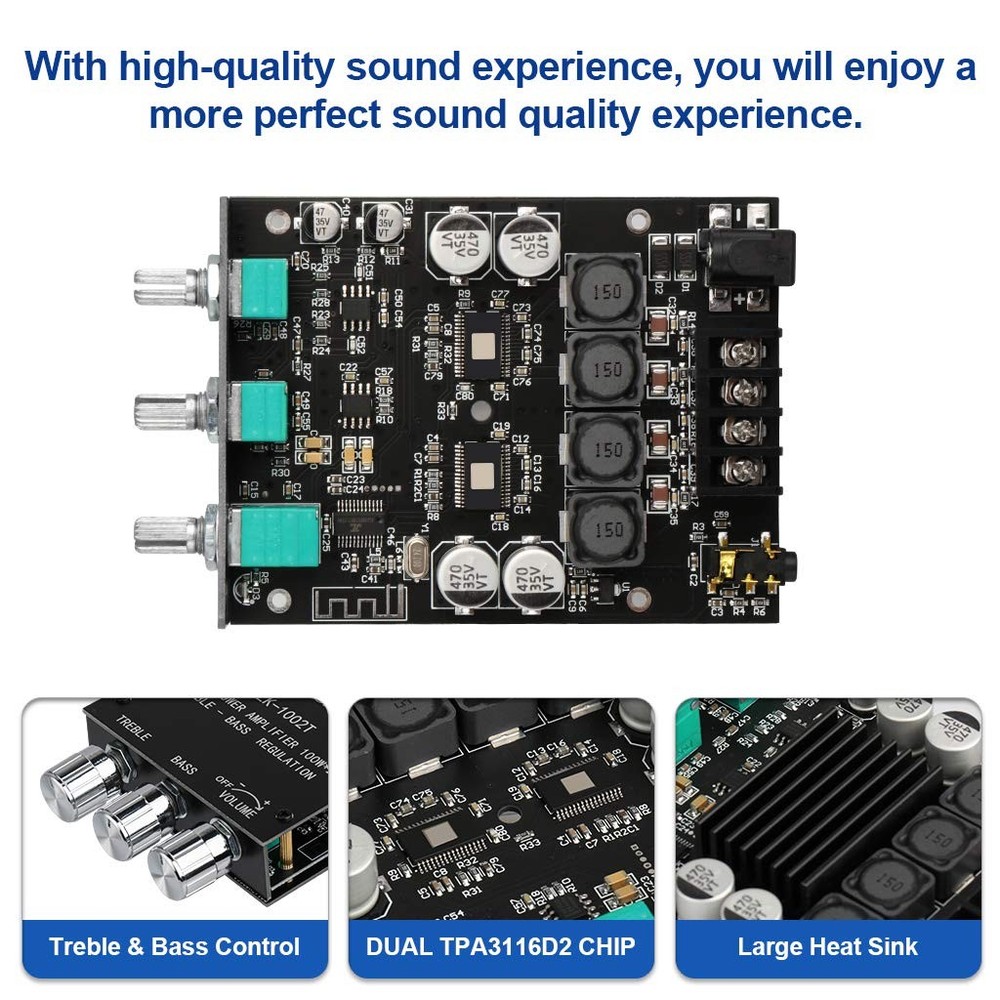 Features: 1. Bluetooth+AUX audio input, 2.0 channel stereo output, just a little sound distortion. 2. You can directly adjust the treble and bass. 3. AMP module has AM interference suppression function, shielding cover power inductor, low noise front stage operational amplifier, you will enjoy a more perfect sound quality experience. 4. Audio amplifier board with over-voltage protection, under-voltage protection, over-heat protection, short-circuit protection. 5. The illustration of each interface is printed on the protective plate, making it easy to install and use even without instructions. Use occasion: This 100W+100W dual-channel bluetooth audio amplifier board is widely use indoor and outdoor, such as family, party, bar, band, concert,Carnival etc. Specifications: Product name:2.1 Channel bluetooth audio subwoofer amplifier module with treble and bass control Product model:ZK-TB21 Version: Bluetooth 5.0 (10 meters if unobstructed) Input Sensitivity: 500mV Signal to noise ratio:>90dB Audio Input: Bluetooth+AUX Channel: 2.1 Chip: TPA3116D2 (AM interference suppression function) Adapted speaker: 20-100W,4-8Ω Power Range: DC12-24V/ above 5A (High power recommended high voltage) Output Power: 50W*2 @R&L channel Max100W@Subwoofer Product size: 4.72in*3.94in*0.7in Package Weight: 5.43oz Notice: Adequate output power is required when the audio input is sufficient and the power supply voltage/current is sufficient, the relative power will be higher. Different impedance horns will have different output power.In the case of sufficient voltage and current, the larger the impedance horn, the smaller the relative sound power. Package Including: 1 x Audio amplifier module with 3 buttons 1 x Screwdriver 2 x Shell 3 x Button 4 x Gold Nut 4 x Gold Screw 8 x Black Screw Subwoofer Audio Amplifier Board: 100W+100W Bluetooth 5.0 wireless connection, Bluetooth+AUX audio input, 2.1 channel stereo output, just a little sound distortion. Note: When using AUX mode, please confirm that the Bluetooth connection of this module has been disconnected; Treble and Bass Adjustment: This digital Amp board with independent treble and bass adjustment buttons,you can directly adjust the treble and bass through the module, without using the player or speaker; Perfect Sound Quality Experience: The audio power subwoofer amplifier module with powerful chip, AM interference suppression function, shielding power inductance, low noise front stage operational amplifier, let you enjoy a more perfect sound quality experience; With Protective Function: This Bluetooth Amp module is designed with over-voltage protection, under-voltage protection, over-heat protection, short-circuit protection, with case to protective it; Easy Installation and Use: The illustration of each interface is printed on the protective plate, making it easy to install and use even without instructions. Small size: 4.4 in*2.75 in*0.78 in, easy to carry;