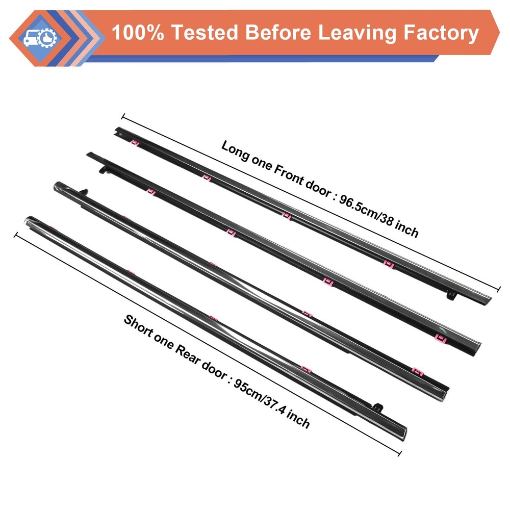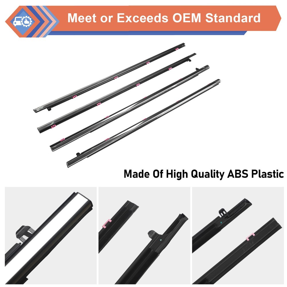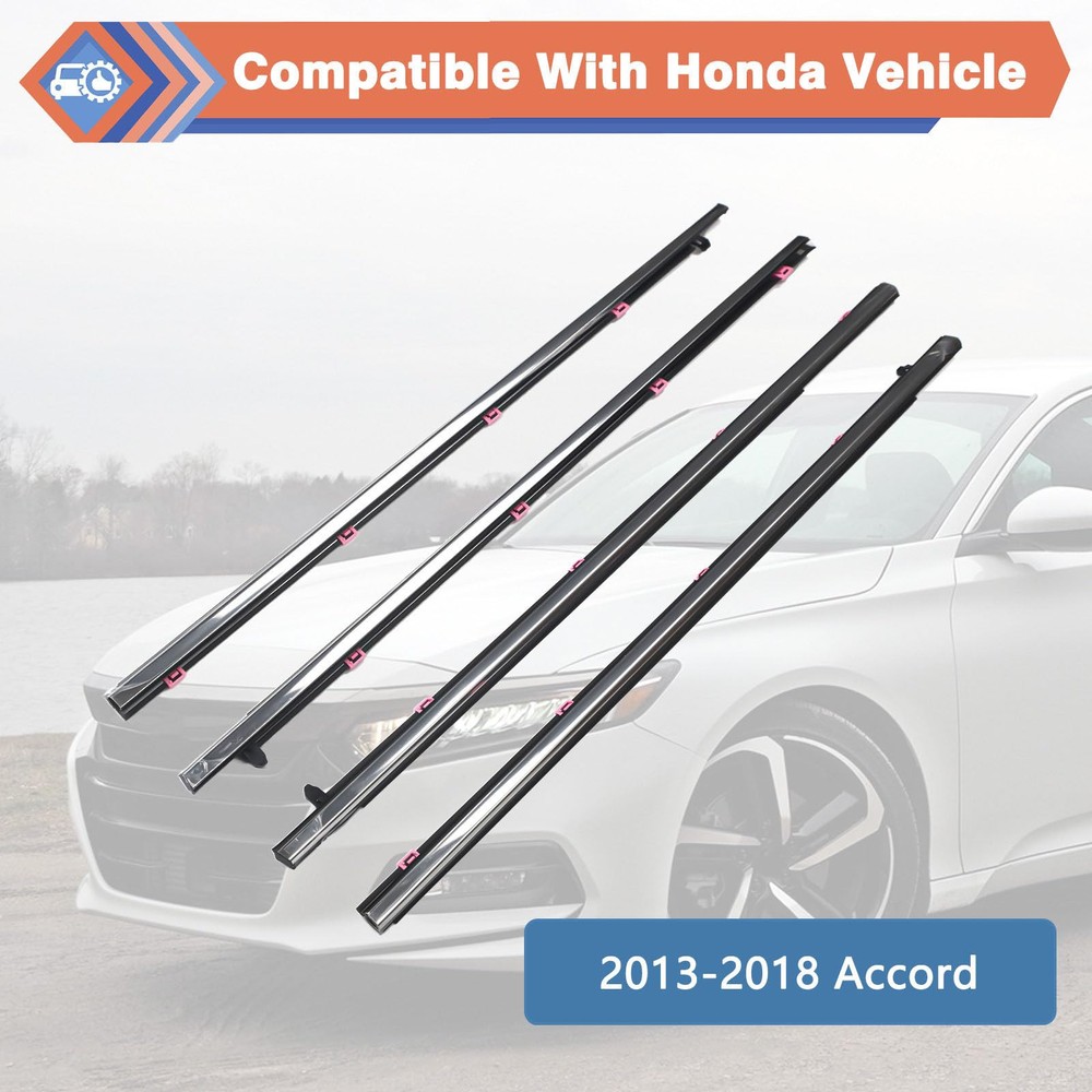 Package Include: 2 * Front Outer Door Window Weatherstrip Seal Belts 2 * Rear Outer Door Window Weatherstrip Seal Belts Replaces Part Number: #72410-T2A-A01 72450-T2A-A01 72910-T2A-A01 72950-T2A-A01 Compatible with Honda vehicle:2013-2018 Accord 【Replacement Part Number】 - #72410-T2A-A01, 72450-T2A-A01, 72910-T2A-A01, 72950-T2A-A01. Before ordering, please confirm compatibility and weather are suitable for your vehicle! 【Compatible Vehicle】 - This outer door window weatherstrip seal belt compatible with Honda vehicle 2013-2018 Accord. 【High Quality】- Our outer door window glass weatherstrip made of high-performance material that are completely corrosion-resistant and dust-proof, wear-resistant, heat-resistant, strong impact resistance, and good overall performance. It’s equivalent parts fully comply with the original manufacturer's specifications and functions. 【Direct Fit & Easy To Install】 - This window molding trim weatherstrip is easy to install and directly to replace the old one. Saving your time and money by replacing it yourself.