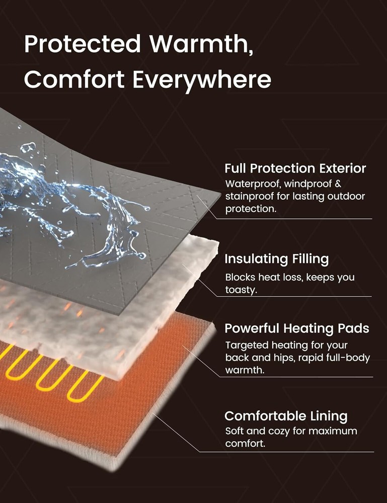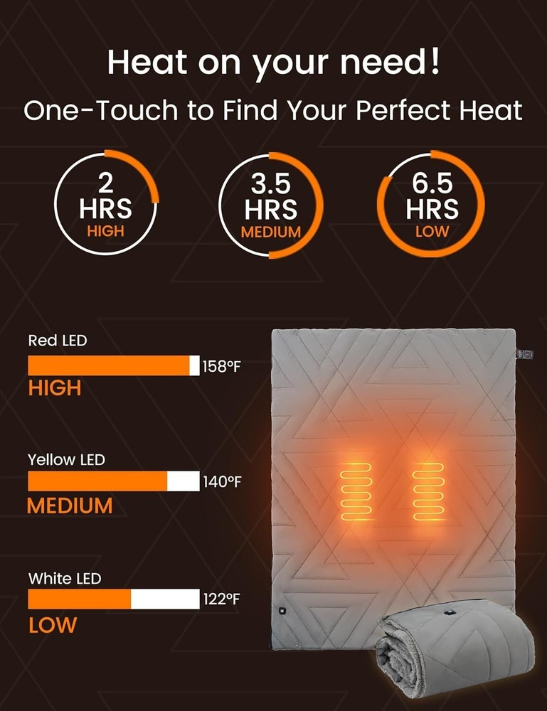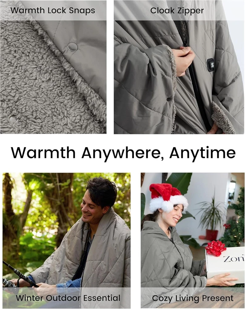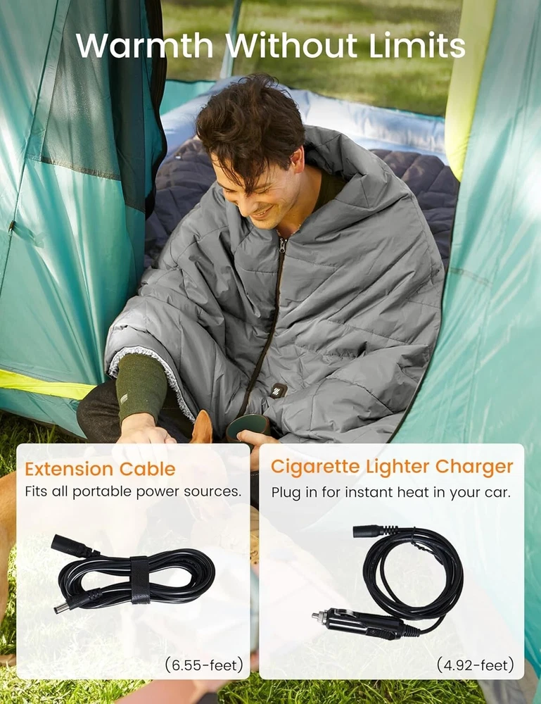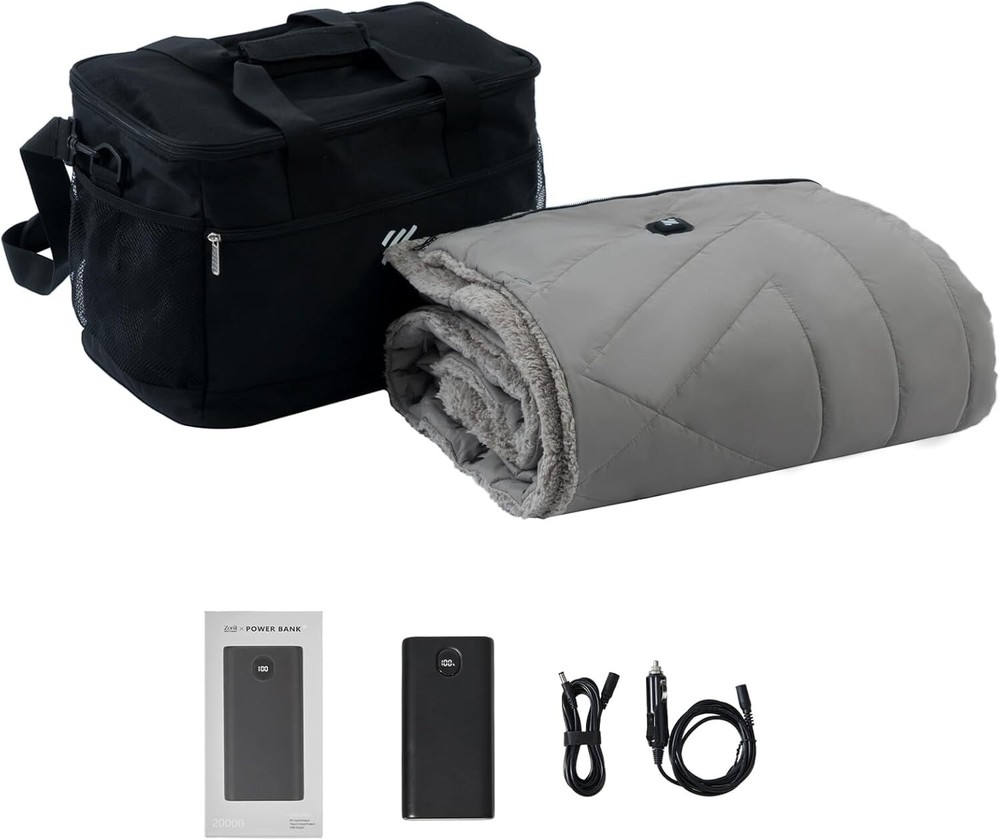 Z-Walk Pro 36W Heated Blanket Battery Operated,Portable,Cordless, Rechargeable Heated Blanket with 3 Heating Levels,Includes 20000mAh Power Bank,for Camping,Car,Stadium,Outdoors Grey 【Certified Safe】This portable heated blanket has been ETL and FCC certified, ensuring safety for you and your family. Equipped with two 12x12-inch heating elements focused on the back and waist, it provides warmth to your entire body. Measuring 50x70 inches and using high-quality carbon fiber heating elements, this blanket is not only safe and comfortable but also features rapid heating technology with smart control, warming up in just 1-3 minutes. It's perfect for use in a variety of settings. 【Waterproof and Zipper Design】The heated blanket is made from premium waterproof fabric, effectively preventing heat loss and helping maintain warmth, even in windy or rainy weather. Its adjustable zipper design keeps it in place whether draped over your shoulders or wrapped around your body, enhancing your overall comfort. 【Wireless and Portable Design】Free yourself from tangled cords with this wireless heated blanket. It's perfect for outdoor adventures, camping, travel, car trips, home, or office use. Lightweight and easy to carry, it comes with a 20000mAh power bank, a DC extension cable, a 5-foot car adapter, and a portable carry bag. Compact and flexible, it's ideal for outdoor activities, road trips, or work, providing warmth anytime, anywhere. 【Three Temperature Settings】Simply press and hold the button for 2-3 seconds, and the battery-powered heating blanket will start to warm up. The temperature ranges from 86°F to 140°F. We recommend starting with the highest setting (red) and then adjusting to your comfort level. After a full 6-hour charge, the blanket can provide heat for 2 to hours, depending on the ambient temperature. In extremely cold conditions, the heating duration may be shorter, ranging from 2 hours on high to low settings. The large heating area ensures faster and more noticeable warmth. 【Machine Washable】For easy cleaning, place the DC cable inside the pocket to prevent damage when using the washing machine. Simply wipe away surface dirt or toss the entire blanket into the washer to keep it in top condition, making it both convenient and hygienic. 【Perfect Gift Choice】Whether you're camping, traveling, hiking, or just lounging indoors watching TV or working, this portable heated blanket is the ideal companion. It can fully cover your body or be worn as a cozy shawl, providing comfort and convenience wherever you are. If you have any questions about the product, feel free to contact me through , and we’ll be happy to assist you.