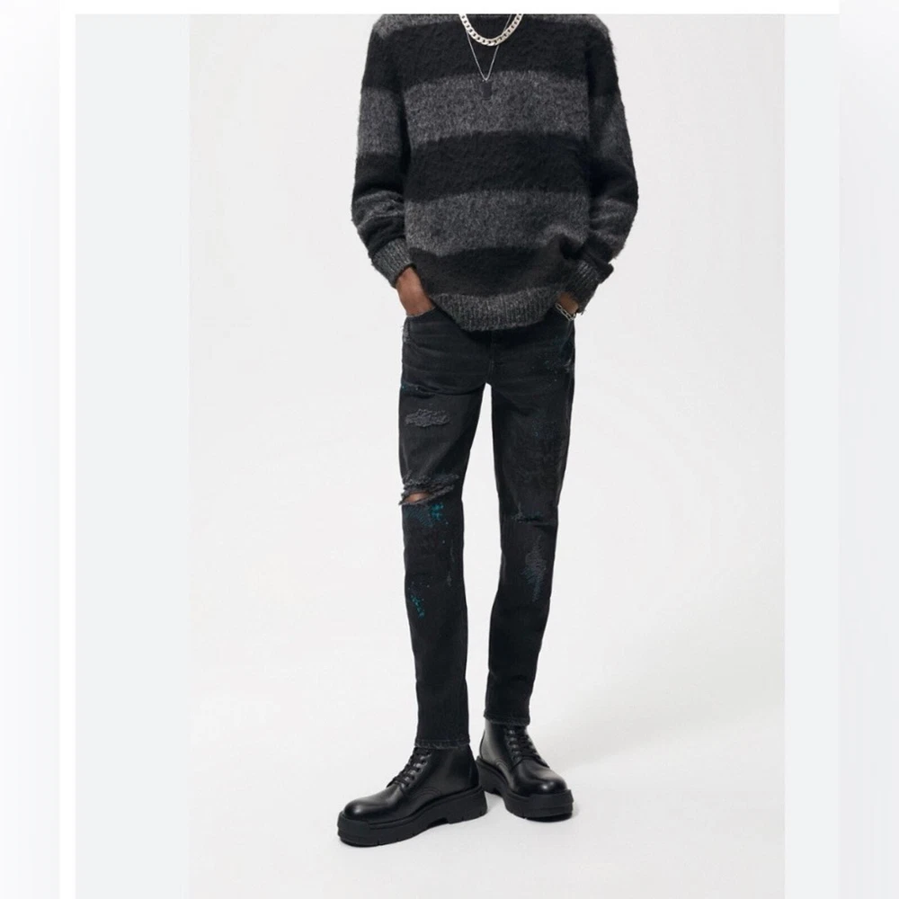 Zara paint splatter ripped distressed black denim skate slim jeans NWT . Super nice . Size 32 . Flat lay measurement waist 17 inch . Rise 10 inch . Inseam 29 inch . Shipped with USPS Priority Package, No returns but backed by ebay money back guarantee. If you have any other questions please contact seller . Please leave a wonderful feedback once you are satisfied with the purchase , Thank you . Custom charges may apply for international purchases .
