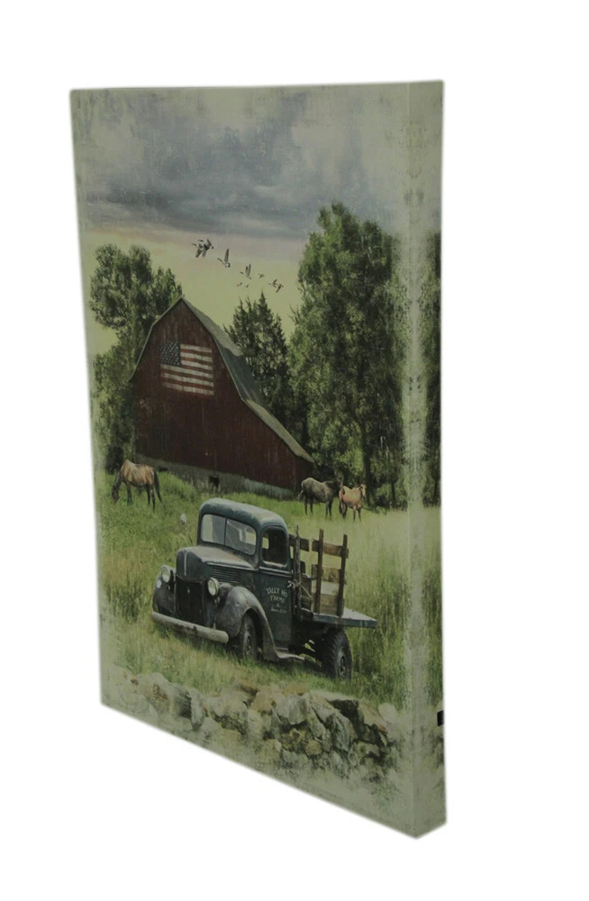 This cool farmhouse style canvas wall print features a vintage delivery pickup truck in a field, with a weathered red barn and horses in the background. A flick of the switch on the right side makes the headlights of the truck glow, via the LED lights hidden behind the canvas. This 30 inch high, 20 inch long, 2 inch deep wall hanging is printed on canvas stretched over a wood frame backed in polyester. It requires 2 AA batteries (not included) controlled by a switch on the side. It's a great gift for anyone who loves farm life. Our eBay Store About Us Add to Favorite Sellers Pickup Truck and Barn 30 X 20 LED Lighted Canvas Wall Print OVERALL SIZE - 30 Inches High, 20 Inches Long, 2 Inches Thick Made of Canvas With Wooden Stretchers LED Lights Built In Takes 2 AA Batteries (Not Included) Hangs Easily On Your Wall This cool farmhouse style canvas wall print features a vintage delivery pickup truck in a field, with a weathered red barn and horses in the background. A flick of the switch on the right side makes the headlights of the truck glow, via the LED lights hidden behind the canvas. This 30 inch high, 20 inch long, 2 inch deep wall hanging is printed on canvas stretched over a wood frame backed in polyester. It requires 2 AA batteries (not included) controlled by a switch on the side. It's a great gift for anyone who loves farm life. Product Details Color Multicolored Height 30 Length 20.75 Weight 2.55 LB