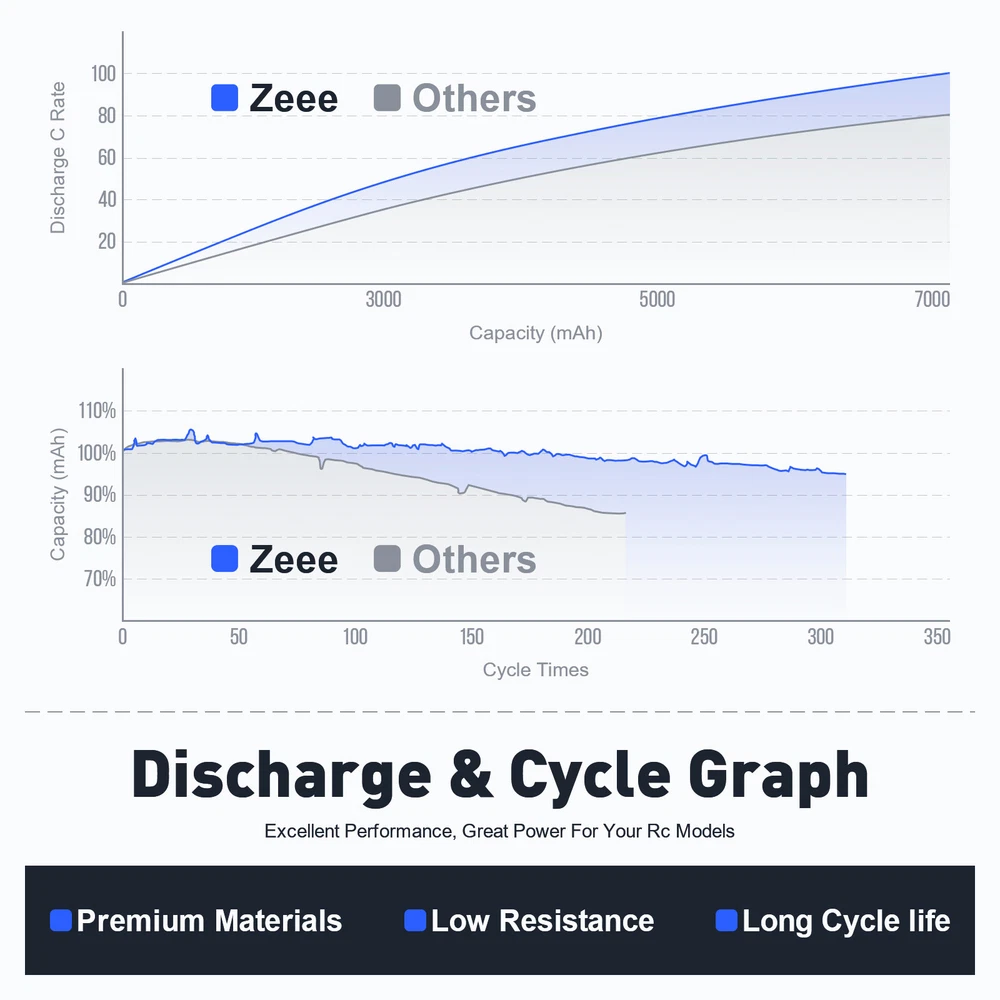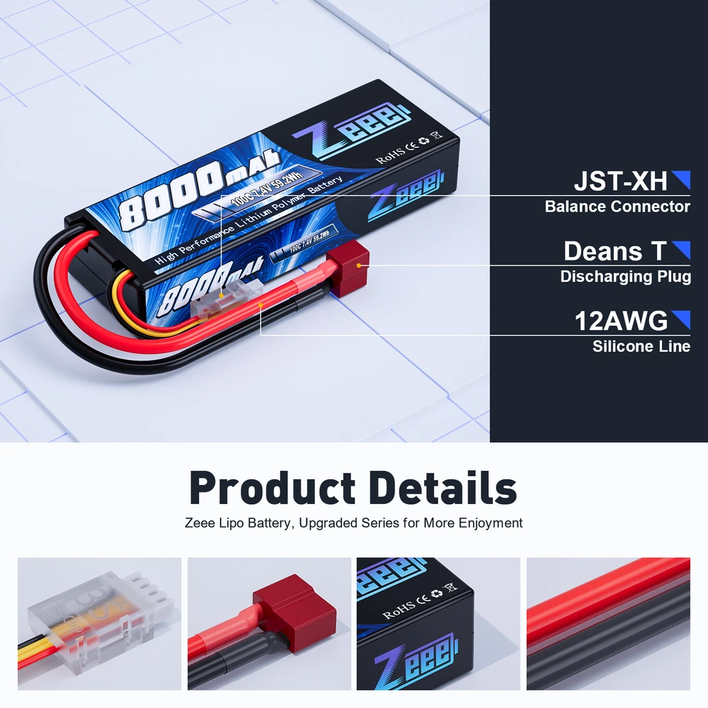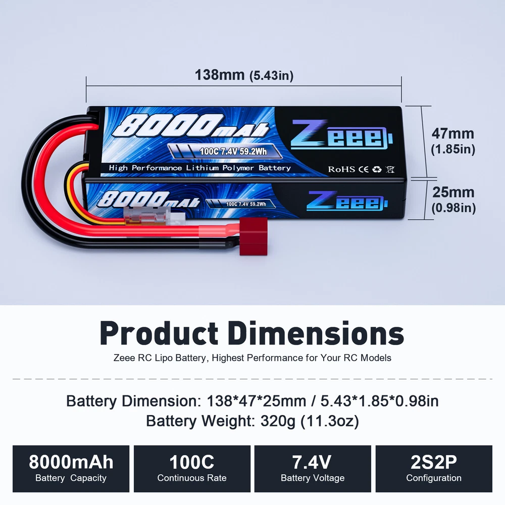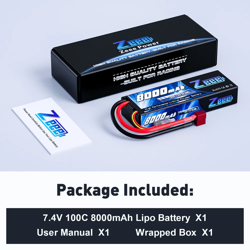 7.4V 2S 7.6V 2S 11.1V 3S 14.8V 4S 18.5V 5S 22.2V 6S Safe Bag zeee_official_store 7.4V 2S LiPo Battery 7.6V 2S LiPo Battery 11.1V 3S LiPo Battery 14.8V 4S LiPo Battery 18.5V 5S LiPo Battery 22.2V 6S LiPo Battery Zeee LiPo Battery Bag Other Zeee 2S LiPo Battery 8000mAh 7.4V 100C Deans T Hardcase for RC Car Truck Truggy Zeee Lipo RC Battery 7.4V 100C 8000mAh 2S Hard Case with Deans Plug for RC Car RC Truck RC Truggy RC Boat Helicopter Specifications: Brand: Zeee Voltage: 7.4V Capacity: 8000mAh Discharge Rate(C): 100C Configuration: 2S2P Connector Type: Deans Plug Balancer Connector Type: JST-XH Length: 138mm/5.43inch Width: 47mm/1.85inch Height: 25mm/0.98inch Approx Weight(dev.10g): 320g/11.3oz/pc Compatible with: Zeee 7.4V 100C 8000mAh 2S Lipo battery fits for 1/8 and 1/10 rc car, Losi, HPI Strada XB 1/10 RTR Electric Buggy, Team Associated, Axial, Tamiya, Duratrax, Jammin, Redcat Racing, Exceed RC, ElectrixRC, Emaxx, Bandit, Rustler version, etc. - It also could be used for RC airplane, RC helicopter, RC boat, drone, FPV. - For RC battery, only if the voltage, dimension and plug match, then it will fit. Safety Notes: 1. To ensure safety, please check and confirm lipo battery surface and voltage is normal before using. 2. If the new lipo battery won’t hold a full charge or loss the charge very quickly in short time, please use Professional lipo battery Charger to charge and recycle several times first. For most lipo battery, the safest charge rate is 1C - 2C. 3. Never Over-charge above 4.2V per cell and Over-discharge below 3.0V per cell. (Normal cell voltage is between 3.7V~4.2V) 4. Never charge lithium polymer battery unattended. 5. If lipo battery has any problem, feel free to contact us via eBay message in the first time, we will offer you a proper solution. Package Included: 1pc Zeee 7.4V 100C 8000mAh 2S LiPo Battery with Deans Plug Hard Case 1 x User manual 1 x Wrapped box About Us Payment Shipment Return and Warranty Feedback About Us Zeee Power established at 2011, which has grown to the leading manufacturer of RC lithium battery in China. Over the past years, we boast of more than 300 trained workers, 36 experienced engineers and technicians in RC lithium battery R&D solution to ensure that we provide high quality products and first-class services to our global customers. All of Zeee RC LiPo Batteries are designed with safe and steady formula of raw material, smooth and steady discharge curve and rigorous scientific quality control system, in order to ensure longevity and reliability. Our batteries are manufactured using the superior ‘stacking’ method, which provides you with reliable capacity and consistent power. Payment Payment should be Complete within 5 days after the end of the Auction. Non-paying winners will be filed for closing auction. Shipment 1. All items will be shipped to buyer's eBay address. Before you pay, please make sure your address on eBay matches the address you would like us to ship to. 2. All items will be shipped within 1 business day upon receipt of payment. 3. Items will be sent from USA directly, it usually takes approximately 4-7 business days to receive order. Return and Warranty 1. Our items come with 180-Day warranty. 2. Our warranty does not extended to any products that are physically damaged or that are not under normal operating conditions as a result of misuse or improper installation on the buyer/user's part. 3. This product comes with 30-Day Money Back Guarantee. 4. We stand behind every product we sell. If you're not pleased with your purchase, we'll be happy to make an exchange or refund. Feedback 1. We value your feedbacks, please leave your feedback and comment. 2. We will automatically leave positive feedback to every buyer who completed the transaction and left positive feedback to us. 3. Your better comments will be an encouragement for us to offer the better quality and the better service in future. 4. If you have any problems, pls contact us, we will try our best to help you to solve it.