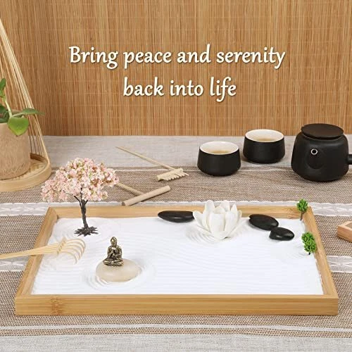 Return Policy Fast Delivery Trusted seller Zen Garden Kit for Office Desk, Japanese Meditation Decor Sand Art with Tray/Buddha Statue/Handmade Ceramic Lotus Incense Holder/Zen Accessories, Spiritual Gift for Women Men Yoga Mind Relaxation Product Description Less Is More - With the purpose of “move the viewer from a cluttered mind to a state of focused mind”, our zen garden kit is designed with the vital elements of large-scale zen gardens. The miniature dry garden comes with a 13x8.6” bamboo tray, buddha statue, lotus incense holder, sand, rocks, cherry tree, mini plants and 4 miniature zen tools. Create your own meditative place to rest the mind! Smooth Mind, Bring Calm - Combing and arranging a zen garden is a very calming and relaxing activity! Japanese zen gardens create a sense of peace, harmony and tranquility. Often taking a moment to meditate is impractical in an office setting, but this mini desktop zen garden makes it happen. Definitely help bring harmony between our busy daily lives and nature! Valuable Zen Accessories - Compared with other resin statue, our Buddha statue is made of pure copper, lightweight, corrosion-resistant and long-lasting. Handmade ceramic lotus works with as an incense holder, fragrance diffuser (just spray perfume on it) and tabletop decor. 4 different zen tools allows you to design freely. Add Peaceful Aura To Your Decor - Japanese gardens are havens of beauty, tranquility and cultural landscapes, and places for natural healing. It is great for office workspace, offering you a relaxing break from computer work. Also a meditative decor for living room, bedroom, study room or guest room. Ideal Spiritual Gift - Looking for a special, mindful gift? Try our Japanese zen garden, allowing to connect with nature and cultural art. A fascinating gift to help combat stress and anxiety during hectic moments. Nice companion for work, yoga, fitness and relaxation. Shipping Returns Payment Shipping Shipping is FREE to all addresses other than APO/PO boxes in the lower 48 states. All our stock ships from US-based warehouses. Shipped via USPS or UPS (depending on location and package weight) Unless stated otherwise, all orders will ship within 24-72 hours of your payment being processed. Check our feedback to see the great reviews of FAST shipping we offer. Returns Seller does not accept returns Payment We currently accept payment via eBay managed payments only. Once payment is cleared, we will dispatch your shipment within 1-3 business days. Please refer to the "Shipping" tab for more information regarding shipping speed to your destination.