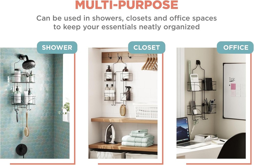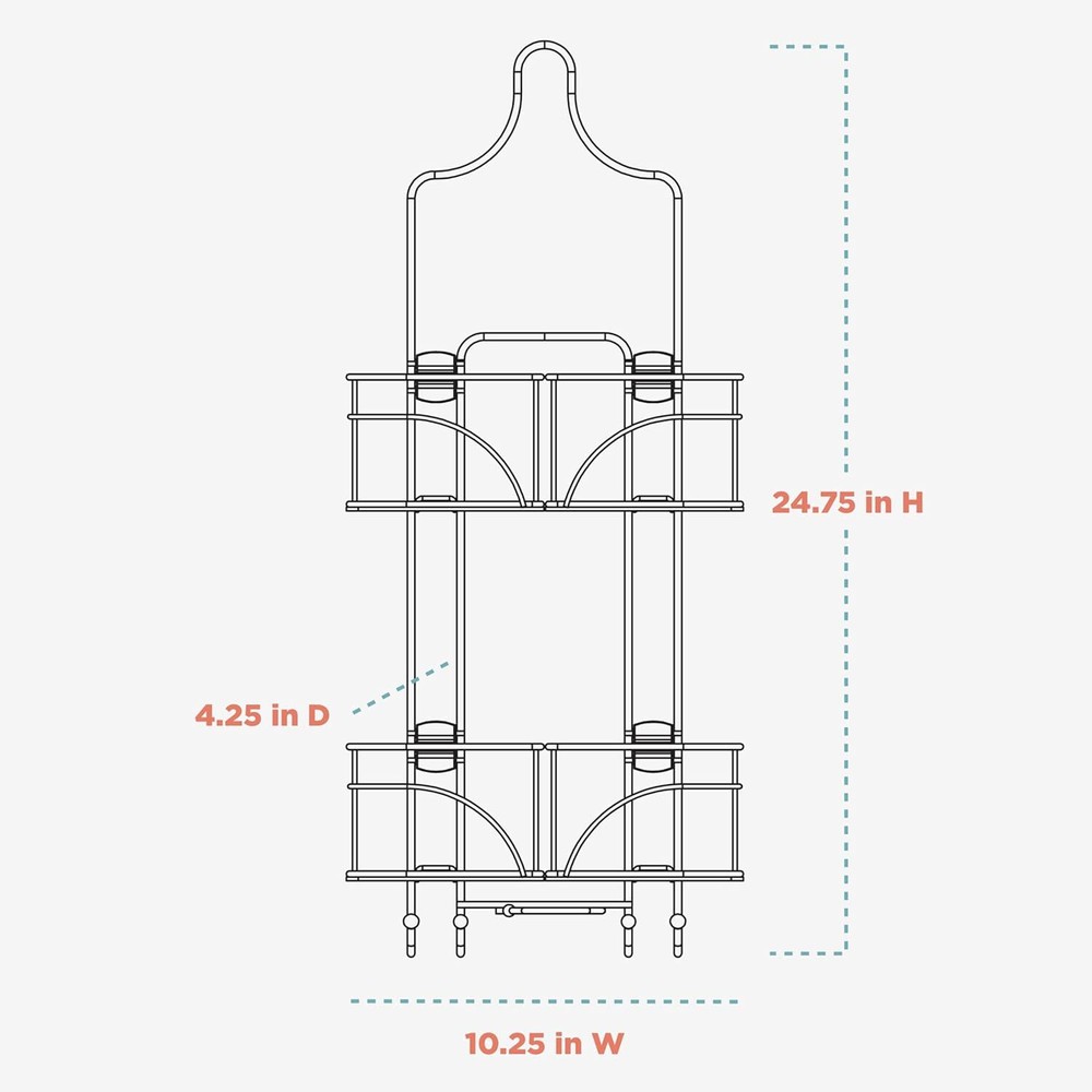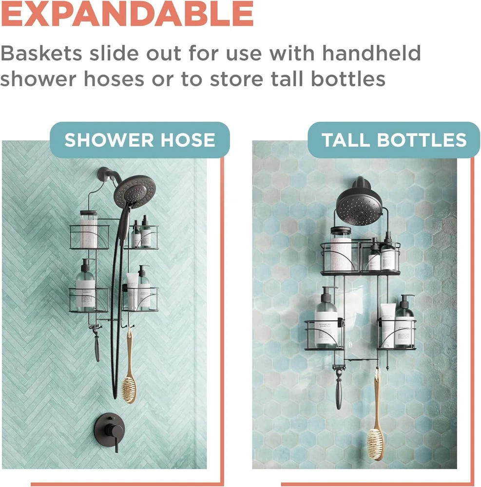 Zenna Home With Baskets That Slide Out to accommodate Hose, Versatile Bronze Product Details Specific Uses For Product: Showers Material: Steel Special Feature: Expandable, Durable, Rust Resistant Color: Bronze Brand: Zenna Home Finish Type: Bronze Product Dimensions: 4.25"D x 10.25"W x 24.75"H Shape: Rectangular Package Type: Standard Packaging Number of Items: 1 Manufacturer: Zenith Products Corporation Item Weight: 2.7 pounds Country of Origin: China Item model number: E7446HB Is Discontinued By Manufacturer: No Fabric Type: Made of Steel Finish types: Bronze Care instructions: Wipe Clean Assembly required: Yes Batteries required: No Included Components: Over-the-shower caddy with storage shelves, hooks and razor holders, Suction cups Mounting TypeItem Weight: Hanging Mount, Wall Mount2.7 Pounds Number of CompartmentsUnit Count: 21.0 Count Made of Steel Versatile Bathroom Storage: This shower caddy hanging over the shower head provides ample space with its 4 expandable baskets, perfect for holding a variety of bathroom essentials like soaps, razors, sponges, shower gels, lotions, and shampoos. Designed for Handheld Showers: This innovative shower rack features sliding baskets that easily make room for handheld shower hoses, ensuring a perfect fit without compromising on storage capacity or accessibility for all your shower essentials. Secure and Easy Installation: Equipped with a non-slip collar, this shower head caddy hanging secures firmly over your shower head. The included suction cups further stabilize the unit, preventing slips, tilts, and any unwanted movement. Heavy-Duty Construction: Made from durable materials, this shower organizer hanging over shower head is built to withstand daily use and resist wear and tear, providing long-lasting, reliable, and sturdy storage for all your bathroom essentials. Rust-Resistant Finish: The chrome finish on this bathroom shower caddy hanging ensures it remains free from rust and corrosion, maintaining its sleek, shiny appearance even in a humid, high-moisture shower environment for years to come. Maximize your shower space with the Zenna Home Hanging Shower Caddy, the perfect solution for your bathroom storage needs. This over the shower head caddy features four expandable baskets that slide outward, offering customizable storage for taller bottles, soaps, and other bath essentials. Designed to work seamlessly with handheld shower heads, this hanging shower caddy ensures your shower hose fits comfortably in the center, providing organized and accessible storage. Crafted for today's modern bathrooms, this shower organizer hanging over the shower head includes dedicated razor holders and plenty of space for shampoo, conditioner, and more. The adjustable baskets accommodate varying sizes of bathroom products, making this shower caddy ideal for anyone needing versatile shower storage. Whether you have a small shower or a spacious one, this hanging shower organizer adapts to your needs, creating a clutter-free environment. Installation is effortless – no drilling or tools required. Simply slip the non-slip collar over your showerhead and use the included suction cups to secure the caddy in place. This heavy duty shower caddy is built to hold up even when fully loaded with bathroom essentials, ensuring it remains stable and secure.