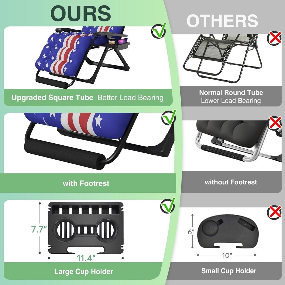 More Sturdy and DurableUpgraded zero gravity chair can bear 440LBS, 40mm(1.6inch) Thickened steel pipe can make the chair not shake and more stable, improve the bearing capacity and durability of the patio chair. Upgrade texlin fabric, double elastic bands,breathable mesh and removable soft cushions add extra comfort.Easier to Adjust and Lock ChairThe third-generation upgraded aluminum alloy lock makes it easier to adjust the chair from 90º to 170º. The 8mm deep groove locks the recliner more firmly, and is more durable than the previous 2-generation 2mm plastic and aluminum buckles, making the recliner safer to use and will not fall from it. Smoothly adjustment, easy to get a stress-free weightlessness, to achieve the best state of relaxation.All-round Comfortable Ergonomic DesignThe Free Shipping Over $49.99* Details Zero Gravity Chair, 26In Lounge Chair, Reclining Camping Chair, Reclining Patio Product Description: More Sturdy and DurableUpgraded zero gravity chair can bear 440LBS, 40mm(1.6inch) Thickened steel pipe can make the chair not shake and more stable, improve the bearing capacity and durability of the patio chair. Upgrade texlin fabric, double elastic bands,breathable mesh and removable soft cushions add extra comfort. Easier to Adjust and Lock ChairThe third-generation upgraded aluminum alloy lock makes it easier to adjust the chair from 90º to 170º. The 8mm deep groove locks the recliner more firmly, and is more durable than the previous 2-generation 2mm plastic and aluminum buckles, making the recliner safer to use and will not fall from it. Smoothly adjustment, easy to get a stress-free weightlessness, to achieve the best state of relaxation. All-round Comfortable Ergonomic DesignThe ergonomically designed reclining chair can effectively reduce the pressure on the shoulder, back and waist. Full-back, adjustable headrest and removable non-slip footrestl can relax the body to the maximum extent.Extra eyemask soft, comfortable to wear and 100% shading. Earplugs fit the ear canal, reducing the noise of various environments, allowing you to sleep peacefully. Softer Cushion & Larger Cup HolderCushion Dimension59.8"L x 20.9"W. Thickened 4" cushion is softer and more comfortable. The cushion is removable, and has good ventilation even in summer, which is convenient for use in winter and summer. Multifunctional Large Cup Holder size11.4"L x 7.7"W, can not only store mobile phones, water glasses and keys, etc., but also hang bags. Portable and VersatileThis foldable lawn chair needs no assembly and can be folded and unfolded in seconds. The lightweight folding design is easy to carry, suitable for yards, lawns, terraces, decks, gardens, courtyards, balconies, pools and beaches etc.