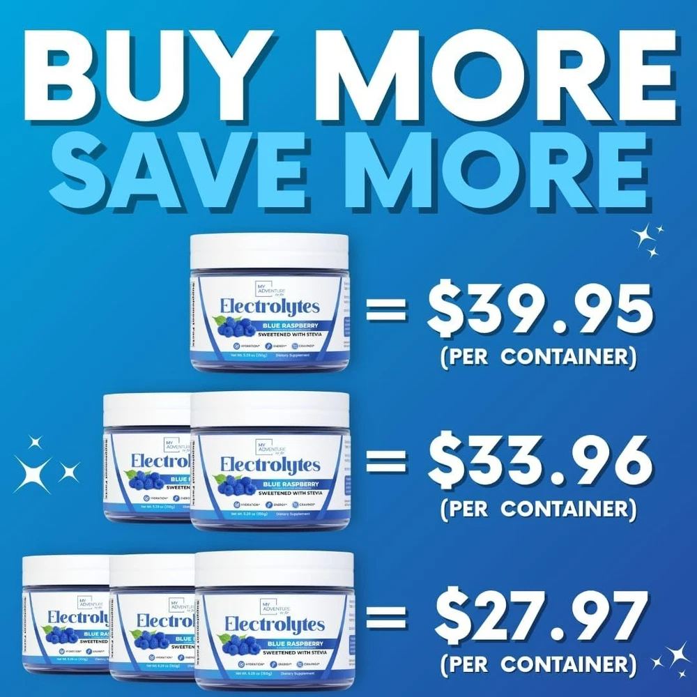 Zero Sugar - Blue Raspberry Electrolytes Powder - Refreshing Hydration - Caffeine Free Energy - All Natural Ingredients - Vegan, Keto and Paleo - Sugar Free Electrolyte Powder Drink Mix - 37 Servings Flavor Blue Raspberry Unit Count 5.29 Ounce Item Form Powder Item Weight 6.4 ounces Item dimensions L x W x H 2.75 x 2.75 x 2.5 inches Special Ingredients Stevia Diet Type Keto Product Benefits Supports Electrolyte Balance Age Range (Description) Adult About this item Quench Your Thirst - Dive into the ultimate hydration experience with our Blue Raspberry Electrolytes Powder. Perfectly crafted to replenish your body, this electrolytes powder no sugar formula ensures every sip is filled with the goodness of electrolytes, making it your go-to hydration partner. Whether you're tackling intense workouts or just need a refreshing drink, our blue raspberry electrolytes deliver on taste and hydration. Crush Your Cravings - Satisfy your sweet tooth without the guilt! Our sugar free electrolytes powder is naturally sweetened with Stevia, offering a delicious Blue Raspberry flavor that curbs cravings instantly. Ideal for those on a ketogenic diet, our keto electrolytes powder seamlessly fits into your lifestyle, allowing you to manage your cravings while staying on track. Caffeine Free Energy - Experience a steady, natural boost of energy with our caffeine-free formula. Infused with essential nutrients, our electrolyte powder enhances your energy levels without the jitters or crash associated with caffeine. Perfect for any time of the day, this hydration powder keeps you energized and focused. Sweetened With Stevia - Enjoy the luscious taste of blue raspberry electrolytes without any added sugars. Our electrolight powder is thoughtfully sweetened with Stevia, providing a guilt-free way to stay hydrated and indulge in a sweet treat. It's the perfect balance of flavor and health, making it a family-friendly choice for all. Refreshing Hydration With Zero Sugar - Elevate your hydration game with our electrolytes powder sugar free formula. Designed for maximum refreshment without the sugar, our Blue Raspberry electrolytes drink mix is your ally in achieving optimal hydration and pH balance. Whether you're in the gym, on a hike, or need a refreshing break, our hydration powder delivers unparalleled taste and hydration benefits. Product details Product Dimensions : 2.75 x 2.75 x 2.5 inches; 6.4 ounces Item model number : KEMAF42 Date First Available : November 15, 2023 Manufacturer : My Adventure to Fit Country of Origin : USA Important information Safety Information Consult with a physician prior to taking if you are pregnant, nursing or taking any medication. Keep out of children's reach. Ingredients Potassium Citrate, Citric Acid, Magnesium Citrate, Himalayan Pink Salt, Stevia Leaf Extract, Silica (Mineral), Calcium Ascorbate, Malic Acid, Calcium Citrate, Blue Spirulina Extract, Natural Blue Raspberry Flavor, Zinc Citrate, Manganese Gluconate. Directions Mix one scoop with 10-16oz of water. Add ice for best taste Take 1 or more scoops daily for optimal hydration. Legal Disclaimer Statements regarding dietary supplements have not been evaluated by the FDA and are not intended to diagnose, treat, cure, or prevent any disease or health condition. Product Description