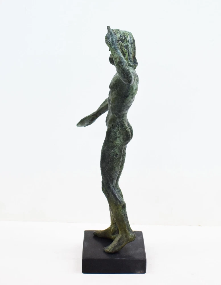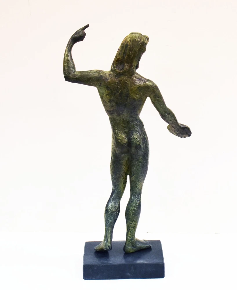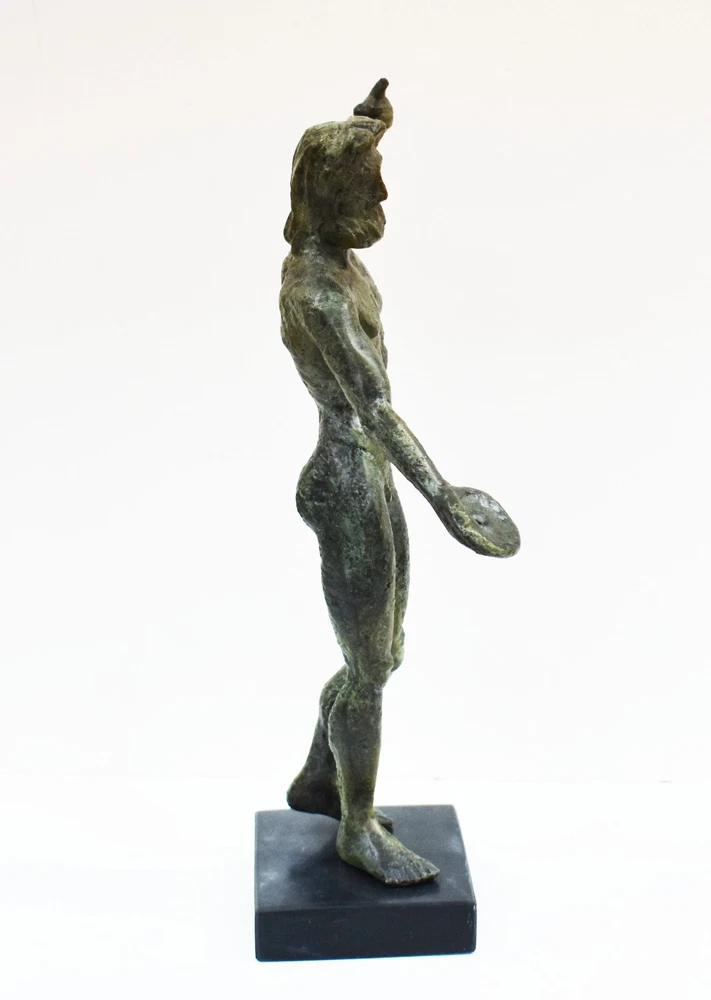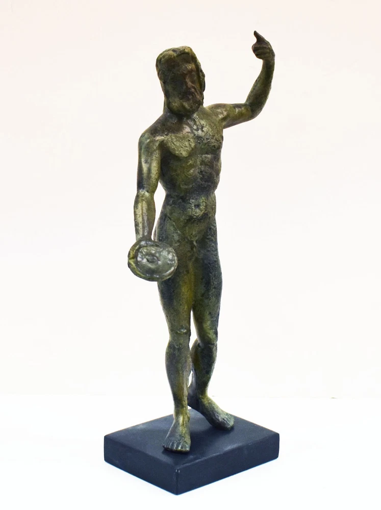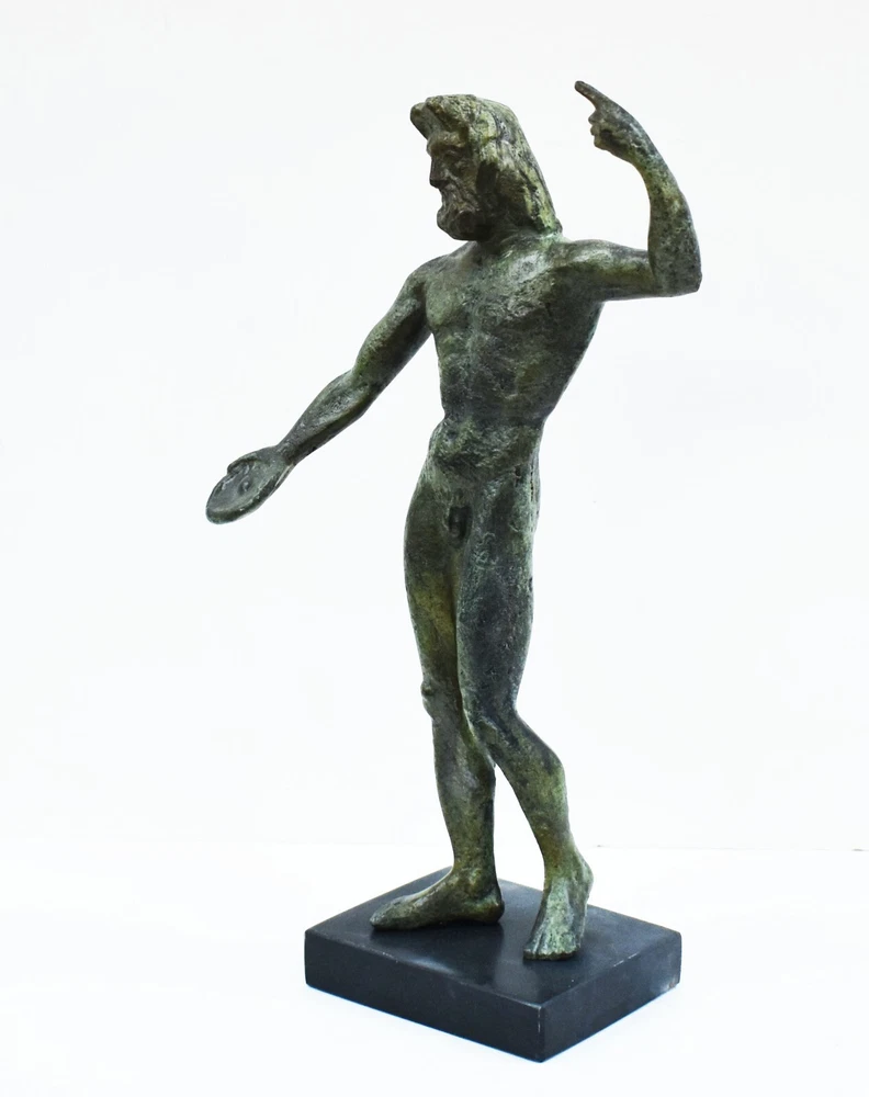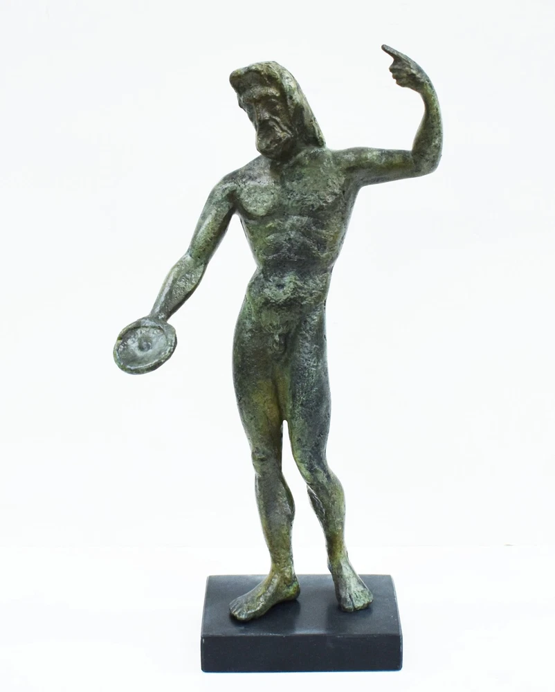 ZEUS BRONZE STATUE Zeus was the sky and thunder God in ancient Greek religion, who ruled as king of the Gods of Mount Olympus. Zeus is the child of Cronus and Rhea, the youngest of his siblings to be born, though sometimes reckoned the eldest as the others required disgorging from Cronus's stomach. In most traditions, he is married to Hera, by whom he is usually said to have fathered Ares, Hebe, and Hephaestus. Zeus was also infamous for his erotic escapades. These resulted in many godly and heroic offspring, including Athena, Apollo, Artemis, Hermes, Persephone, Dionysus, Perseus, Heracles, Helen of Troy, Minos, and the Muses. All our bronze items, are cast in Greece, using the traditional 'lost wax' method. As nothing is mass-produced, there will inevitably be slight variations in patination and colouring. Each piece is, therefore, unique.(25-547-A) Details: Condition: New, Handmade in Greece Material: Pure Bronze Height: 28 cm(11 inches) Width : 15 cm(5.9 inches) Weight : 2.1 kg