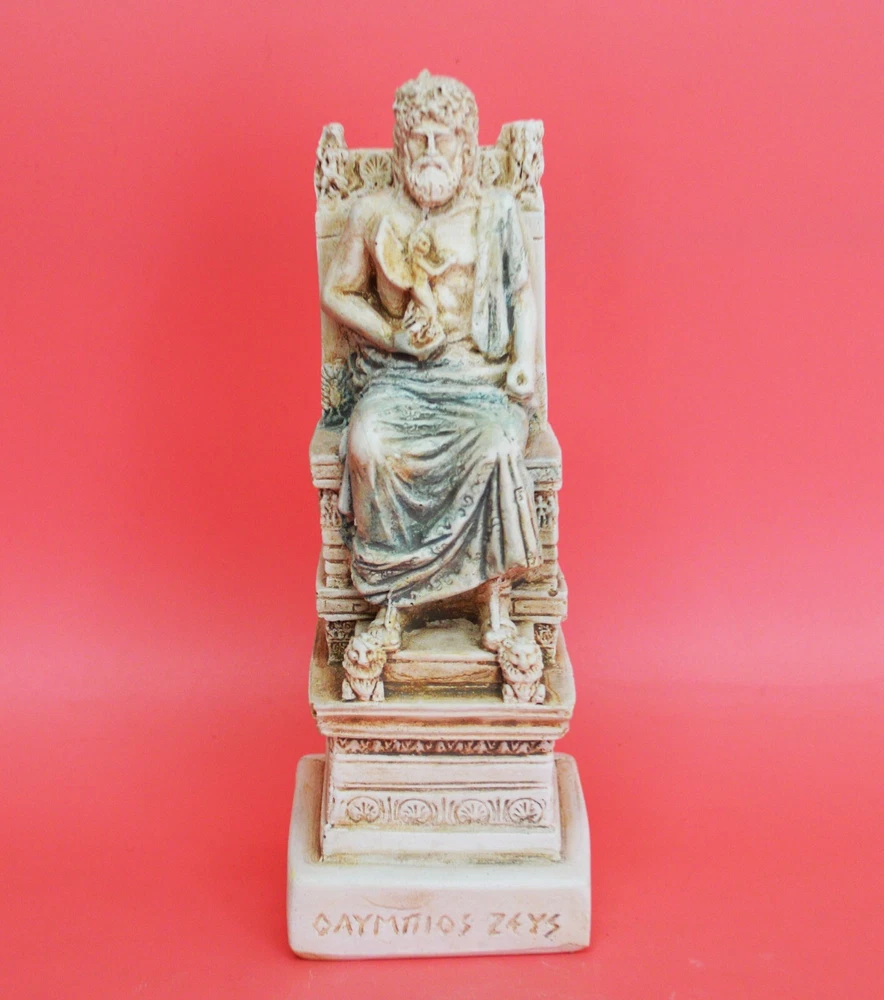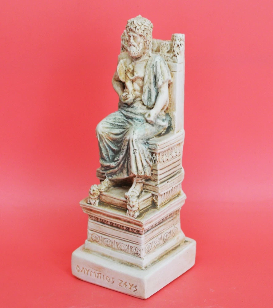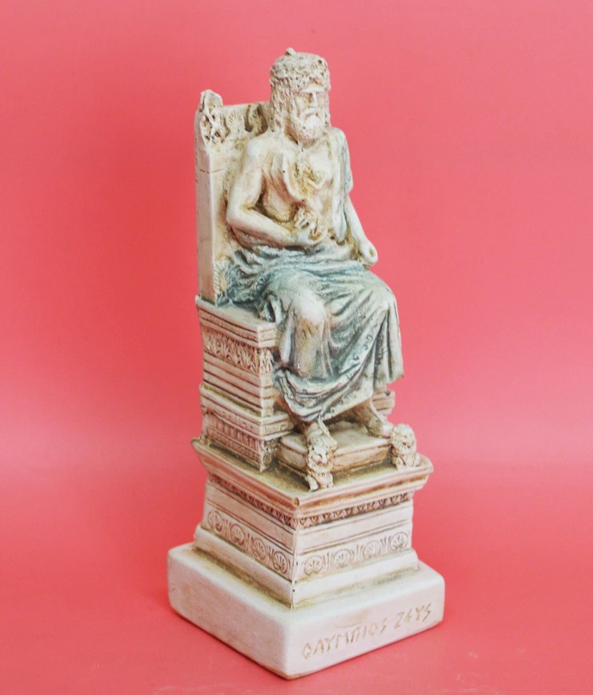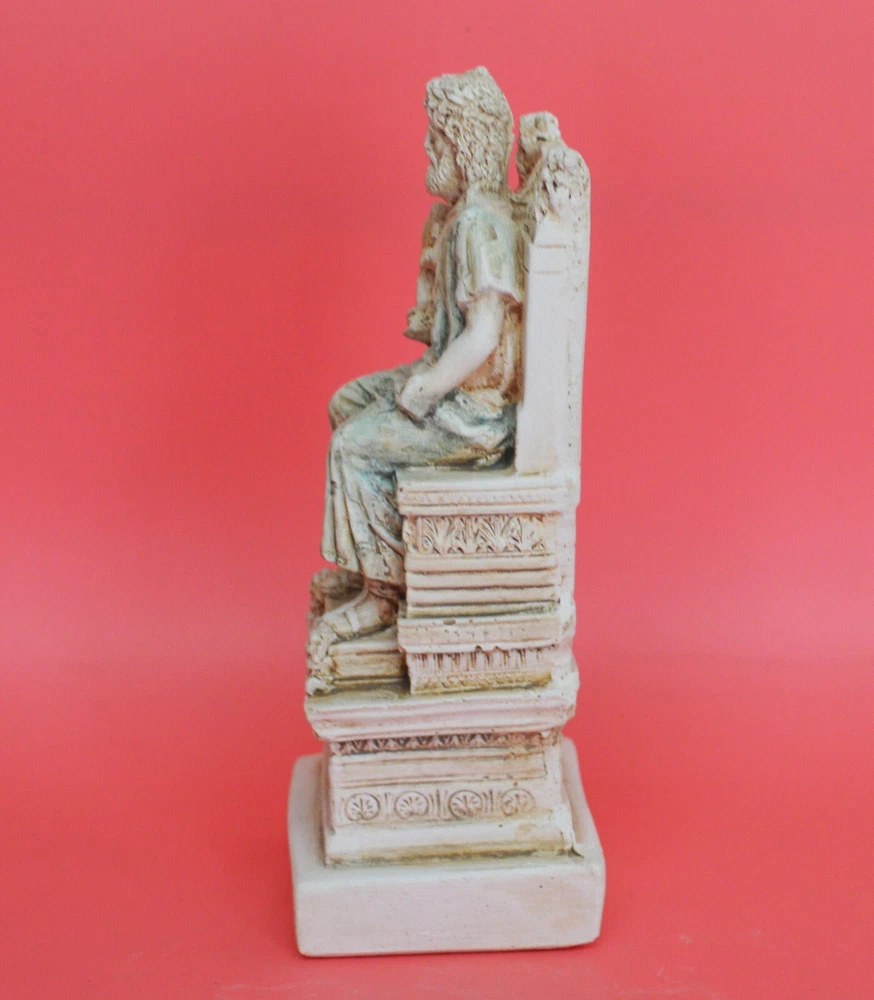 ZEUS KING OF THE GODS SMALL STATUE Zeus was the sky and thunder God in ancient Greek religion, who ruled as king of the Gods of Mount Olympus. Zeus is the child of Cronus and Rhea, the youngest of his siblings to be born, though sometimes reckoned the eldest as the others required disgorging from Cronus's stomach. In most traditions, he is married to Hera, by whom he is usually said to have fathered Ares, Hebe, and Hephaestus. Zeus was also infamous for his erotic escapades. These resulted in many godly and heroic offspring, including Athena, Apollo, Artemis, Hermes, Persephone, Dionysus, Perseus, Heracles, Helen of Troy, Minos, and the Muses. Please be aware that, due to the fact that our products are either individually cast, carved, hand painted and hand finished, there will inevitably be minor variations in size, colour and texture.(B31) Details: Condition: New, Handmade in Greece Material: Casting stone Height: 16.5 cm - 6.5 inches Width: 5.5 cm - 2.1 inches Length: 5.5 cm - 2.1 inches Weight: 360 g ********