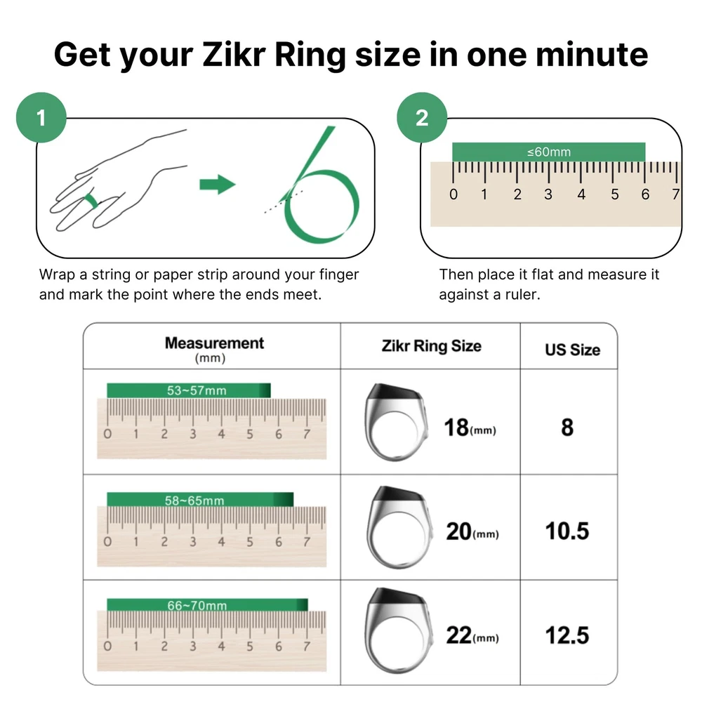 Perform your tasbih counts effortlessly with the Zikr Ring Flex and Flex Pro, brought to you by the makers of the best-selling Zikr Ring. Wherever you are, at any time, embrace the convenience of tracking your daily dhikr with our visual record-keeping app, designed to inspire and enhance your spiritual practice. Find the perfect fit for your finger with our Zikr Ring Flex, offering compatibility across three different sizes. Unsure of your ideal size? Don't worry! Our box includes one core component and three rings, ensuring there's always a size suitable for you. Stay connected to your prayers with the Zikr Ring Flex. Thanks to its built-in Bluetooth technology, effortlessly connect to the iQibla app and receive five prayer time reminders directly through your ring or mobile app. Never miss an important prayer again. Experience the ease of daily tasbih counting with the Zikr Ring Flex. Equipped with a CNC button, effortlessly track your counts up to 9999. Feel the gentle vibrations at 33, 66, 99, or 100 counts, and customize further vibration options like 133, 166, 199, 200, and more with our app upgrade (available). Stay informed with the built-in 0.42" OLED display of the Zikr Ring Flex. View the time, your tasbih counts, and prayer times at a glance, adding convenience to your daily routine. Enjoy uninterrupted usage with the Zikr Ring Flex's high-capacity battery. With up to 7 days of normal use, feel confident throughout your spiritual journey. Charge your ring anywhere, anytime using an adapter, mobile power, or computer via USB cable. Immerse yourself in a sleek and lightweight design, weighing only 7.8g. The Zikr Ring Flex ensures a comfortable and stylish wearing experience, enabling you to focus solely on your spiritual connection. Connect seamlessly to the iQibla app with the Zikr Ring Flex's built-in Bluetooth 5.1. Access accurate Qibla directions, synchronize data with your smartphone and Qibla watch, and unlock the power of our Smart iQibla AP Innovative Design: Introducing Zikr Ring Flex, the latest product from the makers of the best-selling Zikr Ring. With its sleek and lightweight design weighing only 7.8g, it offers a comfortable and stylish wearing experience. Convenient and Versatile: Easily perform your tasbih counts anytime, anywhere with the Zikr Ring Flex. It features a CNC button for effortless daily tasbih counting, with vibrations at 33, 66, 99, and 100 counts. You can also customize the vibration for subsequent numbers through an app upgrade. Enhanced Functionality: Stay connected with the iQibla app using the built-in Bluetooth 5.1 of the Zikr Ring Flex. Receive 5 prayer time reminders directly through the ring or mobile app, ensuring you never miss an important prayer. Customizable and Accommodating: The Zikr Ring Flex offers three different ring sizes in one box, providing the perfect fit for everyone. Don't know which size suits you best? No problem. With the variety of sizes available, you can easily find the one that's suitable for you. Long-Lasting Battery Performance: Enjoy up to 15 days of normal use with the high-capacity battery of the Zikr Ring Flex. It can be conveniently charged using an adapter, mobile power, or computer via USB cable. Additionally, the built-in OLED display shows the time, tasbih counts, and prayer times for added convenience. Regenerate response