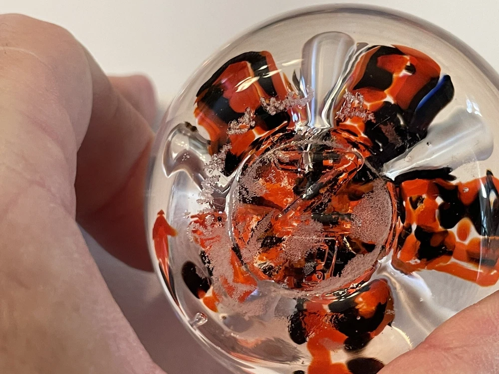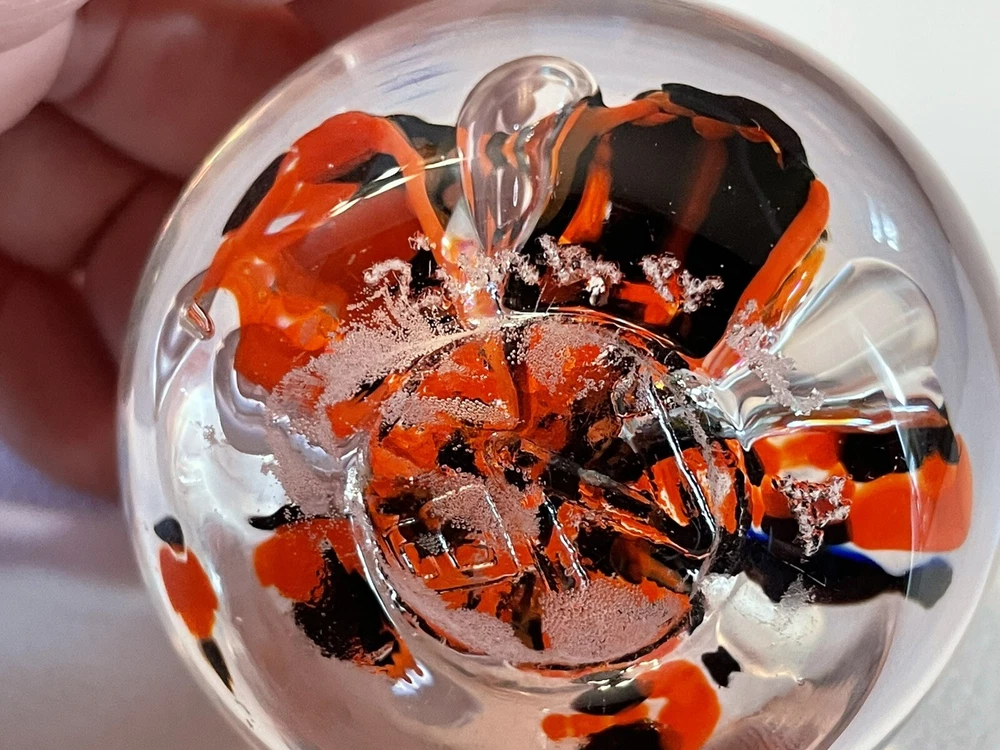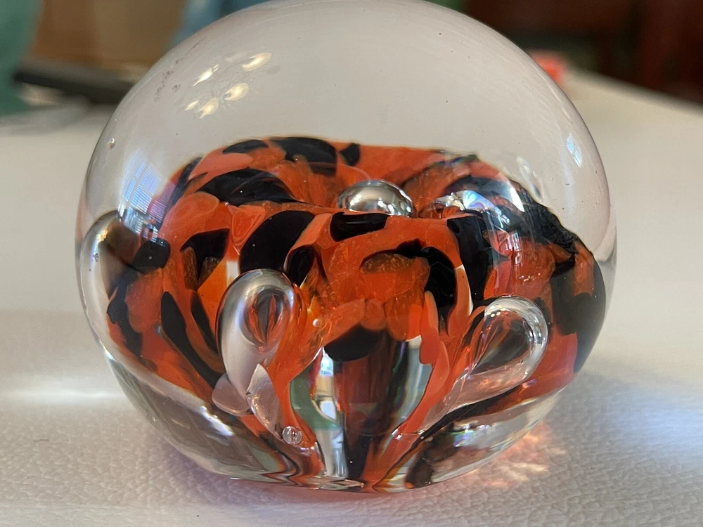 The Zimmerman signed art glass desk paperweight features a striking design of orange and black floral. Z embossed on bottoms of paperweight. Engraved Zimmerman but 1st name and year are hard to determine. 2 surface scratches slight 1/4 - one pen point size. One small air bubble.