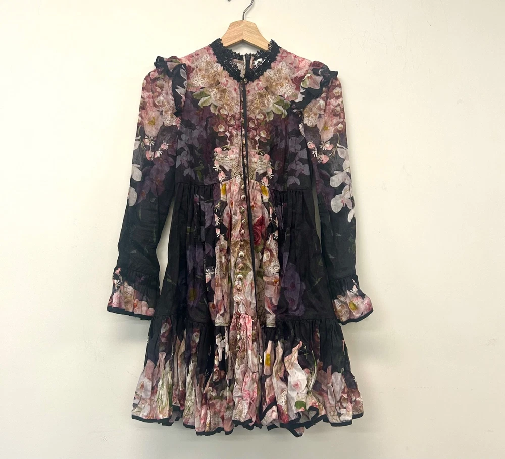 Zimmermann Black & Pink Floral Tie Neck Dancer Mini Linen Dress Size OP The Dancer Tie Neck Mini in Black Garden Floral A linen mini dress in a black with pink and cream garden motif, featuring an empire waist, straight sleeves with fluted cuffs, frills at collar shoulders and hem. Also features an adjustable velvet lace neck tie and a dropped hem 100% Linen Size OP Pls refer to brands offical website for more details on their sizing Fitted bodice Relaxed skirt with frill hem Frills throughout Flower studded button and loop closure down centre front Fabric covered buttons Black lace semi high neckline Velvet adjustable neck tie (can be tied in pussy bow) Contrast stitching throughout Pockets either side Fully lined Excellent condition If you have any questions or require more details, photos ect pls don’t hesitate to msg me Pls check out my other listings - am open to reasonable offers (no low balls pls) and happy to combine postage #designer #australian #alemais shona joy alice mccall acler aje spell