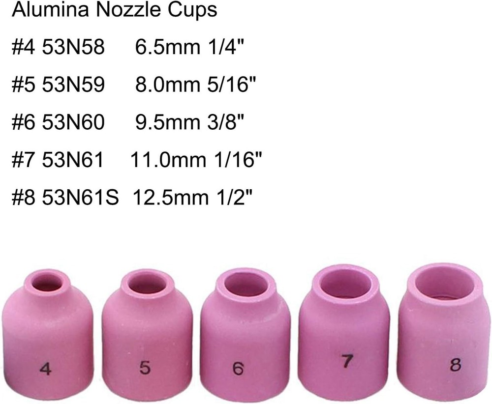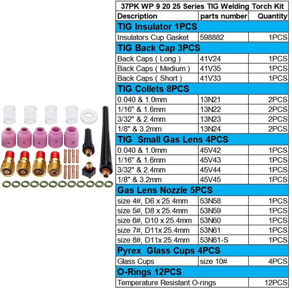 Zinger 37pcs TIG Welding Torch Gas Lens Kit Accessories for DB SR WP 9 20 25 Tig Welding Torch,with #10 Cup+Alumina Nozzle+Collet+Gas Lens Collets Body +Cup Gasket etc Product Details Manufacturer: Zinger Item Weight: 7.8 ounces Package Dimensions: 5.2 x 3.6 x 3.3 inches Is Discontinued By Manufacturer: No Material: Other Item Package Quantity: 1 Batteries Included?: No Batteries Required?: No 37pcs tig welding torch stubby gas lens kit accessories for:PTA DB SR WP 9 20 25 Tig Welding Torch 1pcs Tig insulator Cup Gaskets+4 pcs #10 Glass Cup 8pcs TIG Collets +4pcs TIG Gas Lens Collets Body 3pcs TIG back cup+ 5PCS TIG Alumina Nozzle Cup+12 pcs Temperature Resistant O-rings Zinger 37pcs TIG Welding Torch Gas Lens Kit Accessories for DB SR WP 9 20 25 Tig Welding Torch Fit for:PTA DB SR WP 9 20 25 Tig Welding Torch 37pcs Tig welding Torch Accessories including: 1pcs Tig insulator Cup Gaskets 598882 1 pcs 41V33 Short Back Cup 1 pcs 41V35 Medium Back Cup 1 pcs 41V24 Long Back Cup 4 pcs #10 Glass Cup 1pcs 45V42 0.040"(1.0mm )TIG Stubby Gas Lens Collets Body 1pcs 45V43 1/16" (1.6mm) TIG Stubby Gas Lens Collets Body 1pcs 45V44 3/32" (2.4mm) TIG Stubby Gas Lens Collets Body 1pcs 45V45 1/8"(3.2mm) TIG Stubby Gas Lens Collets Body 1pcs #4 53N58 TIG Alumina Nozzle Cup D6.5mm 1/4"x 25.50 mm 1pcs #5 53N59 TIG Alumina Nozzle Cup D8.0mm 5/16"x 25.50 mm 1pcs #6 53N60 TIG Alumina Nozzle Cup D9.5mm 3/8"x 25.50 mm 1pcs #7 53N61 TIG Alumina Nozzle Cup D11.0mm 7/16"x 25.50 mm 1pcs #8 53N61S TIG Alumina Nozzle Cup D12.5mm 1/2"x 25.50 mm 2pcs 13N21 Collets for tig welding torch 0.040"(1.0mm) 2pcs 13N22 Collets for tig welding torch 1/16" (1.6mm) 2pcs 13N23 Collets for tig welding torch 3/32" (2.4mm) 2pcs 13N24 Collets for tig welding torch 1/8" (3.2mm) 12 pcs Temperature Resistant O-rings