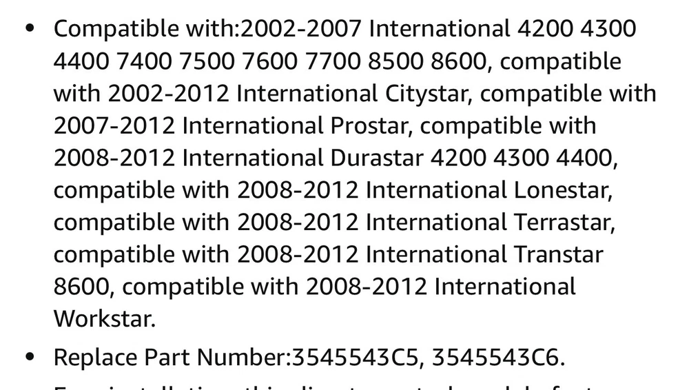 New just opened for pictures Compatible with:2002-2007 International 4200 4300 4400 7400 7500 7600 7700 8500 8600, compatible with 2002-2012 International Citystar, compatible with 2007-2012 International Prostar, compatible with 2008-2012 International Durastar 4200 4300 4400, compatible with 2008-2012 International Lonestar, compatible with 2008-2012 International Terrastar, compatible with 2008-2012 International Transtar 8600, compatible with 2008-2012 International Workstar.