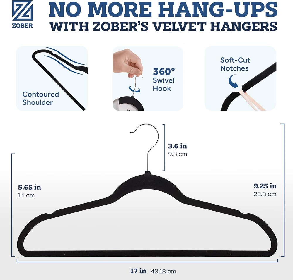 Zober Velvet Hangers 50 Pack - Heavy Duty Black for 50 Pack, Description Features: DURABLE SWEATER HANGERS - Featuring smooth, black, non-slip velvet, 360 degree swivel hooks, and notched shoulders, this coat hanger set makes storage simple and stylish. STRONG & FIRM GRIP - Whether you need to hang up a 10 lb coat or a thin satin top, these non slip hangers have you covered. The strong hold and grip on this coat hanger will keep your clothes happily hung! SAVES SPACE - We've designed these felt hangers for all of your closet clearing and organizational purposes. The slim design makes these hangers space saving wonders for your storage needs. PRESERVES CLOTHING SHAPE - Our clothing hangers' design doesn't stop at strength. Not only are our space saving hangers non slip, but the curved shoulder line preserves the natural shape of your clothing. ADDED HORIZONTAL BAR - This velvet hanger pack includes a connected bar design, so you don't have to just use them as shirt hangers - you can use them as pants or suit hangers too! Product Details: Color: Black Brand: ZOBER Material: Velvet Product Dimensions: 17"W x 9.25"H Special Feature: Anti Slip,Slim,Space Saving Recommended Uses For Product: Sweater, Dress, Shirt, Suit, Coat Number of Pieces: 50 Number of Items: 1 Shape: Triangular Finish Type: Chrome Size: 50 Pack Maximum Weight Recommendation: 4.5 Kilograms Manufacturer: ZOBER Item Weight: 7.5 pounds Item model number: ZO-V301/50 Is Discontinued By Manufacturer: No Handling We will ship all orders within 3 business day of payment. Delivery We take pride in offering fast and reliable delivery for your orders! We are committed to getting your products to you as quickly as possible. Generally, we would like to inform you that all orders will be delivered to you within 1-3 business days after processing.However, in some cases, delivery times may vary depending on the buyer's location. Especially in remote or rural areas, the expected delivery time may be extended. In such situations, we do our best to ensure that your order reaches you as quickly as possible.If there are any delays, we will be happy to contact you to explain the situation. Our goal is to enhance your satisfaction with our fast delivery times. We work diligently to ensure that your order arrives safely.Trust us and enjoy our speedy delivery! Return Policy All items qualify for returns within 30 days of receipt. Buyer is responsible for return shipping on any item that is not damaged. Feedback We take our reputation seriously, we buy and sell online, so we understand the value of trust. If you are unsatisfied with your order, please contact us and we will work with you to resolve it to your satisfaction.