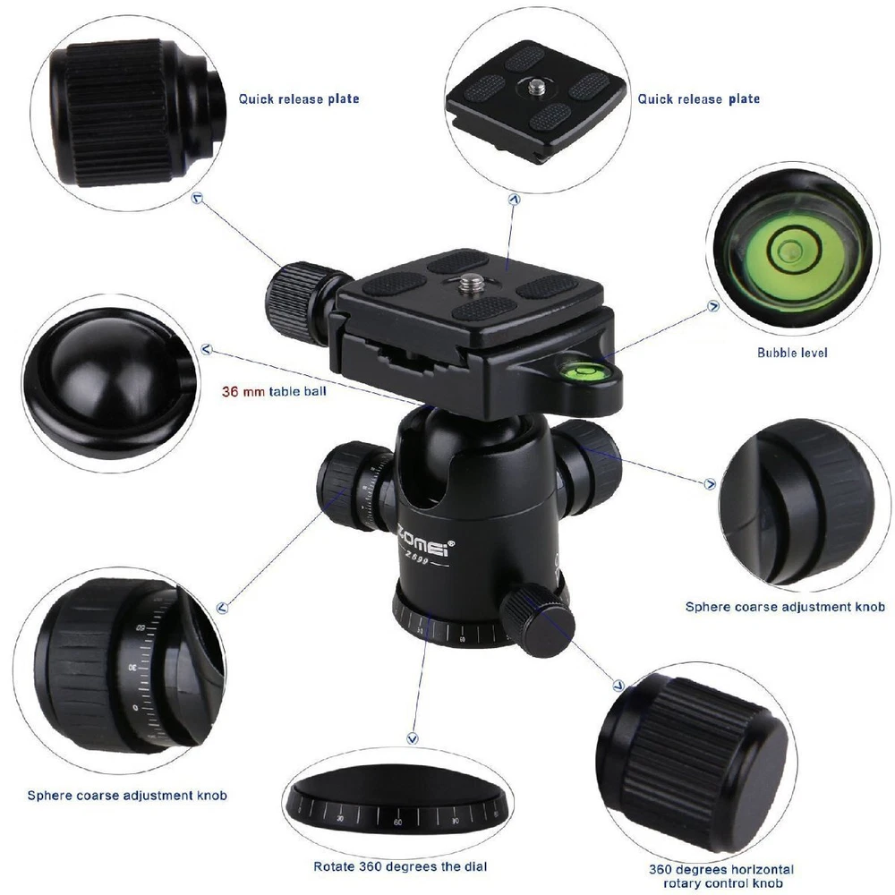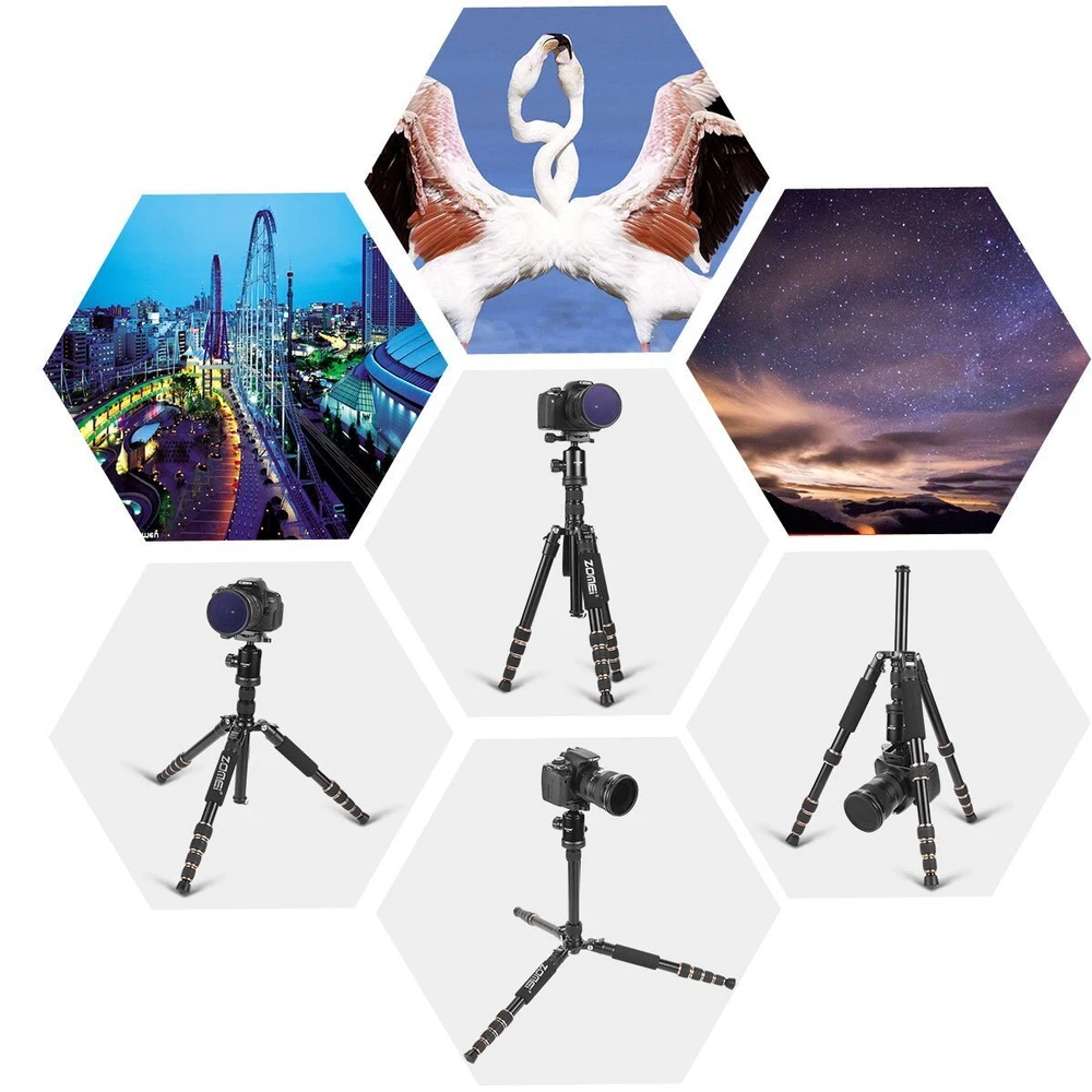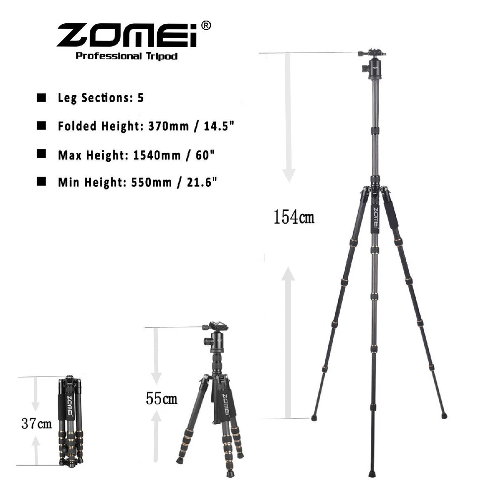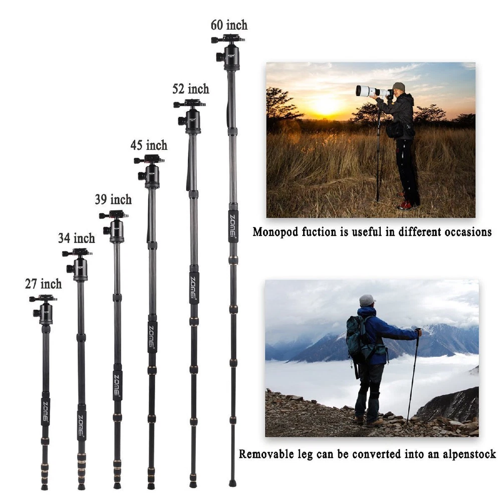 Zomei Z669 Magnesium Aluminum Alloy Travel Camera Tripod with Ball Head for Canon Sony DSLR SLR Cameras Item Description 2 IN 1 TRIPOD: 2 IN 1 tripod that transforms into a full size monopod by screwing on the center pole and detachable tripod leg. COMPACT & LIGHTWEIGHT: The tripod legs can be flipped 180 degrees and folded back, with a compact size of 13.8 inches, it saves space and is small enough to carry anywhere. It weighs only 3.62 lbs, perfect for indoor and outdoor photography. DURABLE & STRONG: The maximum load of this tripod is 28.66LB 13KG , so it can hold your DSLR camera and other gears safely. PORTABLE & CONVENIENT: It is convenient for travel and comes with a padded carrying case with a good shoulder strap for protection Payment Shipping Return Policy International Buyers Please Note Import duties, taxes, and charges are not included in the item price or shipping cost. These charges are the buyer's responsibility. Please check with your country's customs office to determine what these additional costs will be prior to bidding or buying.