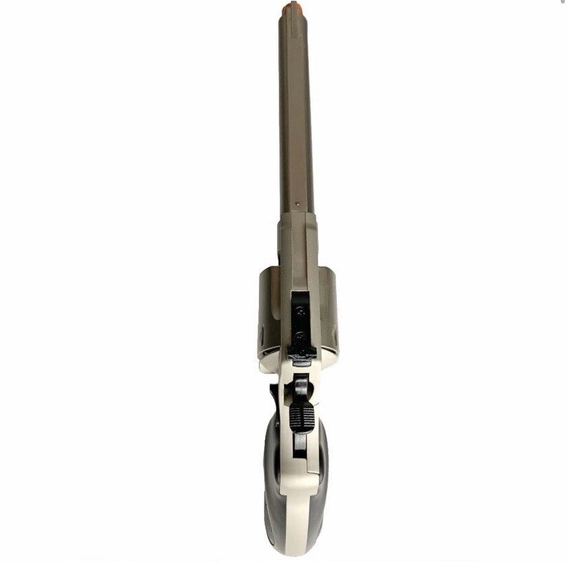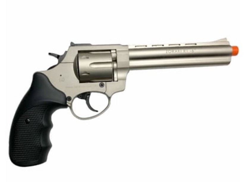 This is a replica of This classic style revolver is sleek, reliable and a great value for the price. The action works just like the original, with a 6 shot cylinder that swing. This replica gun is perfect for movies, collecting or firearms training. Features: Double Action Cylinder (drum) release button at the side Steel / zinc alloy shell extractor Steel / zinc alloy cylinder (drum) Hardened steel cylinder (drum) lock Hardened cylinder (drum) revolver Zinc alloy frame Specifications Magazine Capacity: 6 Barrel Length: 6" Overall Length: 10.82" Height: 5.51" Width: 1.41" Weight: 1.96 LBS Finish: Satin The item description has the following disclaimer: “This replica gun contains the colored markings required by law, including a permanently attached orange plug.”