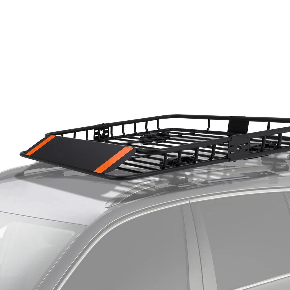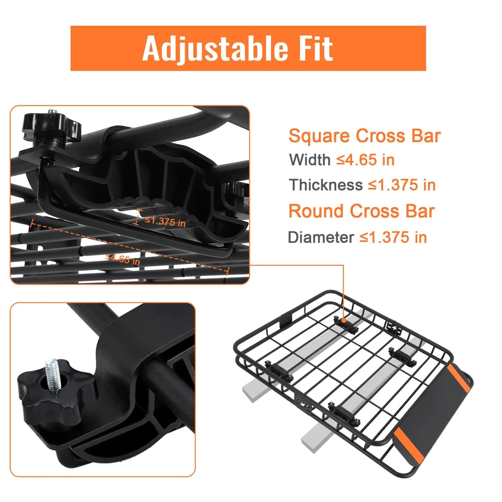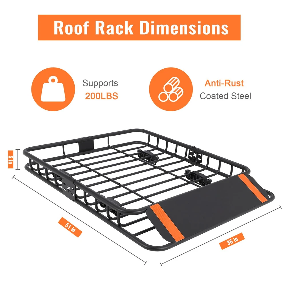 【Versatile Design】- Featuring 5" high metal side rails to keep your items secure while on the road, this roof rack basket is perfect for storing extra luggage, camping gear, cargo bags, and more. Ideal for those living the outdoor adventurer lifestyle. 【Dimension and Load Capacity】- Measuring at 51" x 36" x 5", this universal roof rack cargo basket boasts a 200 lb capacity and extendable design. Easily attachable to vehicles with cross bars, from cars to trucks and SUVs. 【Easy Installation】- Effortlessly attach this hitch cargo carrier to most roof racks for quick and secure mounting. Complete with a car roof rack wind deflector for a peaceful travel experience. Maximize your roof rack storage with convenience. 【Solid Construction】- Engineered to withstand heavy loads, our roof basket is constructed from high-quality materials for durable performance on your roof and cargo racks. Enhance your roof rack storage with our range of accessories to customize and optimize your setup. 【Rust & Corrosion-Resistant Construction】- Crafted from durable powder-coated steel, this roof rack offers long-lasting corrosion resistance. To maintain its condition, it is advisable to park your vehicle indoors when not in use.