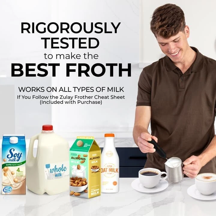 Zulay Powerful Milk Frother Wand - Mini Handheld Black & Copper Product Details Brand: Zulay Kitchen Special Feature: Powerful Motor Color: Black & Copper Material: Stainless Steel Recommended Uses For Product: All Types Model Name: FrothMate Milk Frother Included Components: Stand Not Included Product Care Instructions: Hand Wash Only Style: Mighty Frother Number of Batteries: 2 Number of settings: 2 Power Source: Battery Powered Wattage: 800 watts Manufacturer: Zulay Kitchen Package Dimensions: 9.06 x 1.65 x 1.3 inches Item Weight: 2.89 ounces Country of Origin: China Item model number: FrothMate Milk Frother POWERFUL FROTHING EXPERIENCE: Skip the coffee shop run and enjoy lattes, cappuccinos, matcha, hot chocolate, powdered drinks, or iced coffee at home with this milk frother. With a 13,000 RPM motor and 26 spiral rings, this coffee foam maker turns ordinary milk to frothy perfection in seconds. MATCHA, COFFEE, & MORE: This matcha whisk works better than a manual bamboo whisk for making matcha tea and works just as well for coffee. It is designed to work on all types of milk, such as half and half, soy, almond, oat, cashew, hazelnut, whole milk, low-fat, skim milk, and other dairy items like butter or cream. This also works great as a powder mixer and can even whisk eggs. EASY TO CLEAN AND STORE: This hand frother can be cleaned by placing the whisk under running water and briefly turning it on; wipe the handle with a damp cloth. The compact size of this milk foamer allows it to be stored in kitchen drawers without taking up too much space. SIMPLE TO USE: All it takes is pressing the on/off button to make a cup of frothy latte, mix protein powder, or even whisk up some eggs for a perfect omelet with this electric whisk. Make this drink mixer an addition to your coffee bar, or take it anywhere for a caffeine boost.