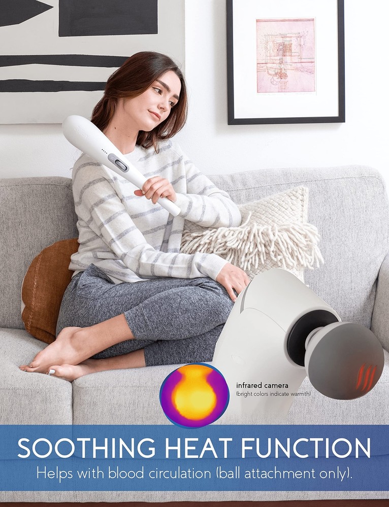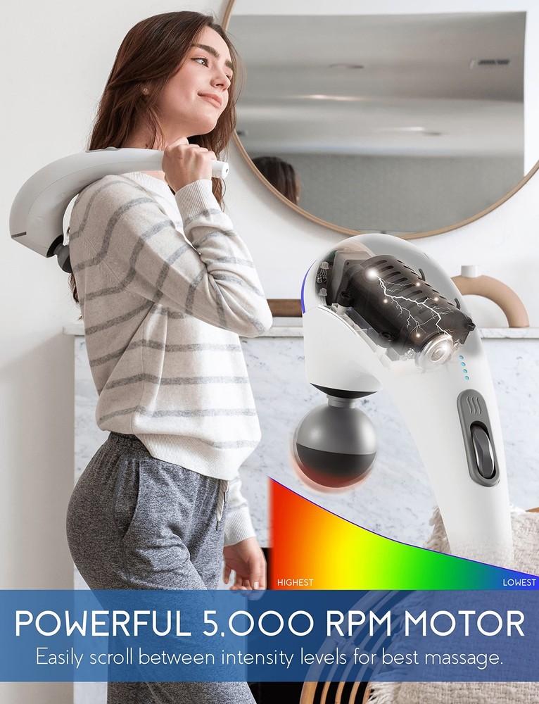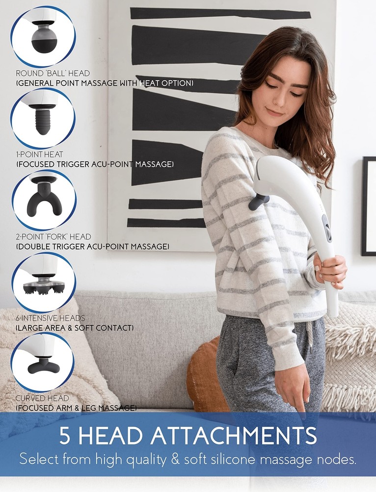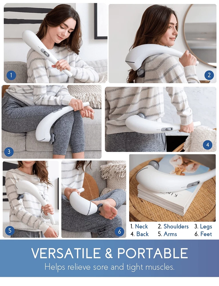 Zyllion Handheld Back and Neck Massager - Cordless Rechargeable Electric Vibrating Deep Tissue Massage with Heat for Athletes, Recovery and Muscle Pain Relief - White (ZMA-27-WT) Product Details Color: White Brand: Zyllion MPN: ZMA-27 UPC: 850001290173 EAN: 0850001290173 Use for: Whole Body Power Source: Battery Powered Material: Silicone Item Weight: 2.2 Pounds Brand: Zyllion Product Dimensions : 8.5 x 1 x 16 inches; 2.2 Pounds Item model number : ZMA-27 Department : unisex-adult Batteries : 1 Lithium Polymer batteries required. (included) Date First Available : November 10, 2020 Manufacturer : Zyllion POWERFUL 5,000 RPM PERCUSSION MOTOR: is the most powerful handheld massager in the market that gets real deep into the muscle tissue to help ease and relax muscle cramps, knots, tensions and strains. This high intensity massager effectively increases blood flow to relieve muscle pain in seconds. ERGONOMIC, CORDLESS AND RECHARGEABLE DESIGN: features a curved shape that allows you to easily reach behind your back and massage hard to reach areas, getting both your upper and lower back. The 2200mah battery capacity last up to 180+ minutes (at full charge). Versatile and powerful enough for any professional athlete and for in-home use, muscle therapy and recovery. INTUITIVE LED INDICATOR AND USER-FRIENDLY SCROLL WHEEL: helps you find the perfect intensity. The led lights changes different colors from blue, green, orange and red (lowest to highest intensity). To turn on, simply scroll up and choose between intensities by scrolling further up or down. No need to press or hold any buttons. SOFT SILICONE HEADS AND BALL ATTACHMENT WITH HEAT: comes with 5 different node attachments specialized for different parts your body. The ball node attachment features a soothing heat function unlike other cordless handheld massagers to help with blood circulation by transferring warmth to the muscles to ease fatigue. LIFETIME CUSTOMER SERVICE SUPPORT: our products are covered by a 1-year warranty (2 years with registration). 100% satisfaction means the world to us and if anything happens to your device within a 1-year period, well send you a replacement at no cost to you. Our mission is to help you unwind and regain balance in your life, which is why we strive to bring the most therapeutic and innovative health and personal care products. Zyllion ZMA-27 Handheld Cordless Rechargeable Percussion Massager From Zyllion, Relaxation Meets Innovation! Unlike other handheld massagers, our advanced and intuitive features include: Powerful 5,000 RPM motor, most powerful in the market.Ergonomic curved shape, easily reach behind your back.Softer silicone head attachments for a more comfortable massage.Ball attachment with heat for better blood flow and circulation.LED intensity indicator to easily switch between low and high intensity levels. 5 Interchangeable Massage Nodes Each massage head is easy to remove and install: Round "Ball" Head - General point massage.1-Point Head - Focused trigger acu- point massage.2-Point "Fork" Head - Double trigger acu-point massage.6-Intensive Head - Large area soft contact massage.Curved Head - Focused arm and leg massage. Rechargeable 2200mAh Battery Capacity Recharges to full in only 2 hours, allowing you to use the massager for up to 180+ minutes. 4 white LED lights = Full, 1 White LED = Low. Ball Attachment with Heat Function The heating function only works if the ball massage head is attached. After turning on the massager, press the heating button to start heating, and press again to stop heating. Versatile, Lightweight & Portable Weighs 2.2 lbs.Used to massage all body parts from back, neck, shoulders, arms, legs, thighs, foot and more.Includes a travel bag to store the handheld massager and attachments and carry everywhere you go. What’s in the Box: 1x ZMA-27 Massager5x Massage Heads1x Travel Bag1x Charging Cord1x User Manual With thousands of satisfied users and counting, thanks a Zyllion!