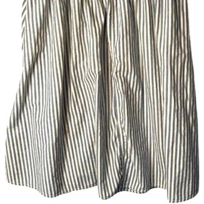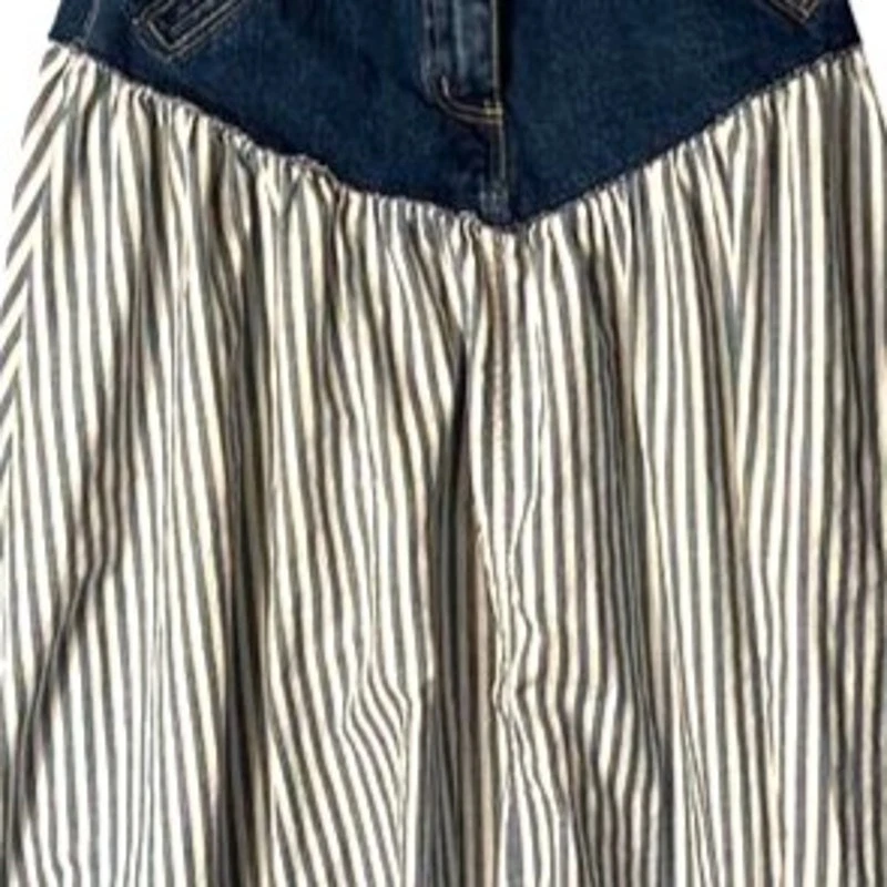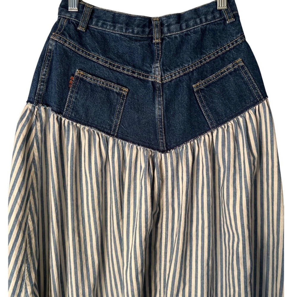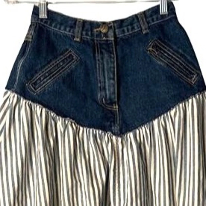 Vintage, please confirm measurements 26" waist 35" waist to hem 7" rise excellent condition, no flaws a.b.s. vintage denim skirt ** features a striped pattern of blue & white with solid denim at waist to hips ** bohemian style and full silhouette ** high-quality cotton denim, ** pockets ** zip front with button close, belt loops ** machine washable ** made in the United States ** all items stored in a smoke-free & pet free home