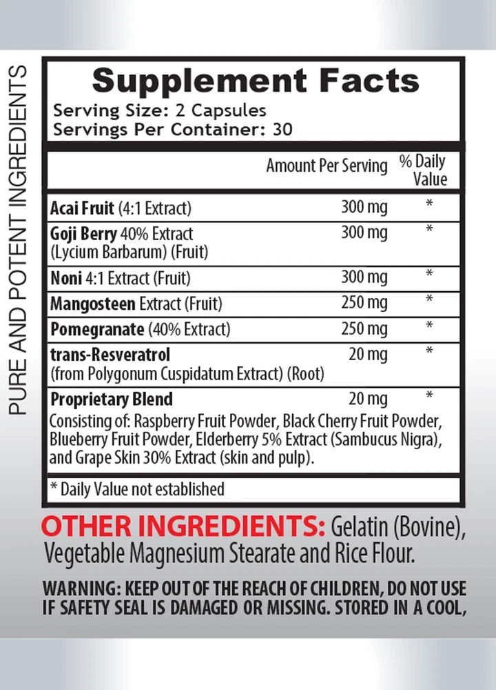 MEGA ANTIOXIDANT COMPLEX with: Acai Berry , Goji Berry , Resveratrol , Mangosteen , Pomegranate , and Noni . Dietary Supplement 3 Bottles 180 Capsules Made in the United States What are Antioxidants? Antioxidants are chemicals that fight a process in your cells called oxidation. The main sources of antioxidants are plant-based foods, but your body makes some, too. You're probably familiar with vitamins C and E, beta-carotene, and the minerals selenium and manganese. Plant nutrients and chemicals like flavonoids, phenols, polyphenols, and phytoestrogens are also antioxidants. Each one works differently. Together they form a team that fights free radicals. These chemicals cause the oxidation process that damages your cells and the genetic material inside them. Your body makes free radicals as it processes food, sunlight, and toxins like smoke, pollution, and alcohol. Antioxidants either stop free radicals before they form or break them down so they're harmless. What is Resveratrol and it's Benefits? Resveratrol is a plant compound that acts like an antioxidant. The top food sources include red wine, grapes, some berries and peanuts. This compound tends to be concentrated mostly in the skins and seeds of grapes and berries. These parts of the grape are included in the fermentation of red wine, hence its particularly high concentration of resveratrol. Resveratrol supplements have been linked to many exciting health benefits, including protecting brain function and lowering blood pressure. Benefits of Goji Berries. Goji berries have a high oxygen radical absorbance capacity (ORAC) score of 3,290. This rating indicates the quantity of antioxidants in certain foods. One study in healthy elderly men and women found that taking a milk-based goji berry drink daily for 90 days increased levels of the antioxidant zeaxanthin by 26 percent and increased overall antioxidant capacity by 57 percent. This is good news, since antioxidants consumed through the diet are thought to be important for health and protection against chronic diseases. Benefits of Acai Berries. Acai berries are a Brazilian "superfruit." They're native to the Amazon region where they're a staple food. However, they've recently gained popularity globally and are praised for being particularly beneficial to health and well-being. Acai berries have an incredibly high amount of antioxidants, edging out other antioxidant-rich fruits like blueberries and cranberries. In the case of acai, 100 grams of frozen pulp has an ORAC of 15,405, whereas the same amount of blueberries has a score of 4,669. This antioxidant activity comes from a number of plant compounds in acai, including anthocyanins. In 2008, researchers gave 12 fasting volunteers acai pulp, acai juice, applesauce or a drink with no antioxidants at four different times and then tested their blood for antioxidants. Both the acai pulp and applesauce raised participants' antioxidant levels, which means that the antioxidant compounds in acai are well-absorbed in the gut. Supplement Facts Serving Size: 2 Capsules Servings per Container: 30 Acai Fruit (4:1 Extract) - 300mg Goji Berry 40% Extract (fruit) - 300mg Noni 4:1 Extract (fruit) - 300mg Mangosteen Extract (fruit) - 250mg Pomegranate (40% Extract) - 250mg Trans-Resveratrol - 20mg (from Polygonum Cuspidatum Extract)(root) Proprietary Blend - 20mg Consisting of: Raspberry Fruit Powder, Black Cherry Fruit Powder, Blueberry Fruit Powder, Elderberry 5% Extract(Sambucus Nigra), and Grape SKin 30% Extract(skin and pulp). OTHER INGREDIENTS: Gelatin(Bovine), Vegetable Magnesium Stearate, and Rice Flour. WARNING: KEEP OUT OF REACH OF CHILDREN. DO NOT USE IF SAFETY SEAL IS DAMAGED OR MISSING. STORE IN A COOL, DRY PLACE. *These statements have not been evaluated by the FDA. This product is not intended to diagnose, cure, treat, or prevent any disease. GREAT QUALITY SUPPLEMENTS
